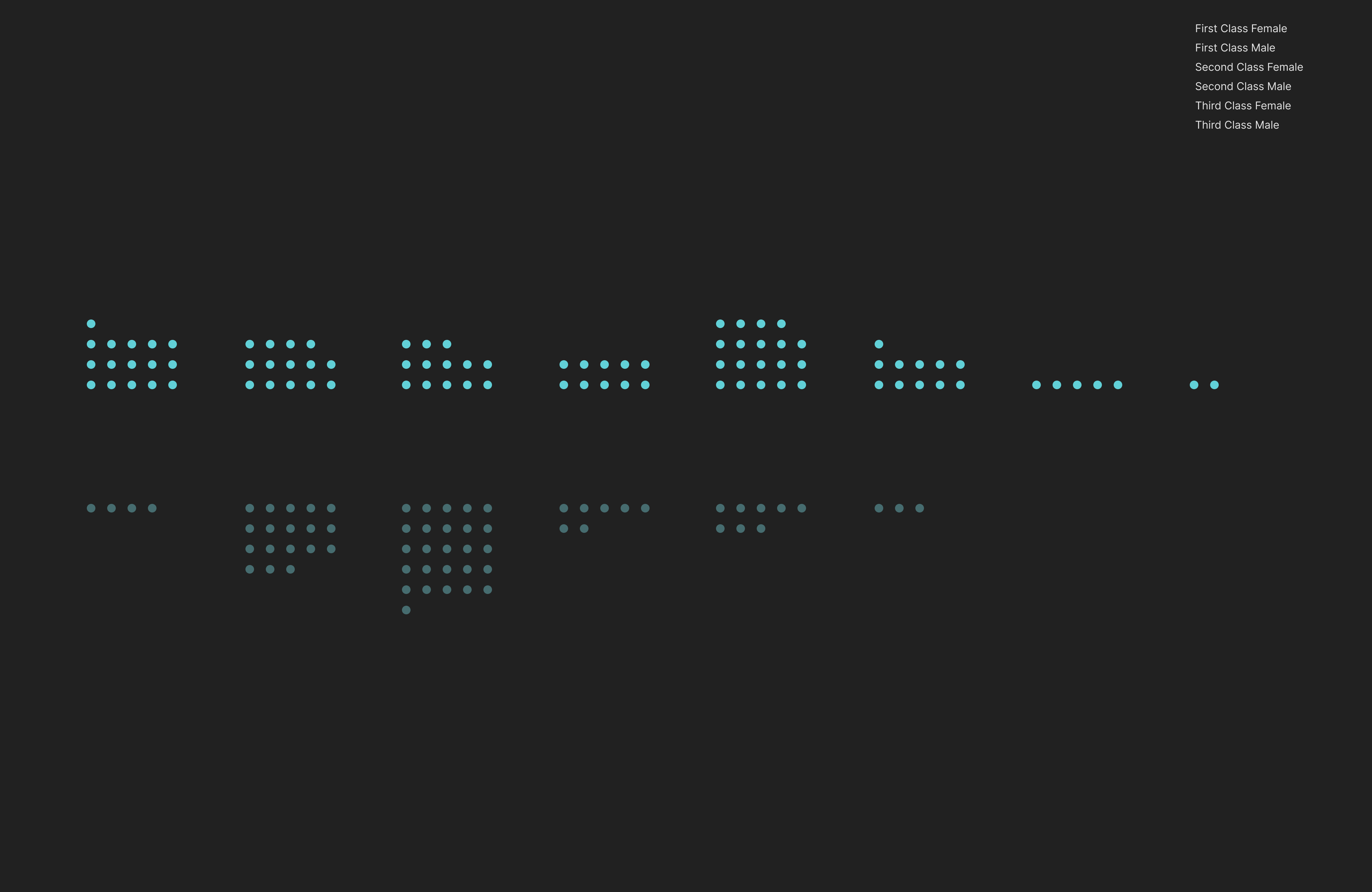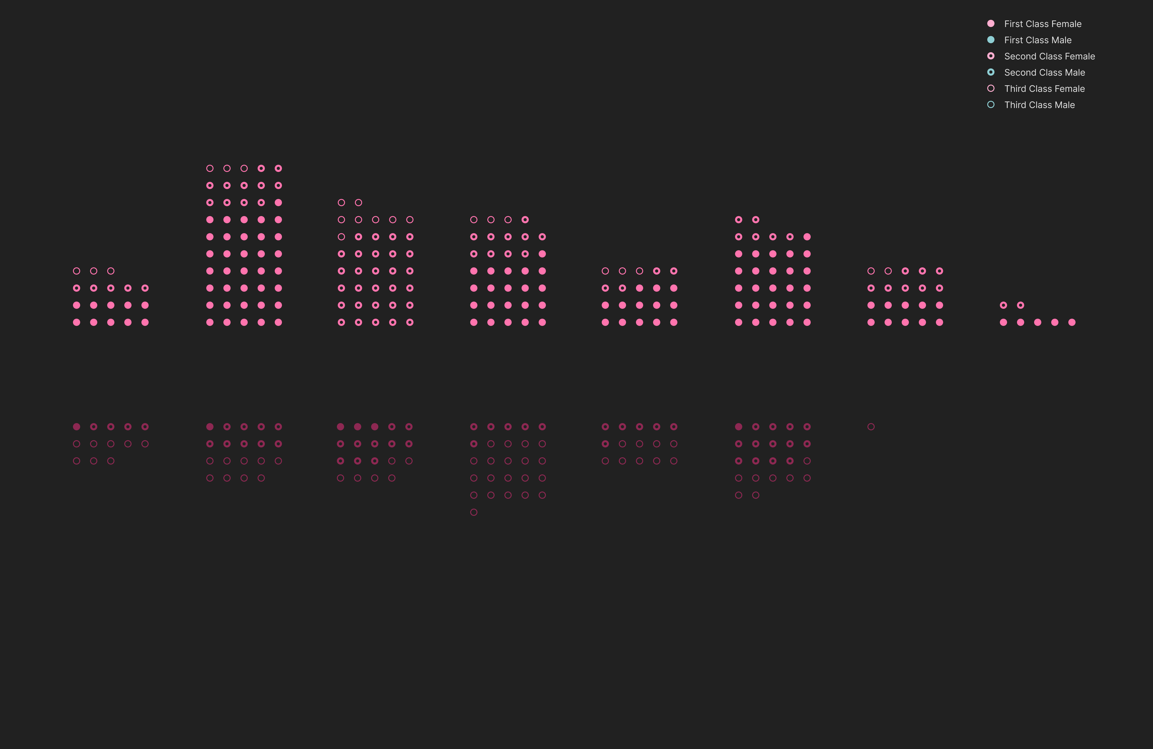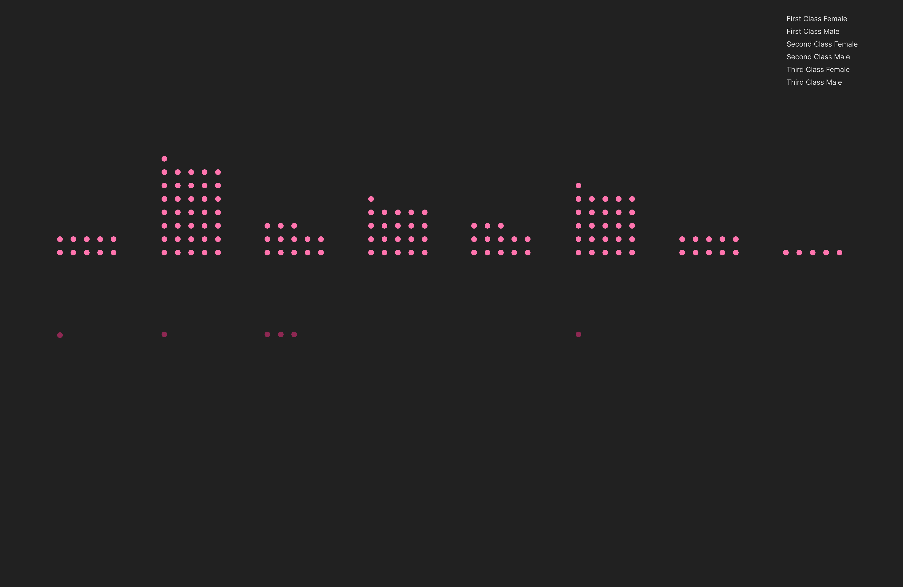 Durch die Farbe der Punkte soll direkt die Information über das Geschlecht vermittelt werden. Zudem sollten die Farben je nach Überlebensstatus variieren; so haben die Punkte verstorbener Passagiere eine etwas dunklere Farbe.