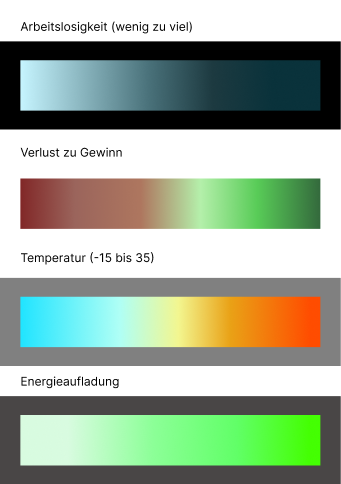 In der nächsten Übung sollten wir vier Farbskalen erstellen. Bei drei davon war das Thema vorgegeben, bei der Vierten konnten wir ein frei wählbares Thema wählen. Das erste Thema war Arbeitslosigkeit. Das Ziel war es, einen Verlauf von niedriger zu hoher Arbeitslosigkeit darzustellen. Der Hintergrund sollte dabei schwarz sein. Beim zweiten Verlauf war das Ziel, Verlust zu Gewinn darzustellen, jedoch auf einem weißen Hintergrund. Der dritte Verlauf sollte die Temperatur von -15°C bis 35°C auf einem grauen Hintergrund zeigen. Für das frei wählbare Thema habe ich die Energieaufladung von leer zu voll gewählt, was auf einem dunkelgrauen Hintergrund platziert wurde.