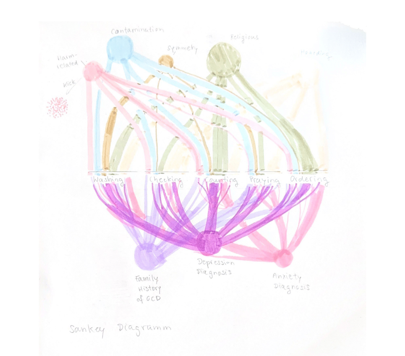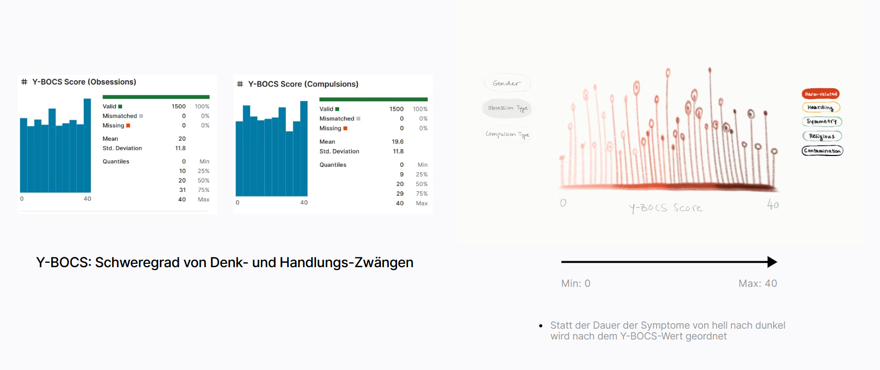 In diesem Diagramm wird zudem ein neuer Wert, der Y-BOCS Score, hinzugefügt. Dieser Wert steht für den Schweregrad von Denk- und Handlungszwängen. Statt der Dauer der Symptome wird hier die Darstellung von hell nach dunkel nun nach dem Y-BOCS-Wert geordnet.