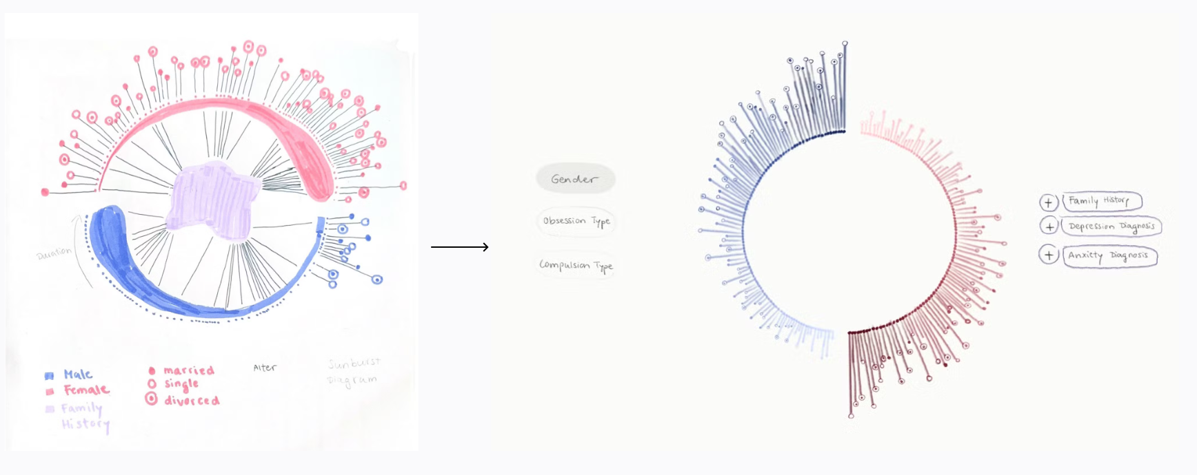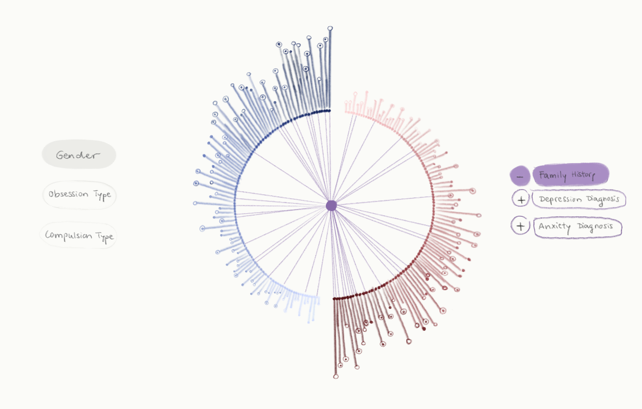 Bei der Weiterentwicklung der Entwürfe habe ich mich stärker auf geometrische Formen konzentriert und die organischen Formen weggelassen. Die organischen Formen in der vorherigen Variante sollten ursprünglich die Zunahme der Symptome über die Zeit darstellen. Um diese Darstellung dennoch beizubehalten, habe ich stattdessen einen Farbverlauf von hell zu dunkel verwendet, um die Steigerung der Symptome visuell zu verdeutlichen.