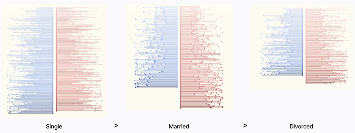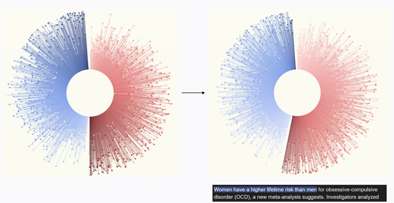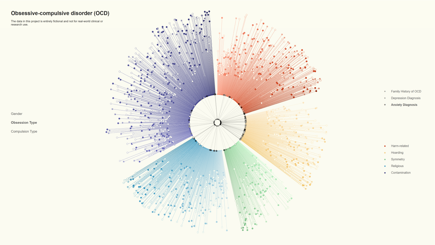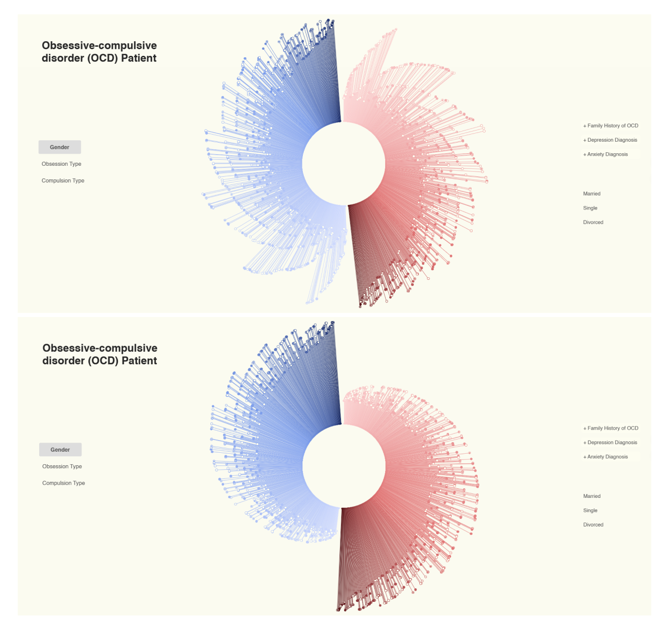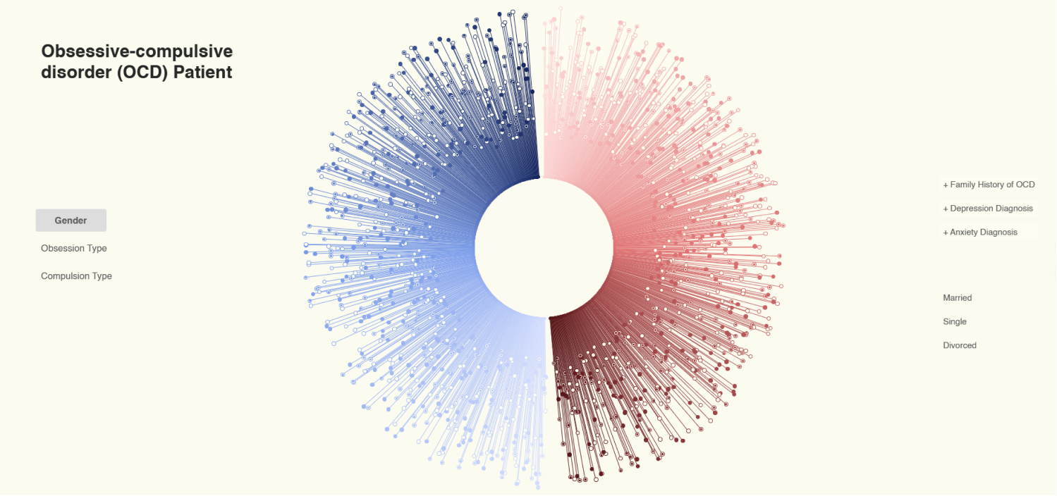 Hier ist die Darstellung, die ich ursprünglich erreichen wollte. Dennoch war der Anteil der dargestellten Daten zu gleichmäßig verteilt. Um dies zu verbessern, habe ich recherchiert, ob es einen signifikanten Unterschied zwischen den Geschlechtern bei der Häufigkeit von Zwangsstörungen gibt. Auf Basis dieser Erkenntnisse habe ich die Visualisierung angepasst, um die Unterschiede zwischen Frauen und Männern deutlicher darzustellen.