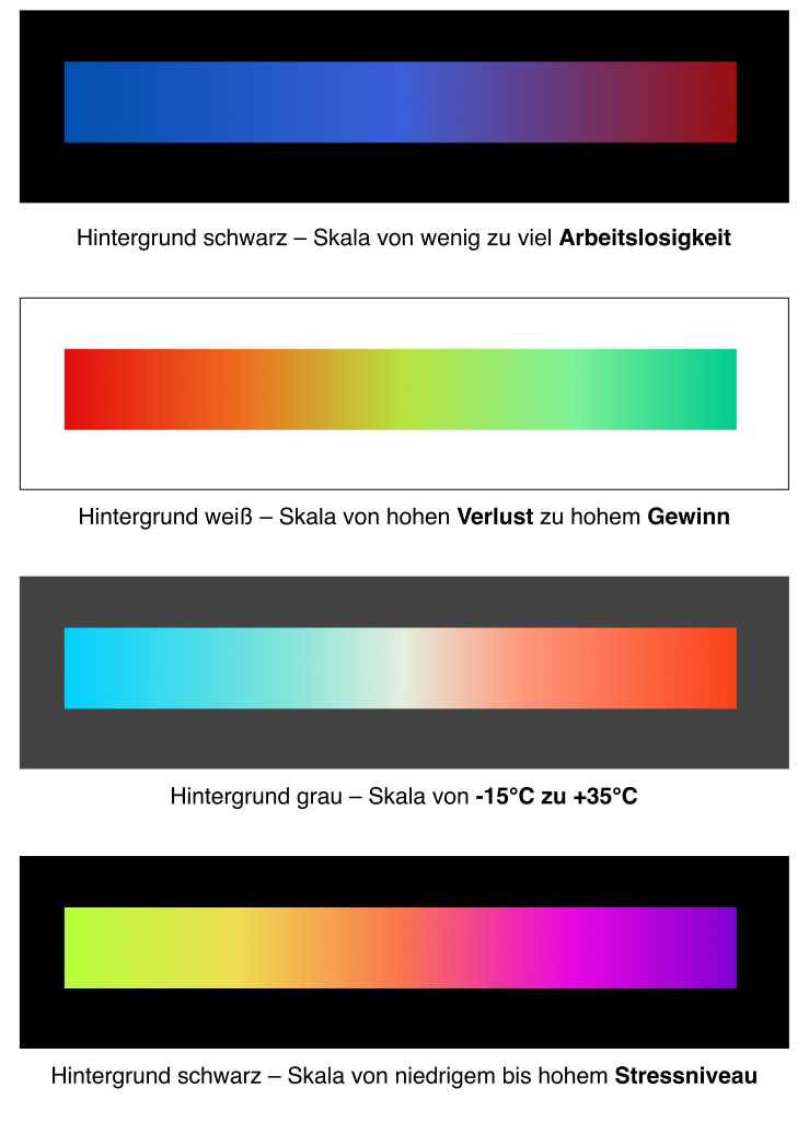 Dann sollten wir Farbskalen bzw. Farbverläufe für die folgenden Themen erstellen: