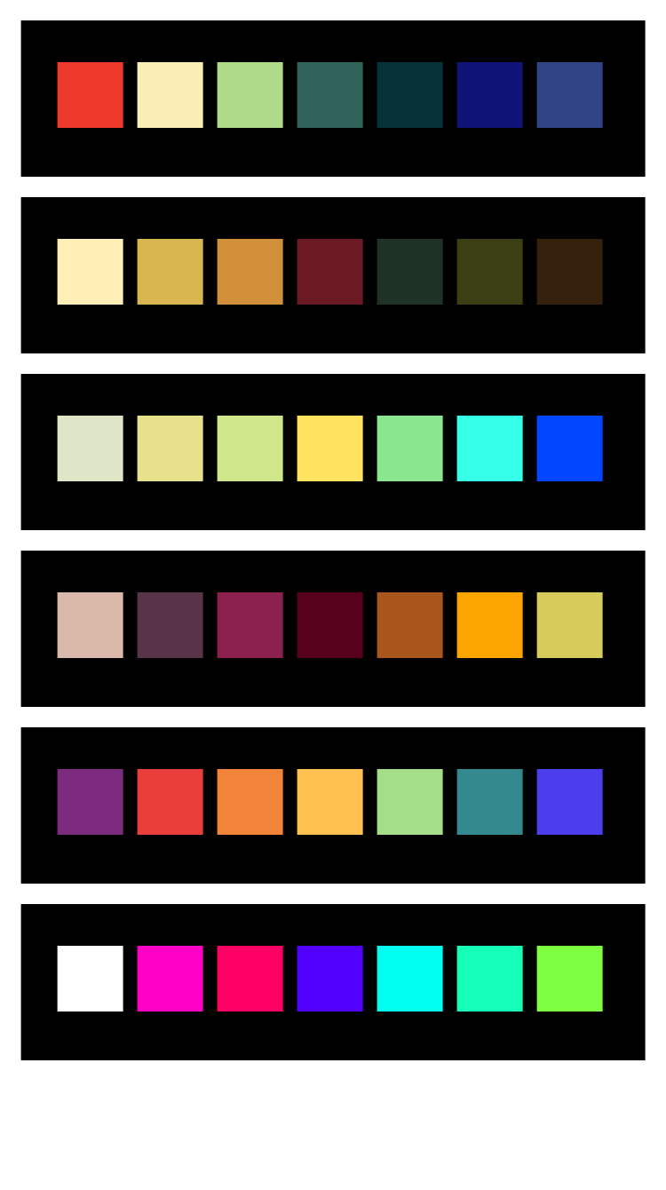 Wir sollten auf einem schwarzen Hintergrund eine Sammlung von sieben Farben erstellen. Diese Farben sollten gut unterscheidbar sein und ein harmonisches Gesamtbild ergeben, wobei jede Farbe gleichwertig zur Geltung kommen sollte.