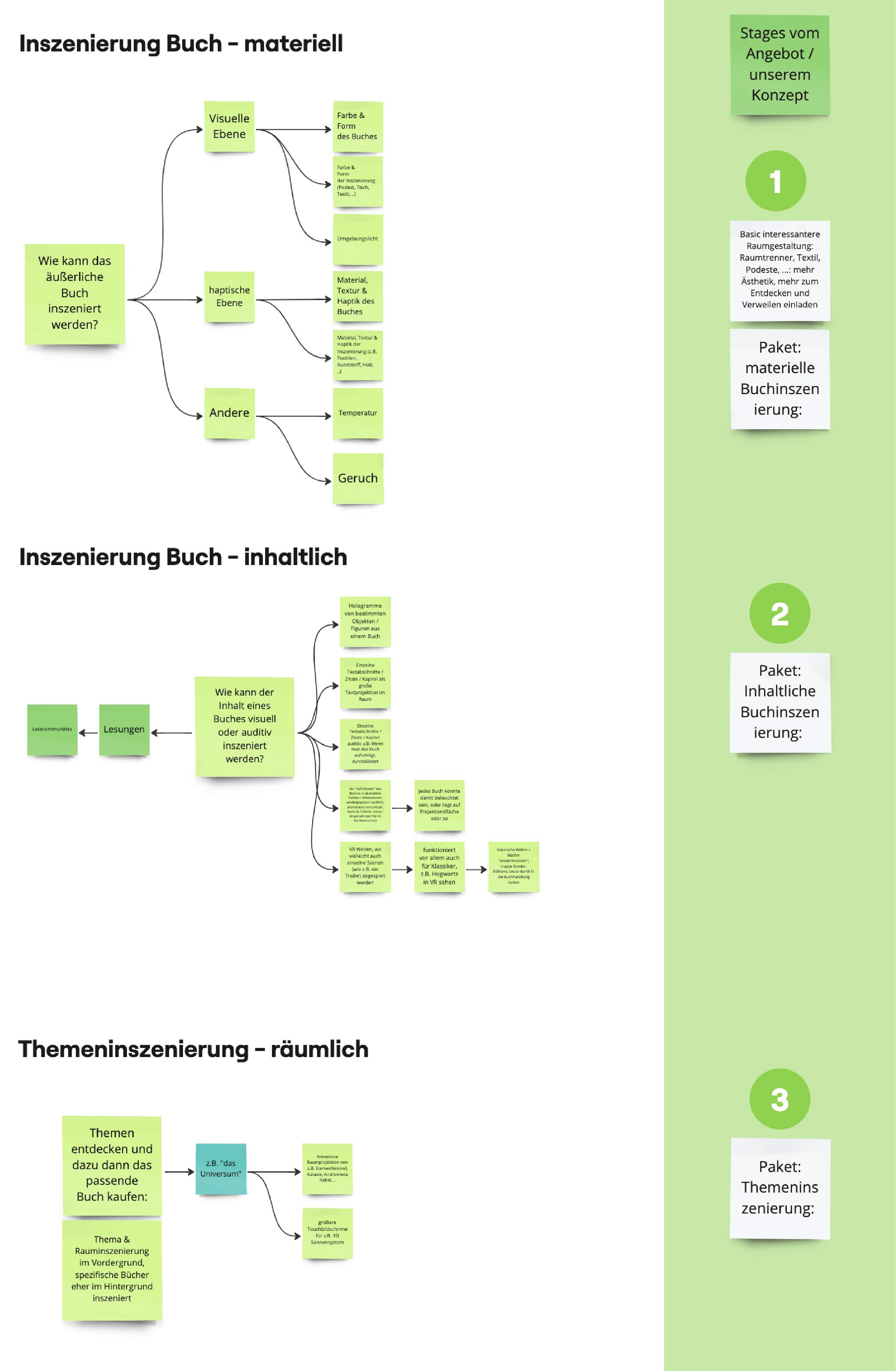 In Bezug auf unseren Ansatz gingen wir mehr in die Tiefe der Wahrnehmung und Erlebnisses von Kund:innen im Buchhandel und sammelten verschiedene Ideen, auf welche Arten und Weisen man Bücher inhaltlich und äußerlich ansprechend inszenieren kann und den Einkauf in einer Buchhandlung zum Erlebnis machen kann. Hier legten wir auch einen Fokus auf technologische Möglichkeiten in der Zukunft, wie z.B. immersive Projektionen, AR und VR Inhalte und Hologramme. Daraus ließ sich ein Konzept herausleiten, welches sich in drei Ebenen aufgliedert: Die allgemeine Raumgestaltung, welche die äußerliche Inszenierung der Bücher mit einschließt und außerdem zum Entdecken und Verweilen einladen soll, dann die inhaltliche Inszenierung eines Buches durch z.B. visuelle und auditive mittel und als dritter Aspekt eine thematische Inszenierung durch ein immersives Erlebnis, wodurch Kund:innen weitere Bücher zum passenden Thema entdecken können.