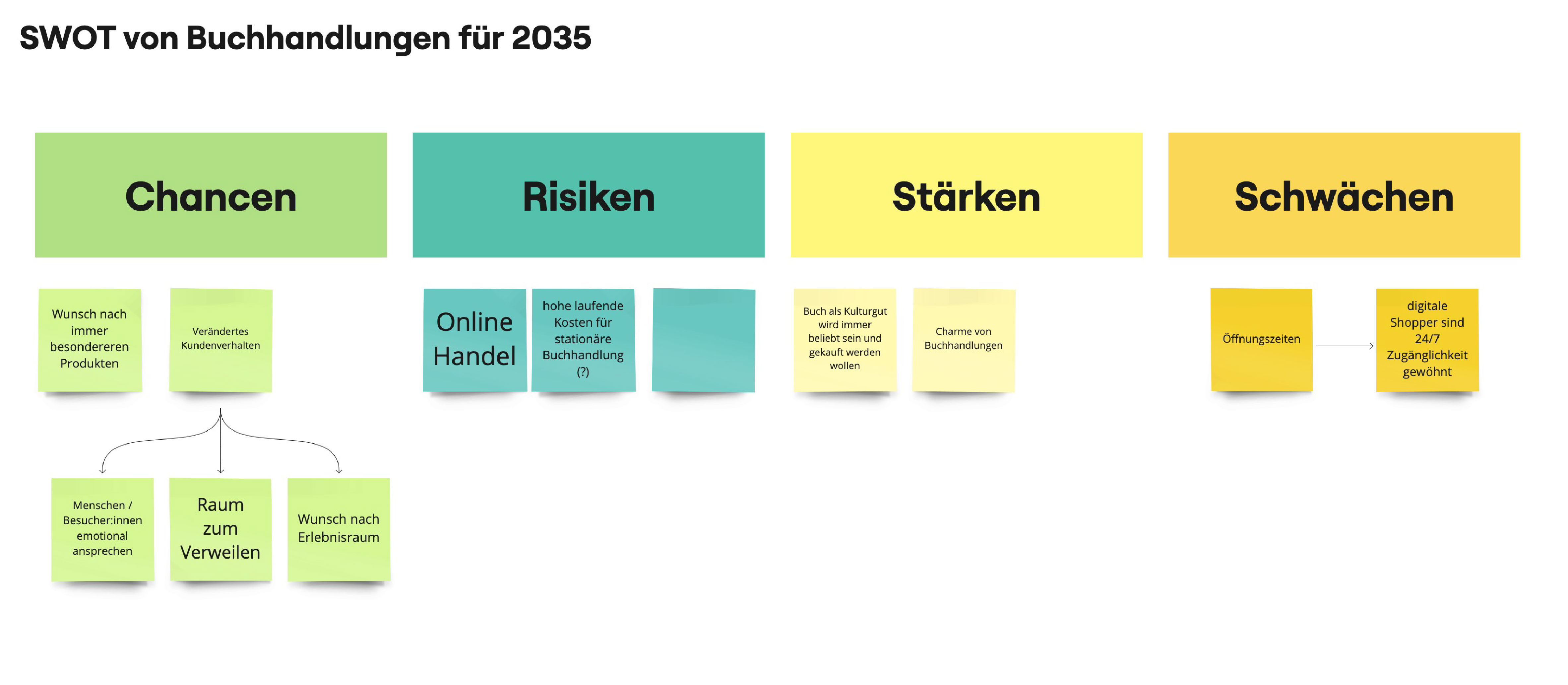 Darauf aufbauend formulierten wir kurz und knapp die Hauptchancen, Risiken, Stärken und Schwächen von Buchhandlungen im Kontext des Jahres 2035. Das half uns, die Möglichkeiten sowie Grenzen der Zukunft des Buchhandels aus einer größeren Perspektive zu betrachten. Vor allem die Chancen haben sich aus unserer vorangegangenen Recherche klar herauskristallisiert, sodass wir hier einen guten Ansatz und Hebel definieren konnten, was essenzielle Punkte für unser Konzept sein werden.