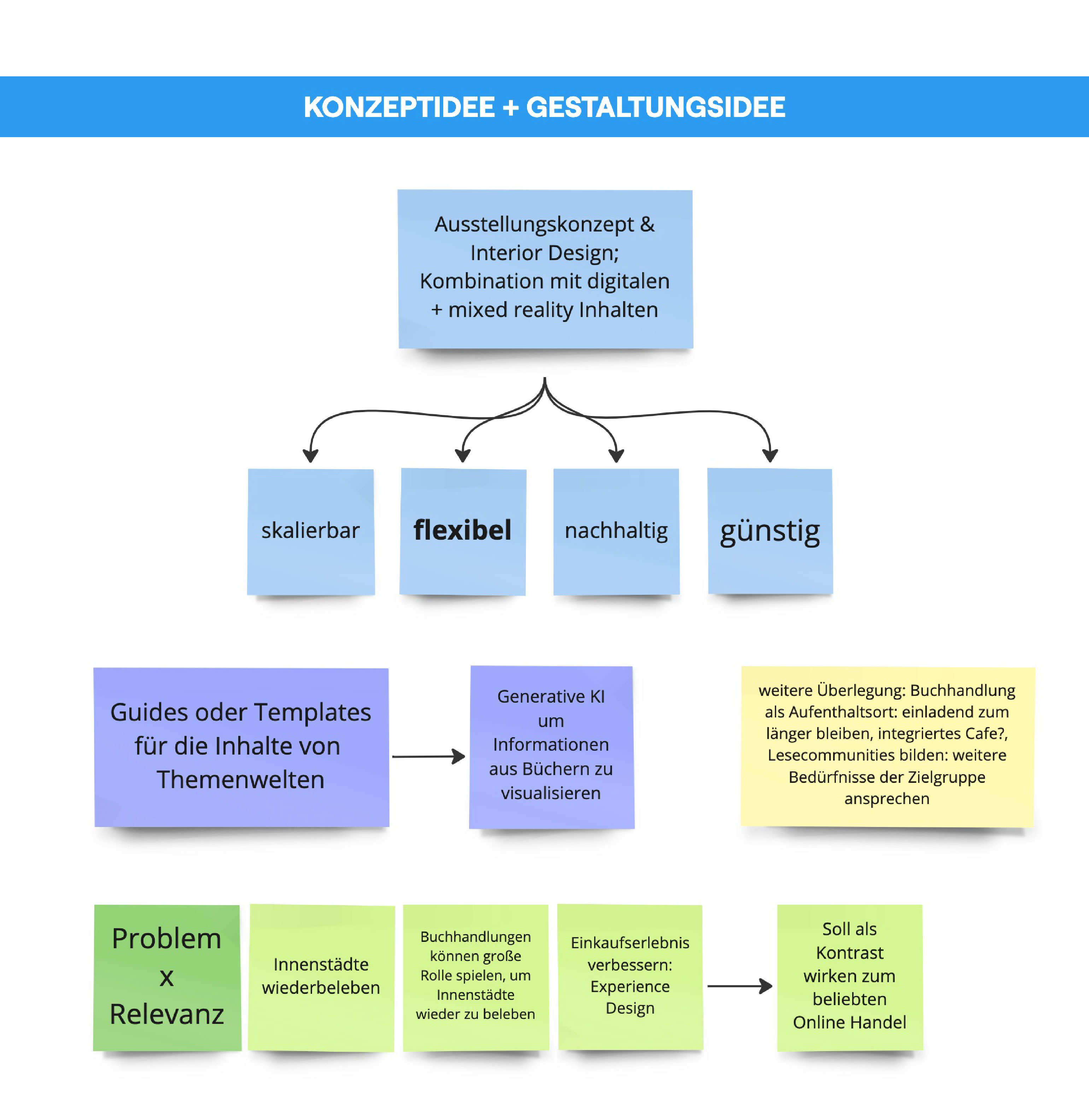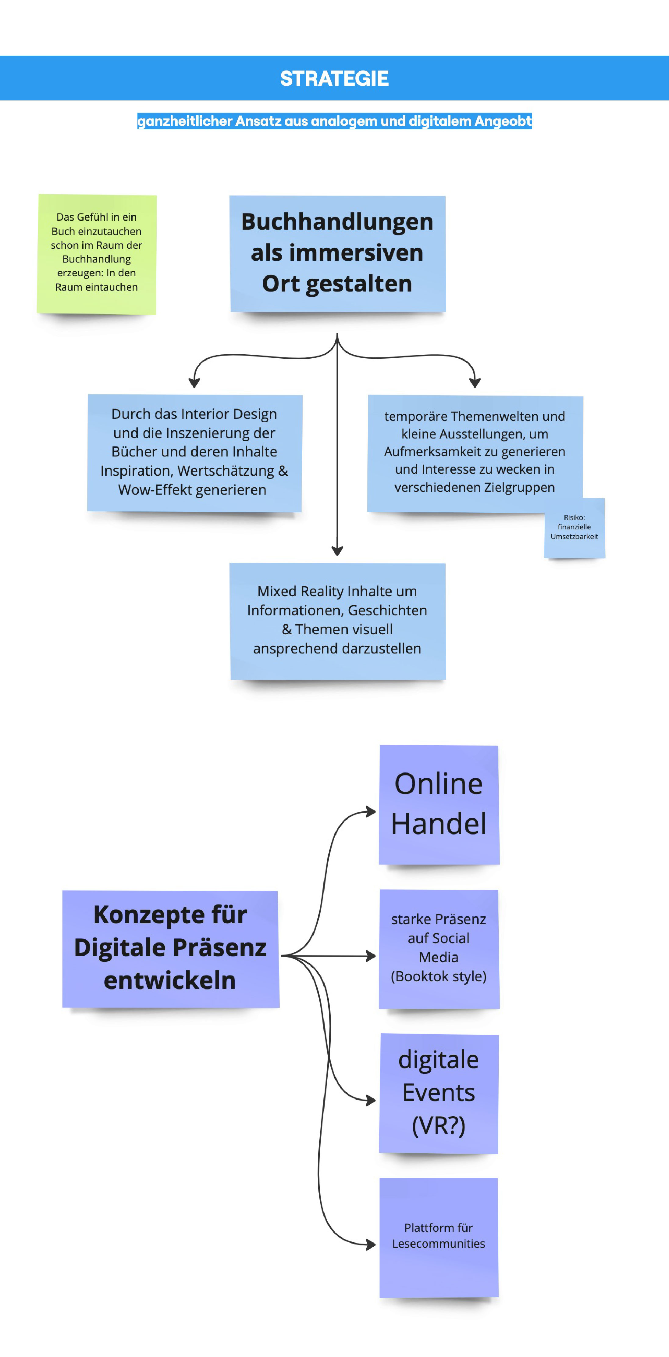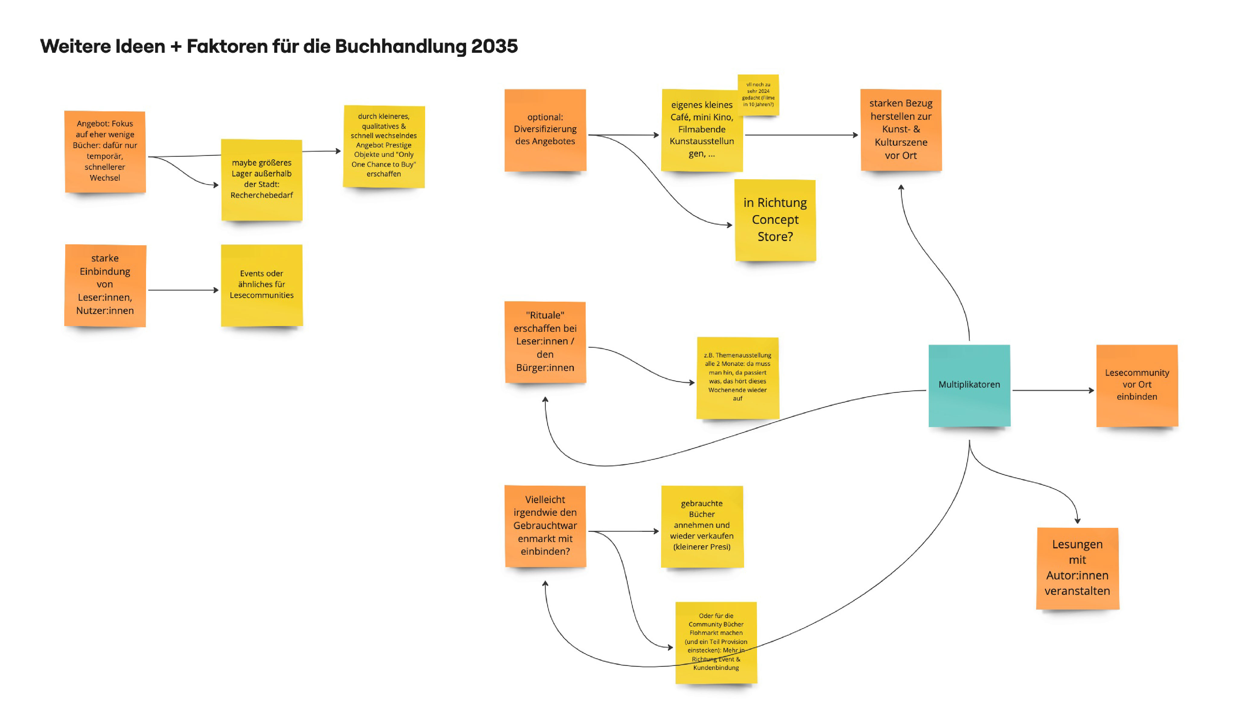 Somit definierten wir neben unseren bestehenden Ideen des Raumerlebnis und Buchinszenierungen weitere Faktoren, die sich vor allem auf die Einbindung der Kund:innen, Leser:innen und der vor Ort vorhandenen Community beziehen. Dadurch kann eine ganzheitliche Ausrichtung der Buchhandlung auf die Zukunft geschaffen werden, die über Raumgestaltung hinaus geht und durch Multiplikatoren die Buchhandlung zu einem wichtigen Kulturtreffpunkt in Städten etabliert.