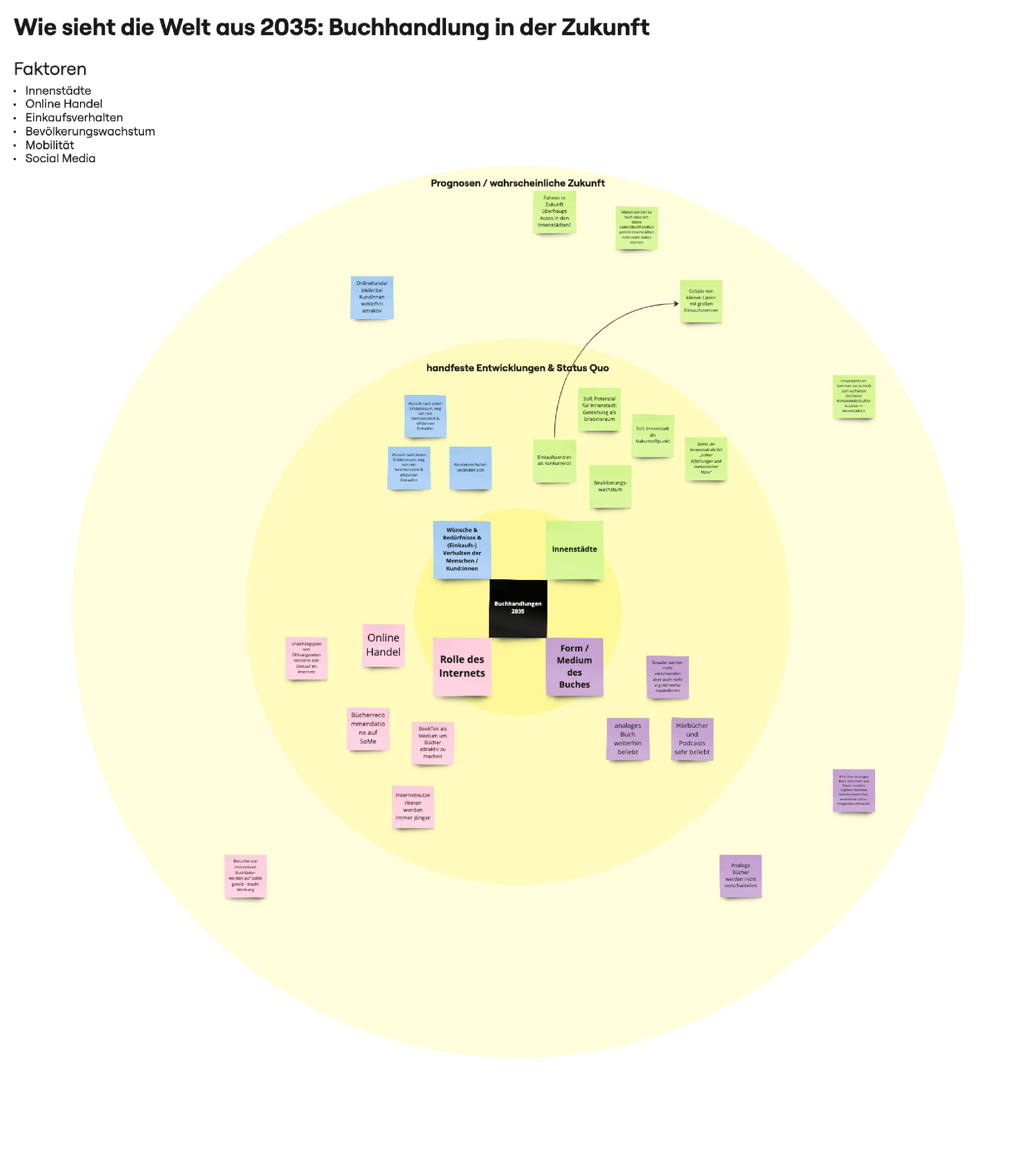 Basierend auf vorangegangener Recherche definierten wir die Hauptfaktoren und Einflüsse, wie die Welt rund um den stationären Buchhandel aussieht und wie sie sich weiterentwickeln wird. Die Bereiche, die unserer Meinung eine große Rolle für die Zukunft des stationären Buchhandels spielen sind die Entwicklung der Innenstädte, die Rolle des Internets, die Form / das Medium des Buches und die Bedürfnisse und das Kaufverhalten der Kund:innen.