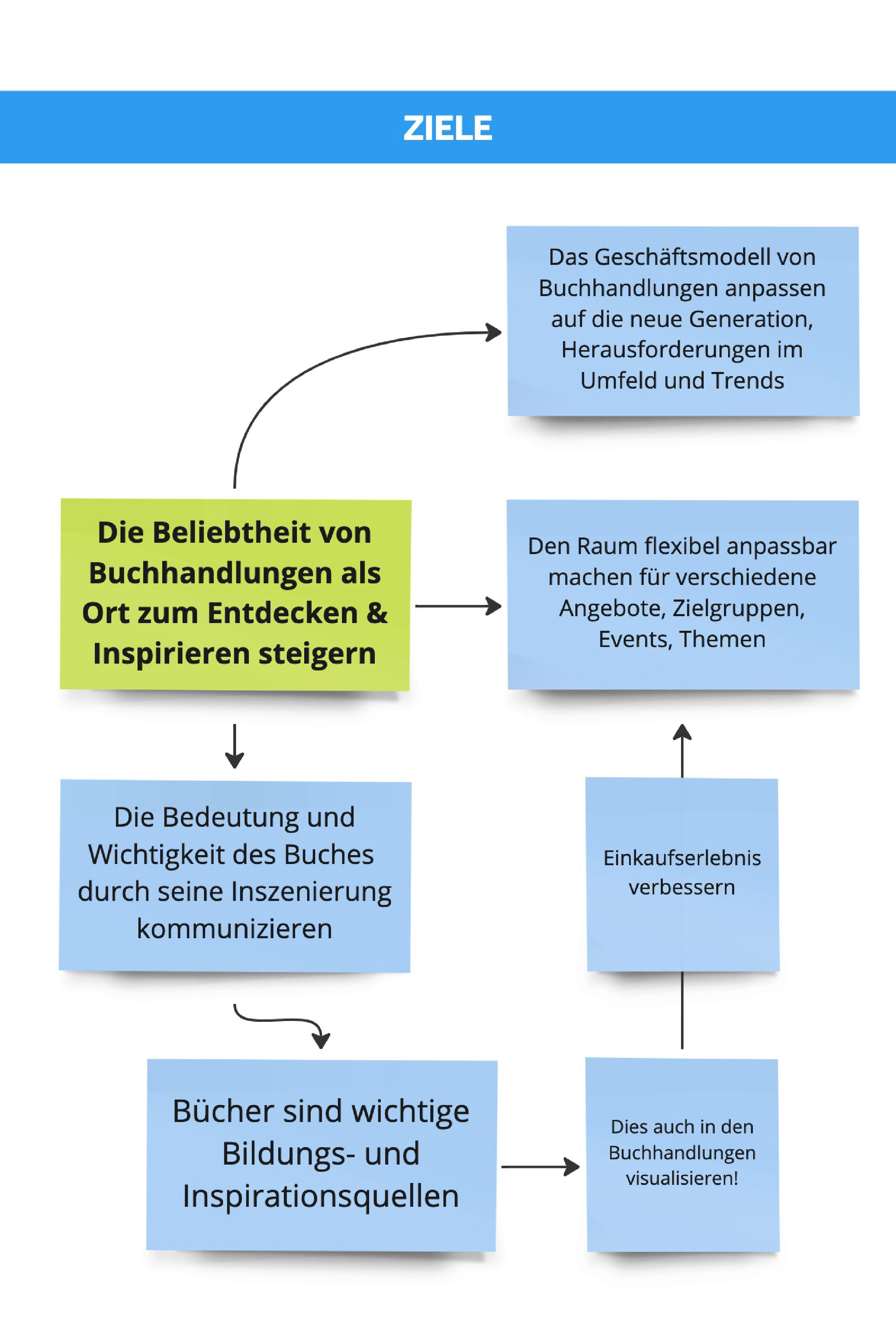 Durch die Einblicke aus dem Workshop sowie unsere Recherche der Schlüsselfaktoren und Erarbeitung der Zukunftsszenarien sahen wir die Zukunft der stationären Buchhandlungen als einen großen Hebel, die Zukunft der Buchbranche zu beeinflussen sowie einen großen Bedarf im stationären Buchhandel, sich zukunftsorientiert neu aufzustellen, sowohl durch die Buchinszenierung und Raumgestaltung als auch durch ein zukunftsorientiertes Geschäftsmodell.