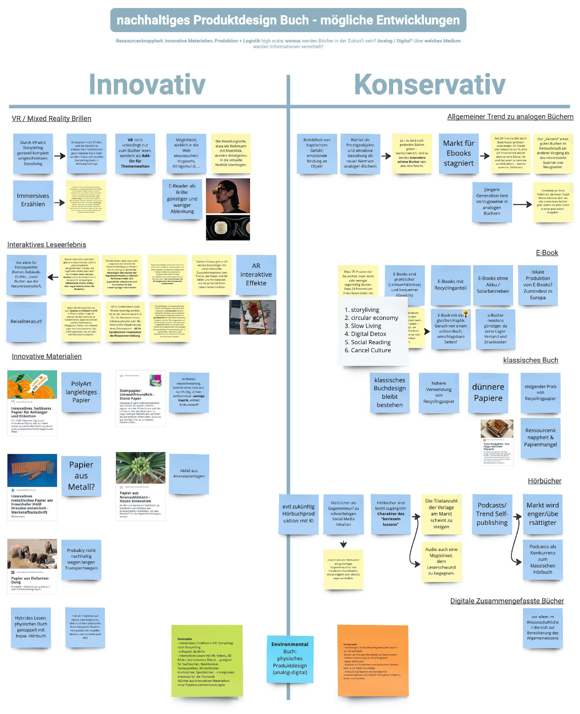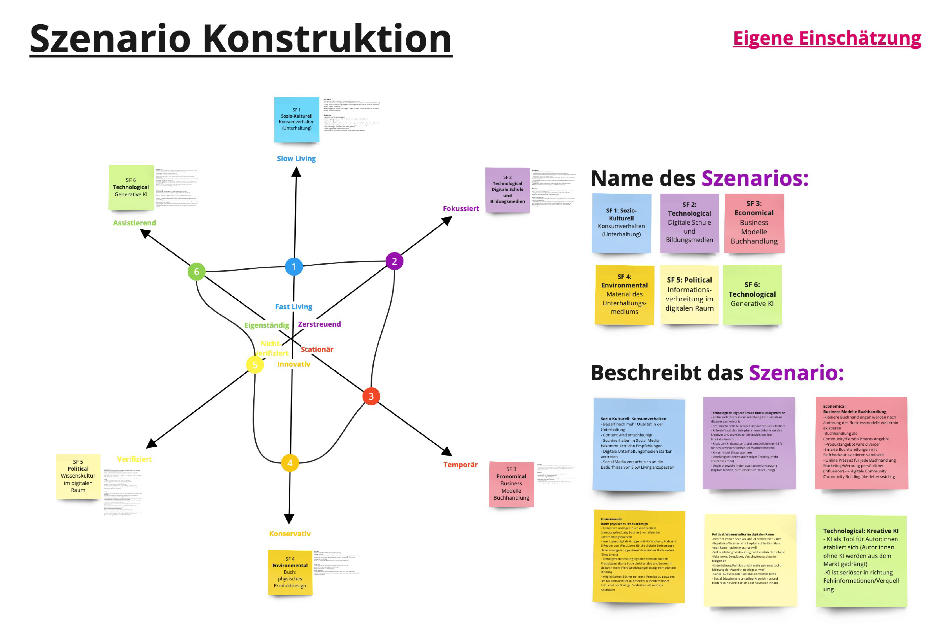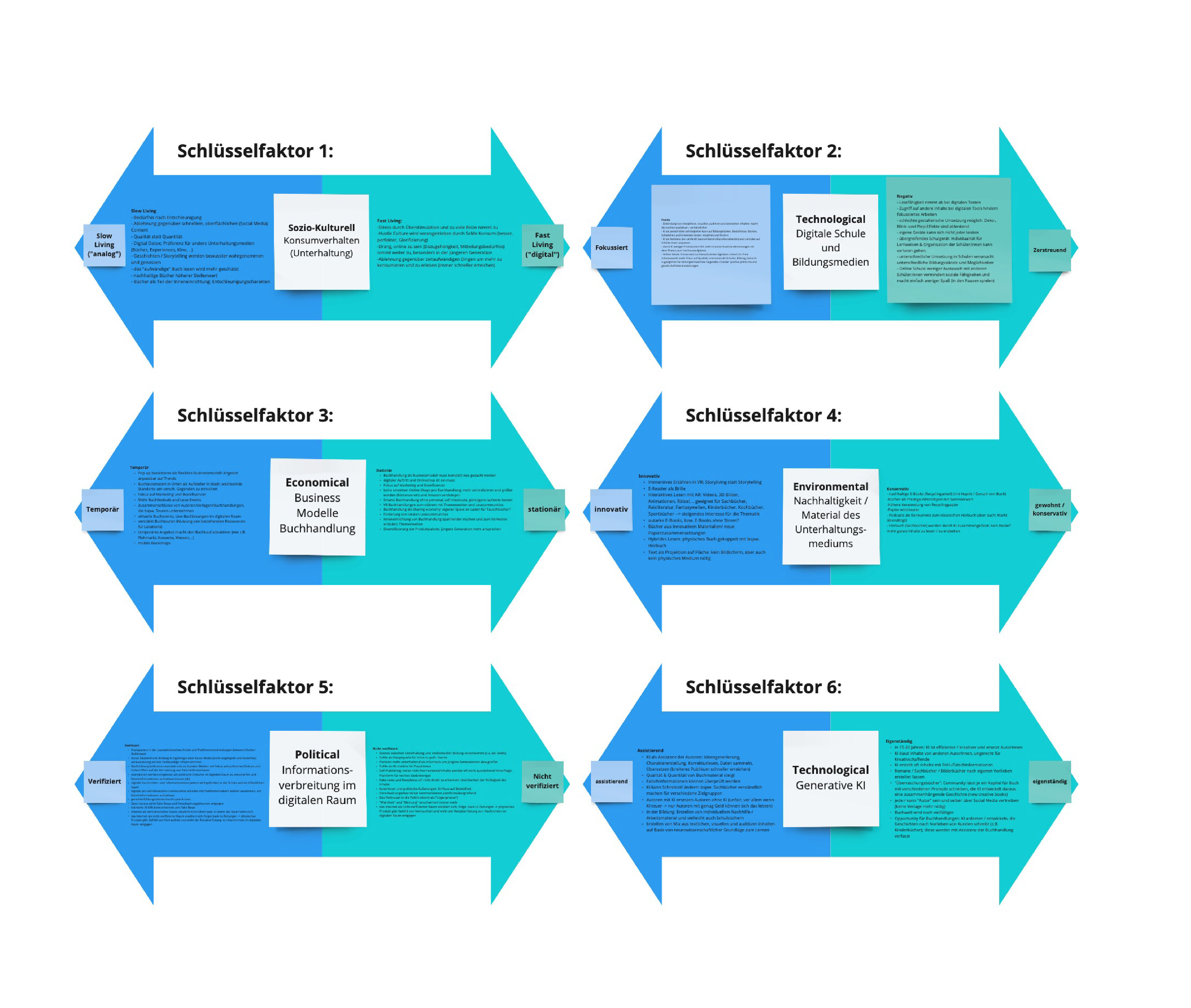 Daraufhin bildeten wir unsere finalen Gruppen für das Gestaltungsprojekt. Im nächsten Schritt definierten wir zu zweit, welche der Faktoren und Trends aus der STEEP-Recherche unserer Meinung nach Schlüsselfaktoren für die Beeinflussung der Zukunft der Buchbranche darstellen. Aus unserer Perspektive spielen das Konsumverhalten (sozio-kulturell), die Digitale Schule und Bildugsmedien (technologisch), der Aufbau von Geschäftsmodellen von Buchhandlungen (ökonomisch), die Nachhaltigkeit / das Material vom Unterhaltungsmedium Buch (ökologisch), die Informationsverbreitung im digitalen Raum (politisch) und der Einsatz und Möglichkeiten von Generativer KI (technologisch) interessante Schlüsselrollen, wenn man die Zukunft der Buchbranche und Lesekultur betrachtet. Um die Auswirkungen der Schlüsselfaktoren einschätzen zu können, begannen wir eine tiefere Recherche in die verschiedenen Bereiche und lagen fest, in welche Richtungen sich die jeweiligen Schlüsselfaktoren in der Zukunft bewegen könnten.