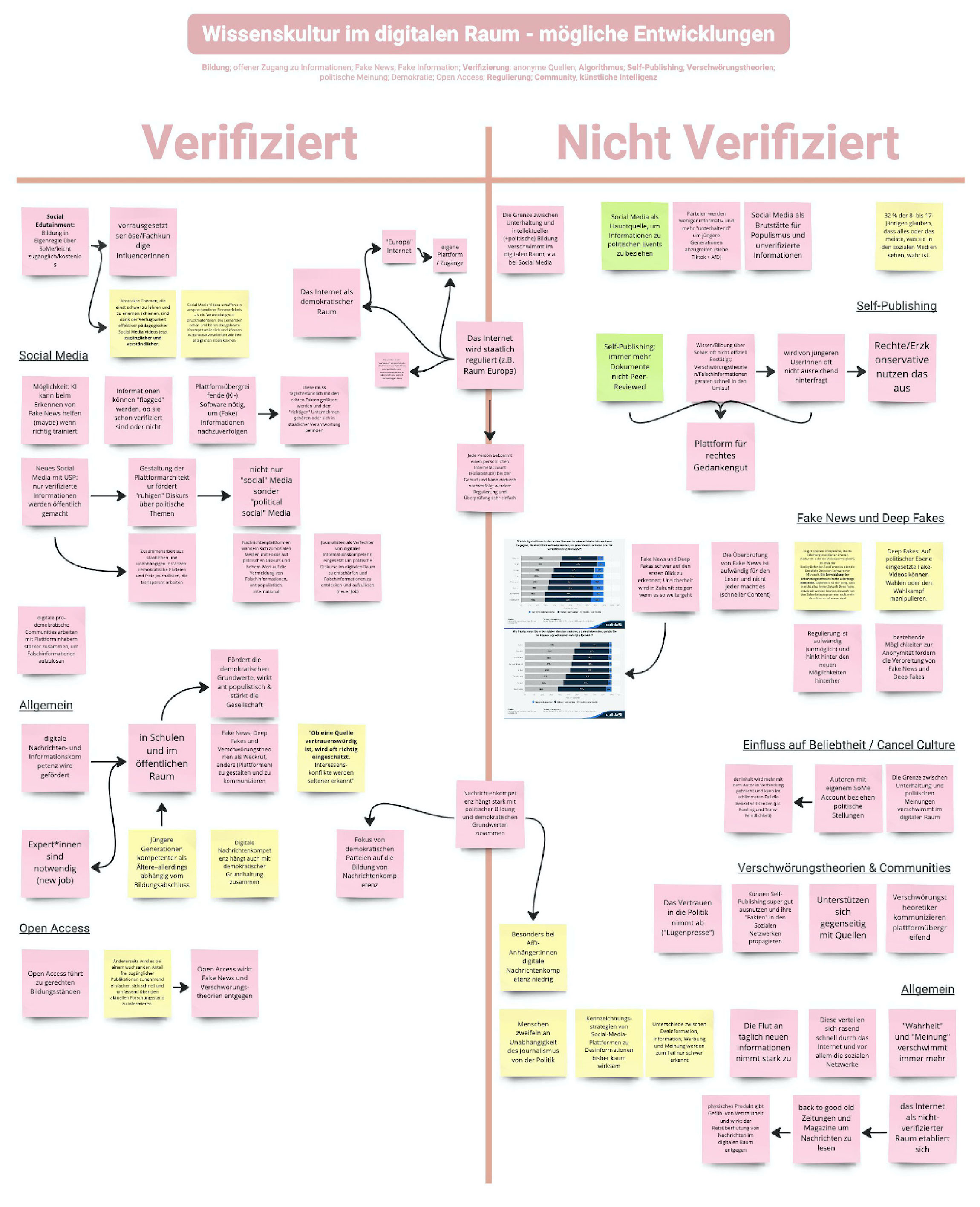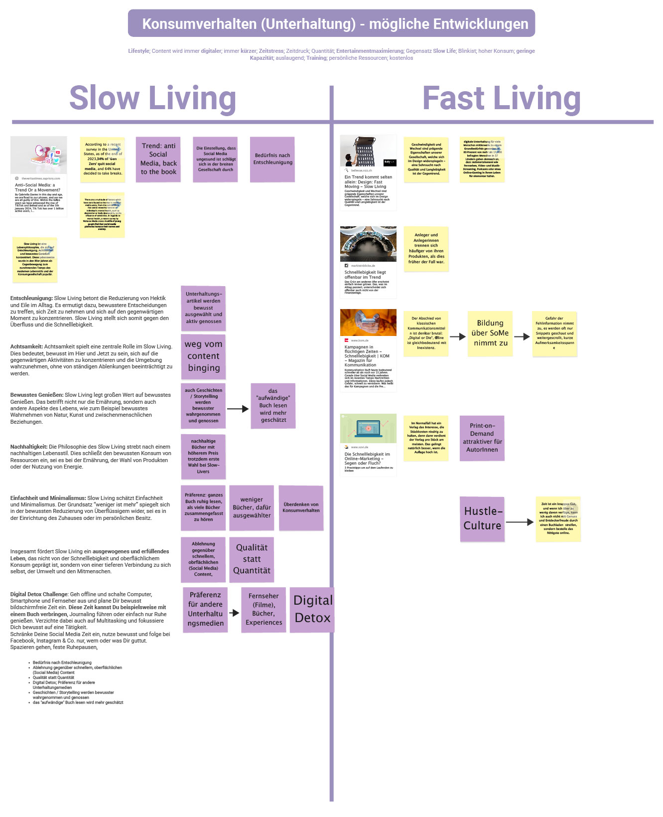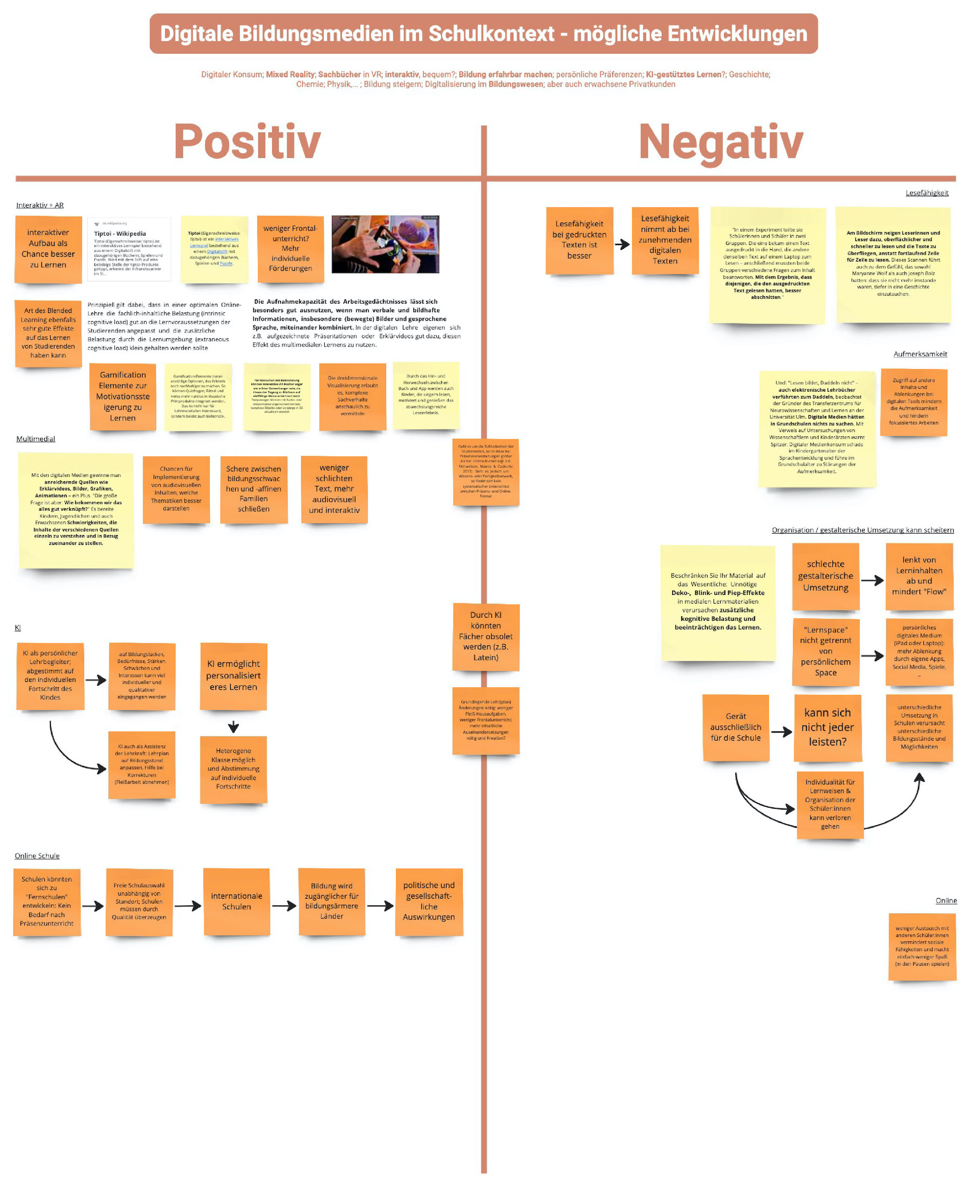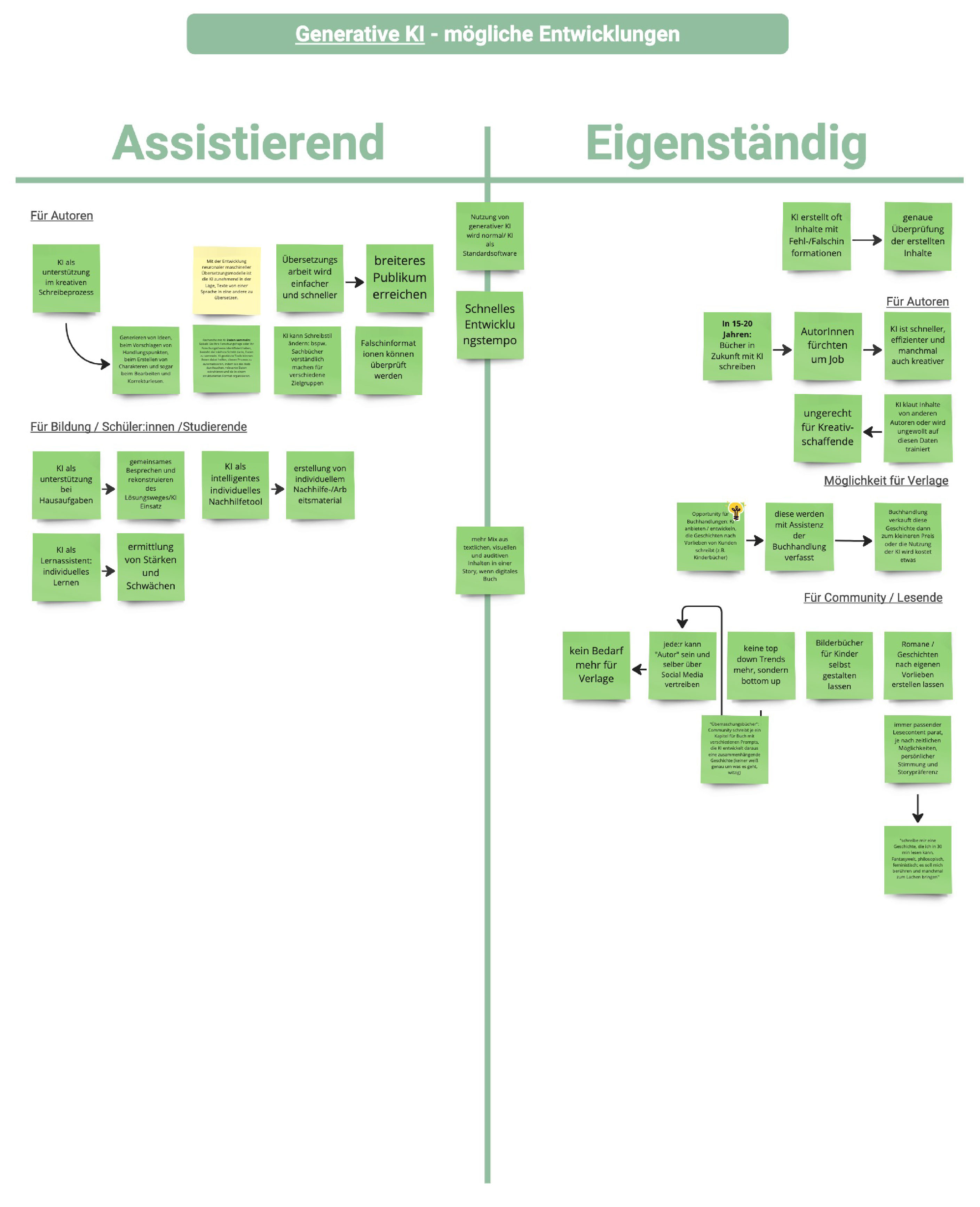 Daraufhin bildeten wir unsere finalen Gruppen für das Gestaltungsprojekt. Im nächsten Schritt definierten wir zu zweit, welche der Faktoren und Trends aus der STEEP-Recherche unserer Meinung nach Schlüsselfaktoren für die Beeinflussung der Zukunft der Buchbranche darstellen. Aus unserer Perspektive spielen das Konsumverhalten (sozio-kulturell), die Digitale Schule und Bildugsmedien (technologisch), der Aufbau von Geschäftsmodellen von Buchhandlungen (ökonomisch), die Nachhaltigkeit / das Material vom Unterhaltungsmedium Buch (ökologisch), die Informationsverbreitung im digitalen Raum (politisch) und der Einsatz und Möglichkeiten von Generativer KI (technologisch) interessante Schlüsselrollen, wenn man die Zukunft der Buchbranche und Lesekultur betrachtet. Um die Auswirkungen der Schlüsselfaktoren einschätzen zu können, begannen wir eine tiefere Recherche in die verschiedenen Bereiche und lagen fest, in welche Richtungen sich die jeweiligen Schlüsselfaktoren in der Zukunft bewegen könnten.