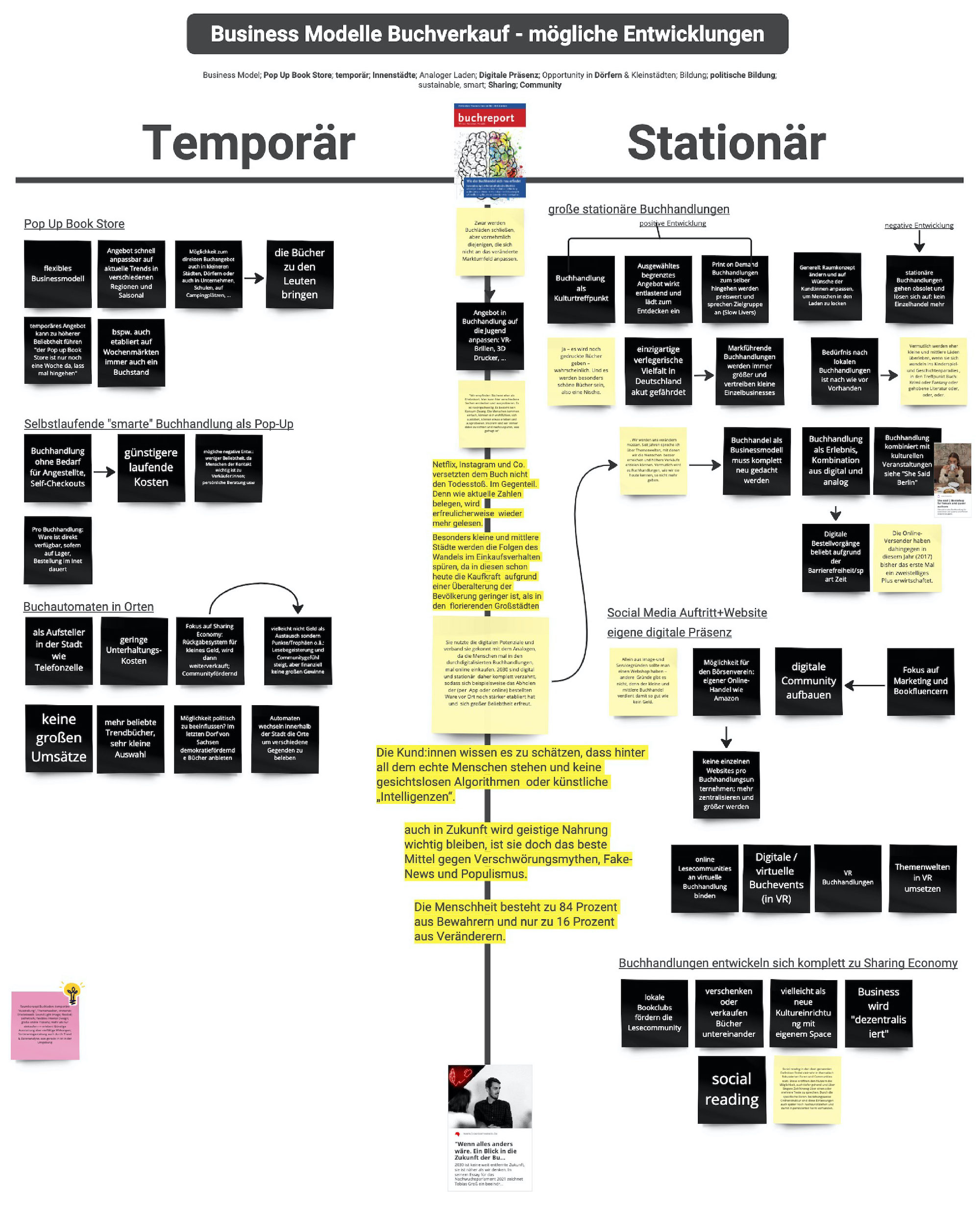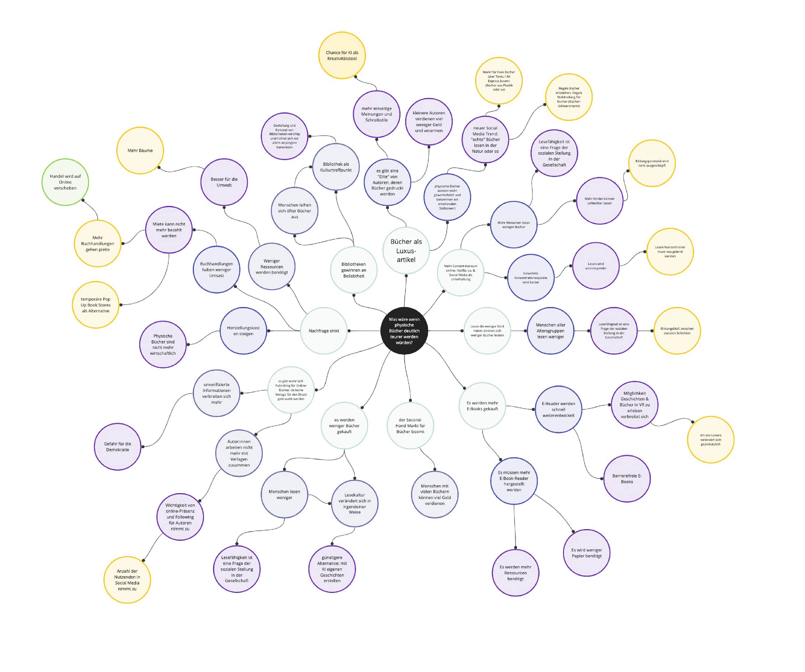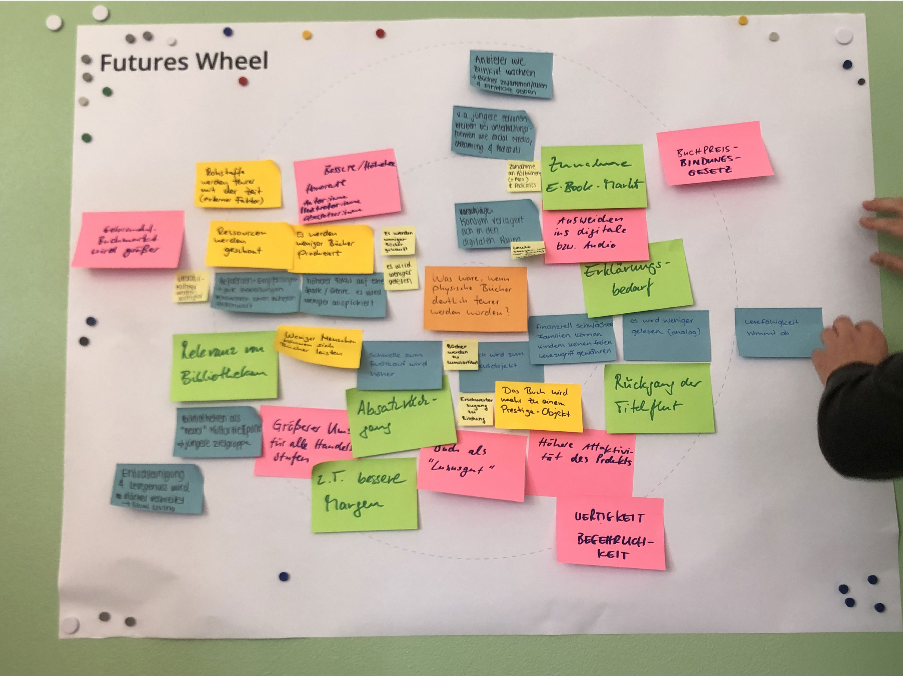 Für die Kooperation des Gestaltungsprojektes mit dem Börsenverein des Deutschen Buchhandels war ein Workshop in deren Hauptsitz in Frankfurt vorgesehen. Dafür teilten wir uns in insgesamt drei Teams auf und erarbeiteten im Vorhinein “Was wäre, wenn .. ” Fragen und ein Futures Wheel, sodass erste Anregungen und Inhalte schon beim Eintreffen in Frankfurt vorhanden waren. Im gezeigten Bild findet sich eine Sammlung von “Was wäre, wenn ..” Fragen, die wir zu zweit erarbeitet haben, sowie ein Futures Wheel mit der Aussagenfrage: “Was wäre, wenn physische Bücher deutlich teurer werden würden?”, welche wir in Zusammenarbeit mit Marc Schade und Adrian Jans erstellten.