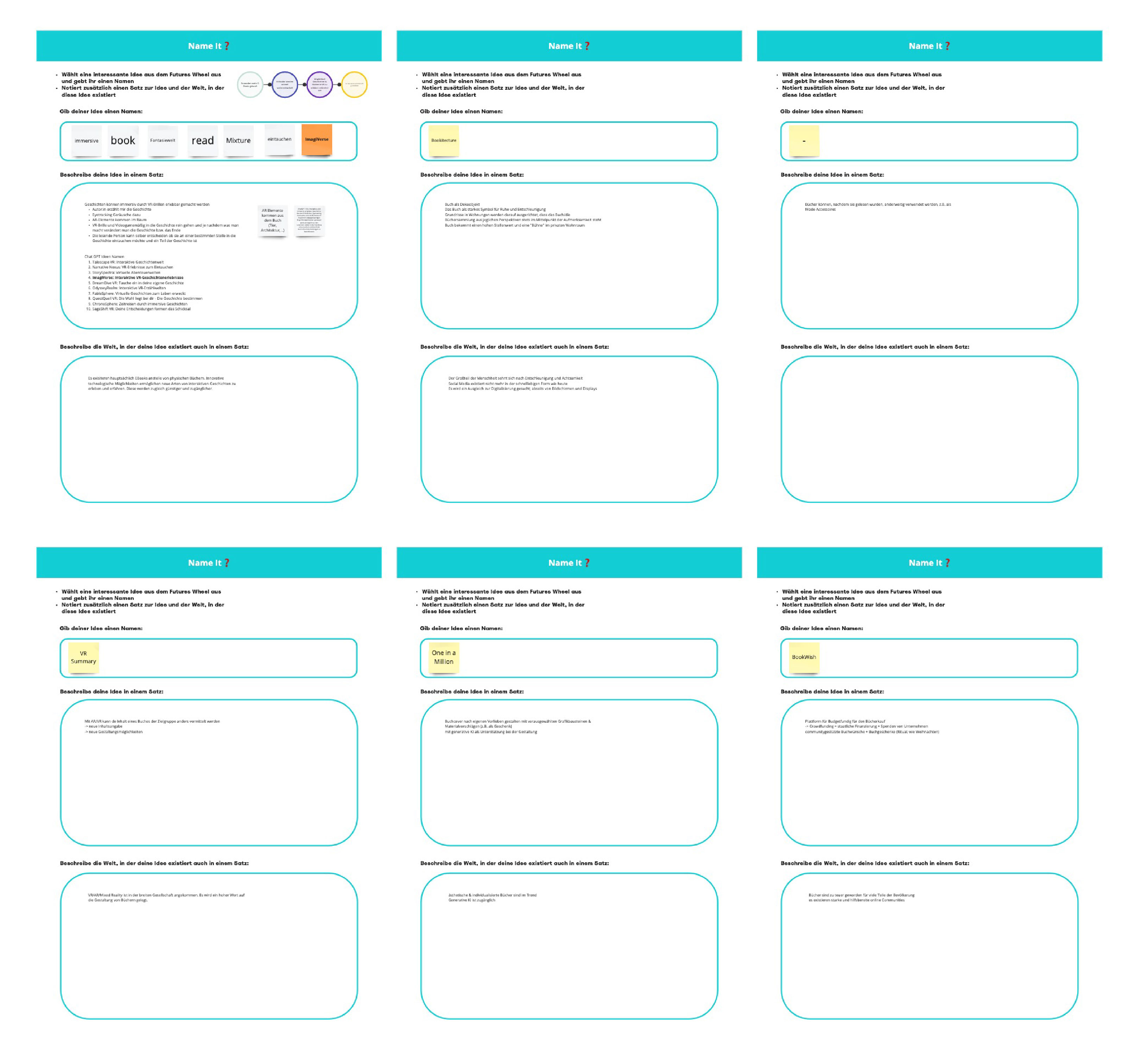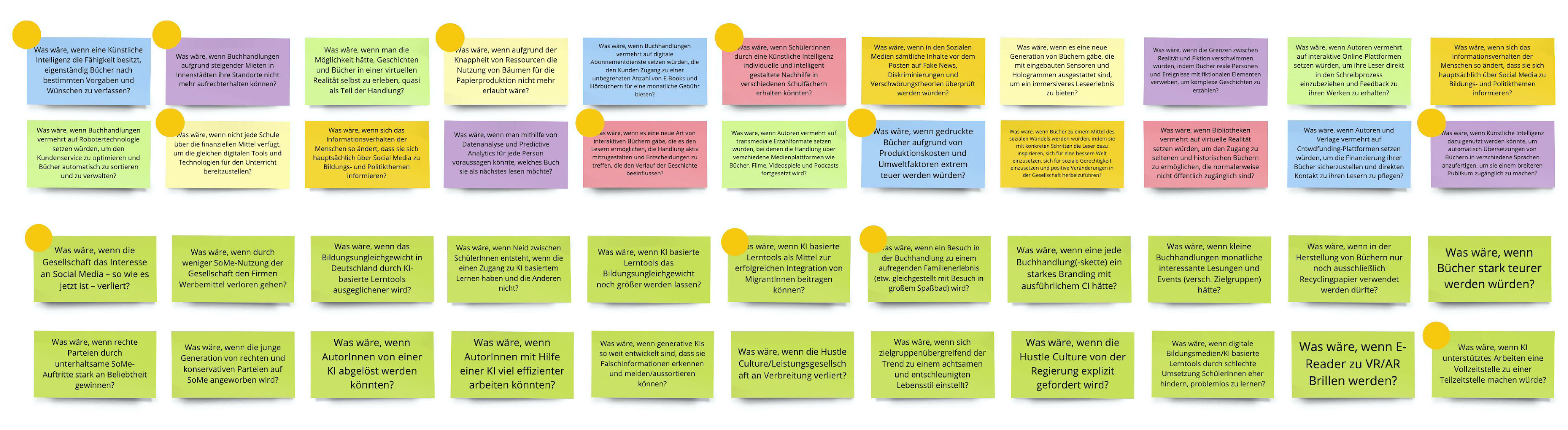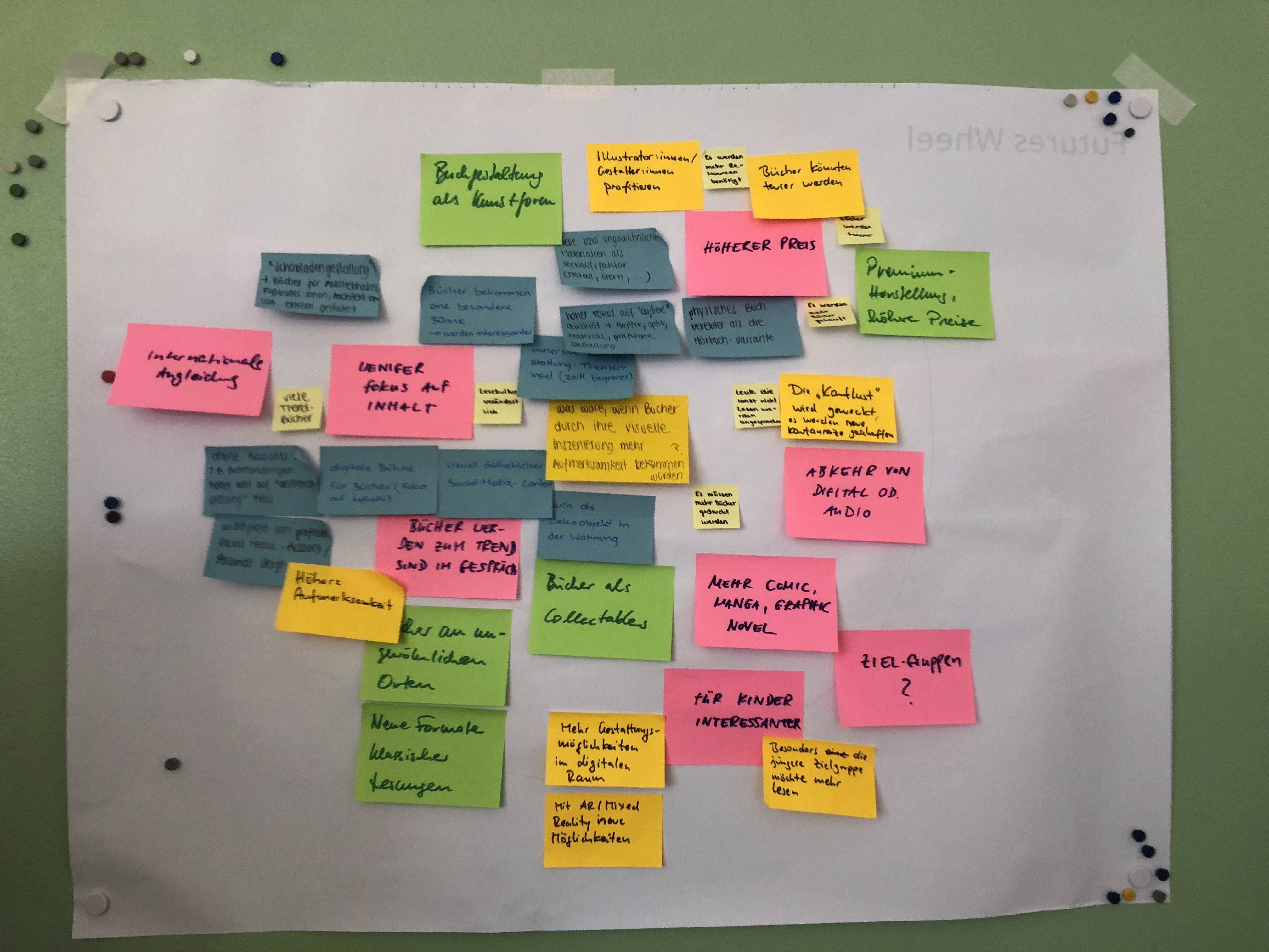 Für die gleiche Frage erstellen wir ein weiteres Future Wheel während des Workshops in Frankfurt mit Vertretern des BöVs, wodurch wir essenzielle Einblicke und interessante Anregungen bekamen. Das zweite Future Wheel befasste sich mit der Frage: “Was wäre, wenn Bücher durch ihre Inszenierung deutlich mehr Aufmerksamkeit bekommen würden?”. Auch hier half uns der Input aus Sicht des BöVs enorm, um unsere Thematik festzulegen und das Projekt in eine essenzielle Richtung zu bewegen. Um verschiedene Zukünfte greifbar zu mache sowie mögliche Outcomes und Ideen zu generieren erstellten wir in Austausch mit den Vertretern des BöVs mehrere Ideen für Produkte und Angebote in verschiedenen Zukünften durch die Methode “Name It”. Hierbei lag der Fokus weniger auf einer realistischen Idee und mehr darauf die Imagination und die Bedeutung von verschiedenen Umständen in der Zukunft nachvollziehbar zu machen. Die Ergebnisse waren kreativ, interessant und teilweise witzig und halfen uns einzuschätzen, auf welche verschiedene Weisen bestimmte Faktoren und Umstände die Lesekultur und Buchbranche beeinflussen können und welche Produkte, Angebote und Ideen daraus entstehen können.