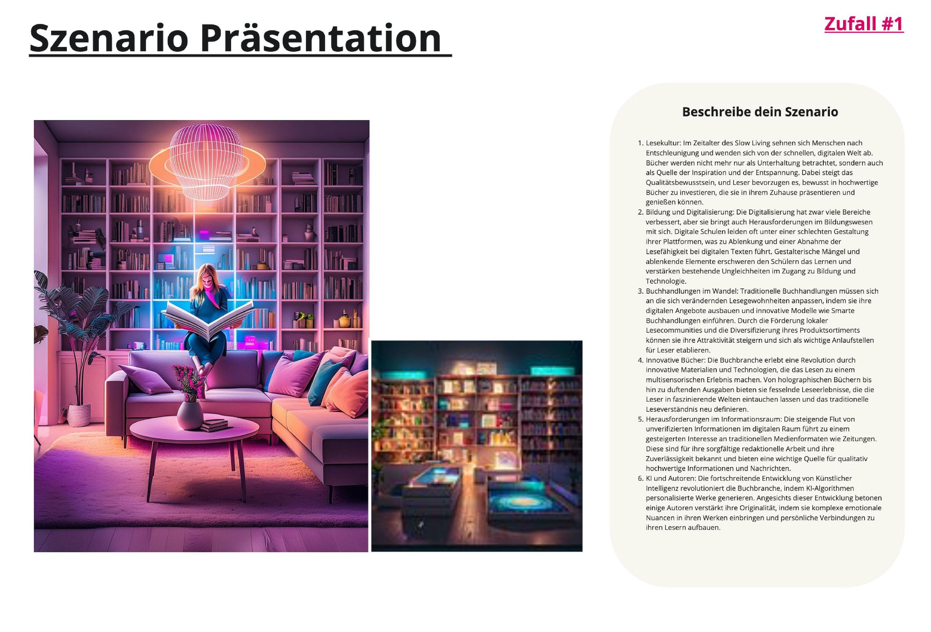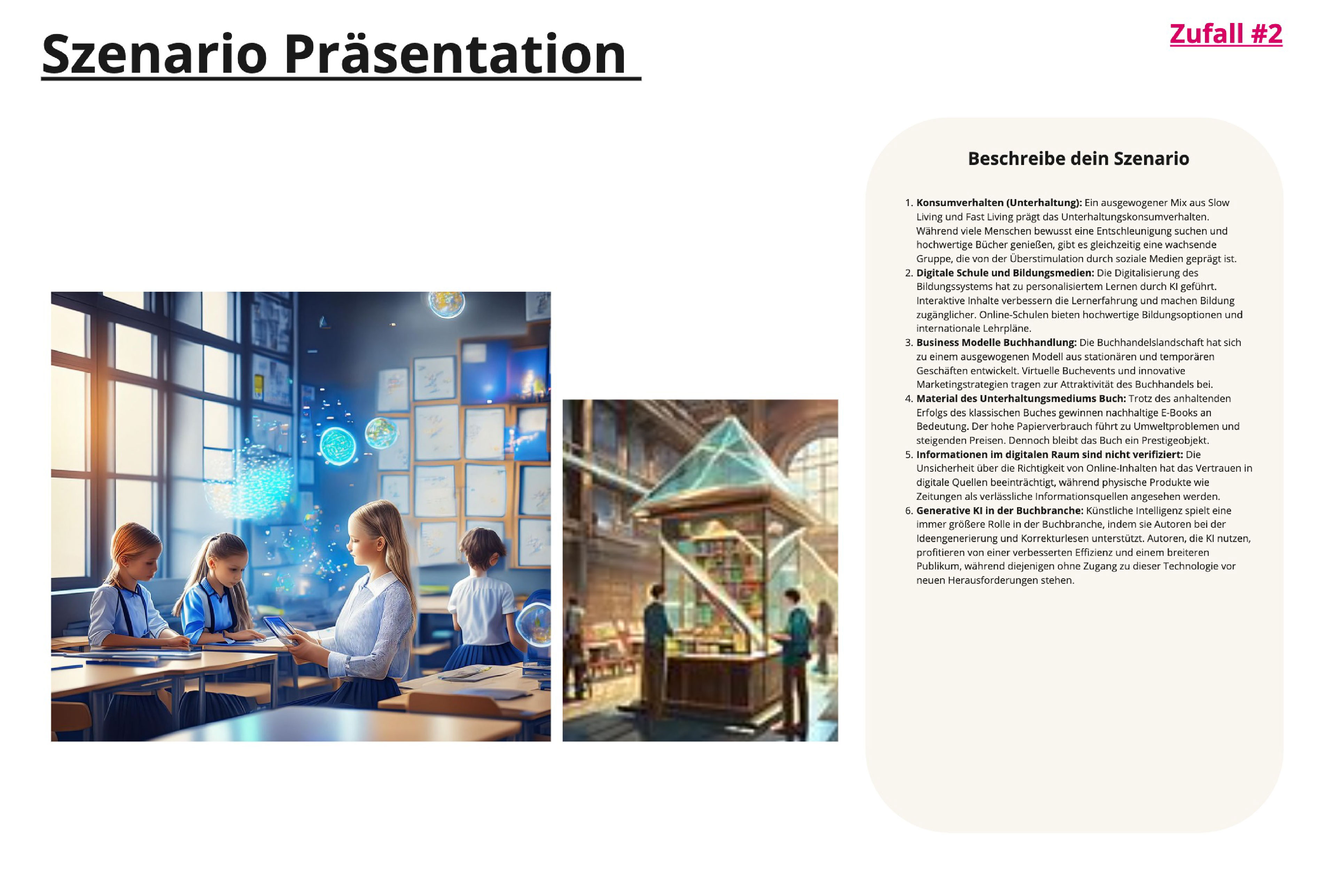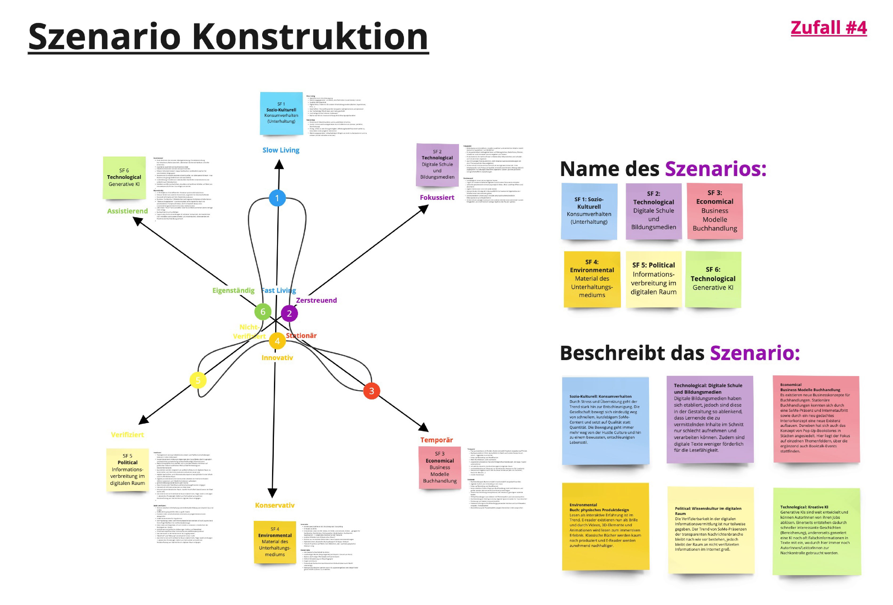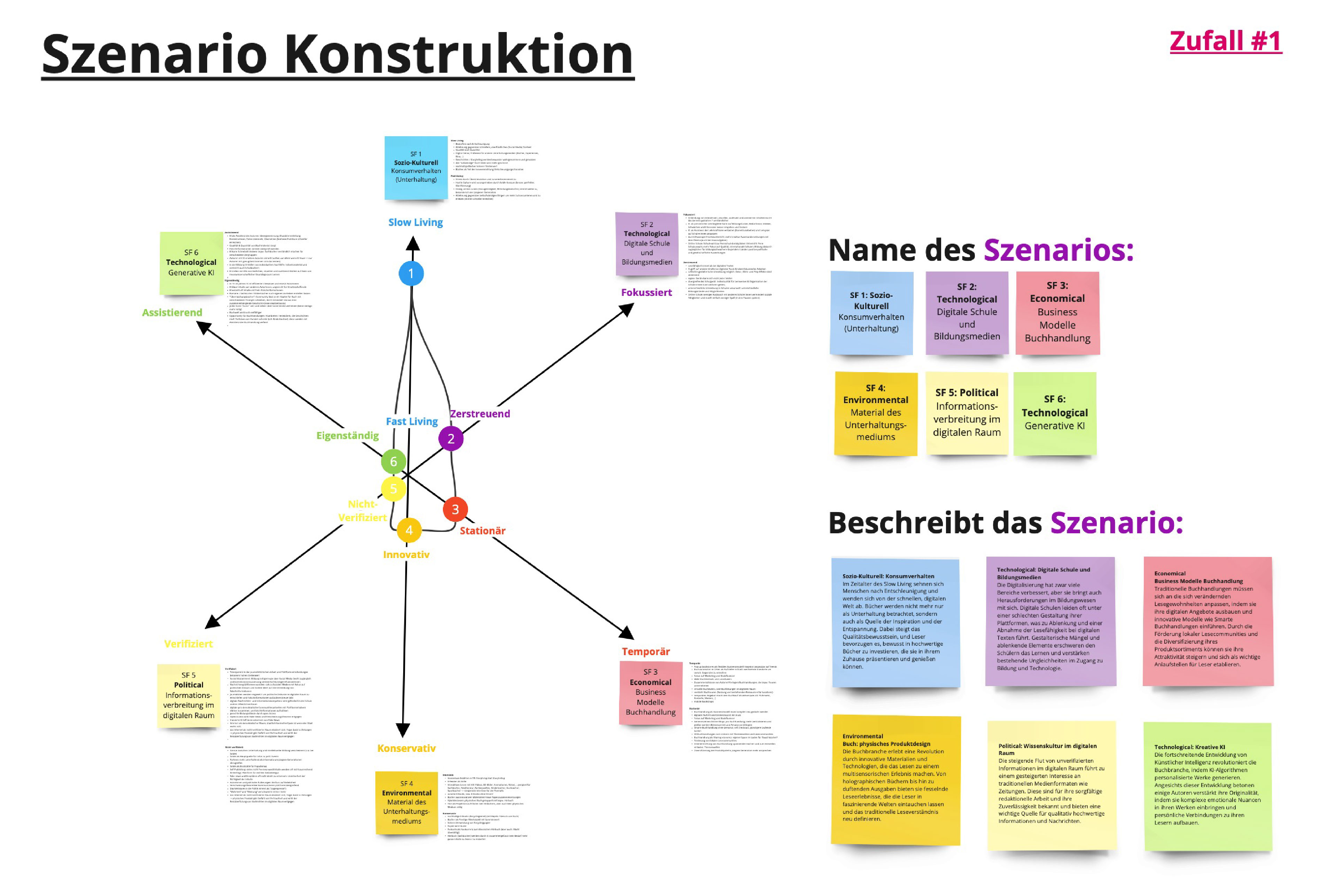 Darauf aufbauend war es möglich, verschiedene Zukunftsszenarien zu erarbeiten, welche wir in Form von der Szenarienspinne darstellten. Hierzu erstellen wir ein Szenario, welches unserer Einschätzung und Kenntnisse nach eine realistische Zukunft darstellte. Um unser eigenes Bild von der Zukunft herauszufordern, erstellen wir noch vier weitere Zukunftsszenarien nach Zufall, indem wir für die entgegengesetzten Entwicklungen eines Schlüsselfaktores die Ausprägung würfelten. Zusätzlich visualisierten wir diese Zukunftsszenarien in aussagekräftigen Bildern, sodass sich schon am Anfang der Projektarbeit ein Image und Gefühl für die Zukunft des Buches und der Buchbranche erschließen lassen konnte.