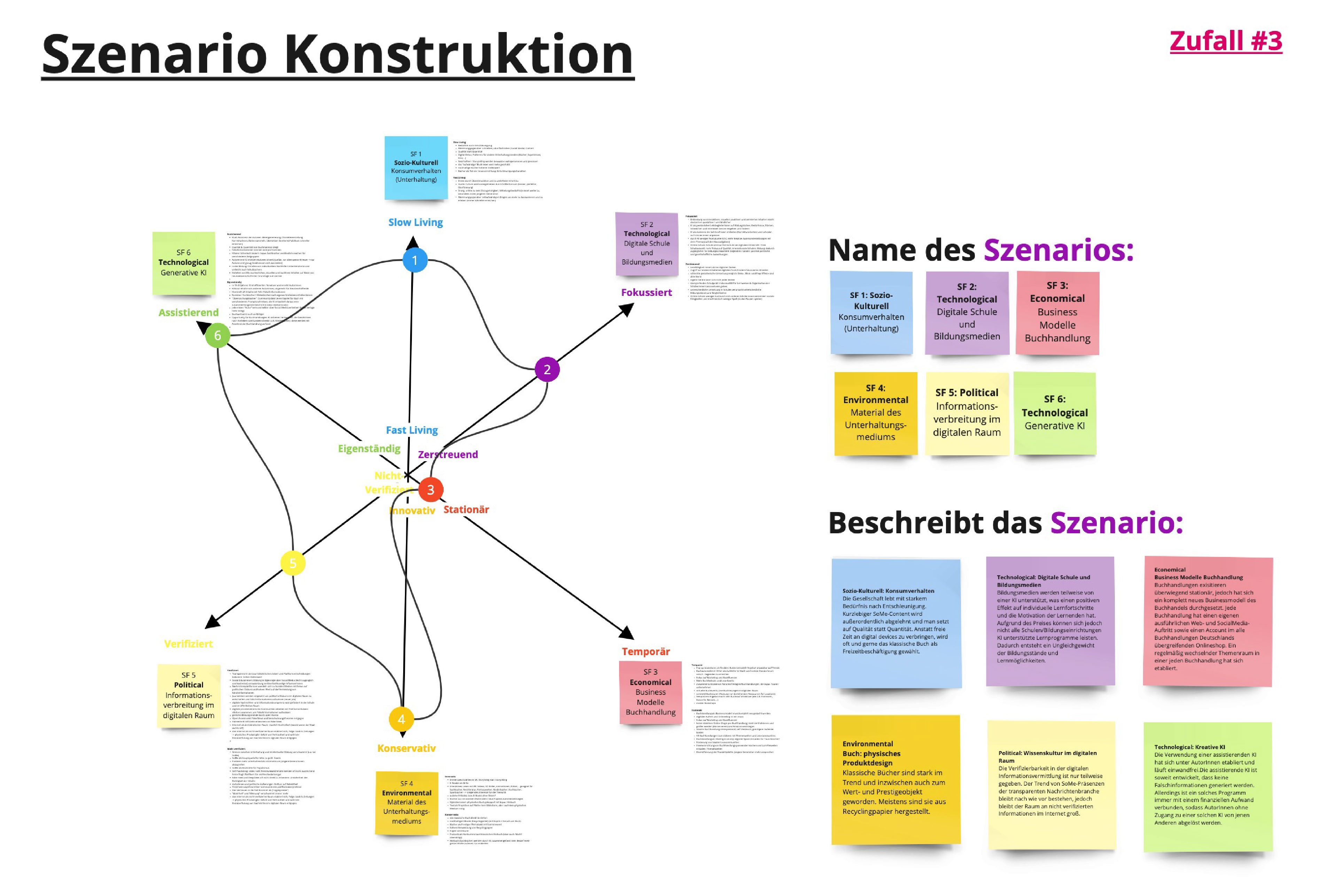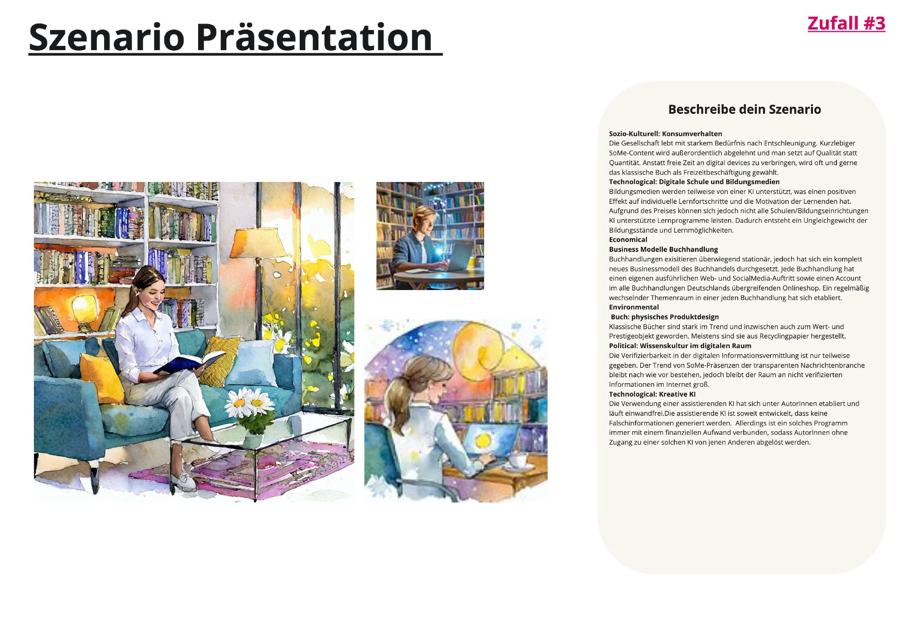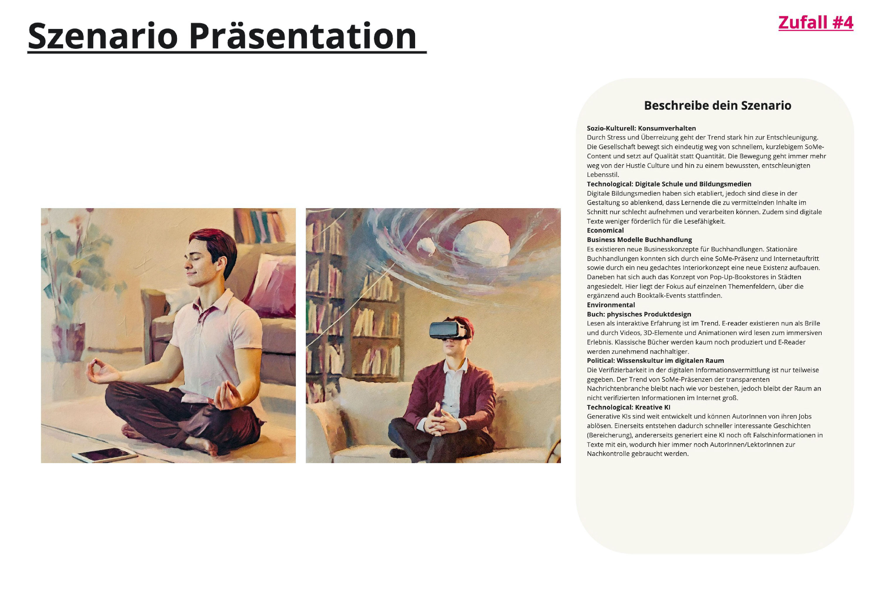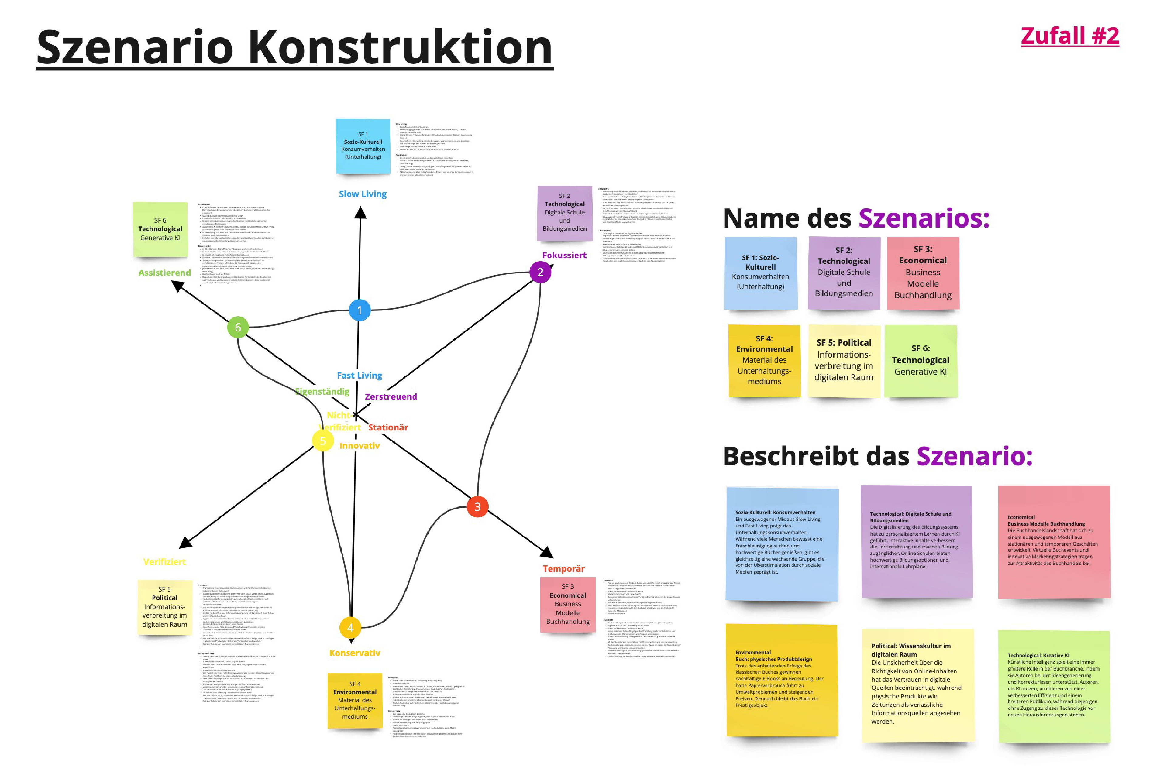 Darauf aufbauend war es möglich, verschiedene Zukunftsszenarien zu erarbeiten, welche wir in Form von der Szenarienspinne darstellten. Hierzu erstellen wir ein Szenario, welches unserer Einschätzung und Kenntnisse nach eine realistische Zukunft darstellte. Um unser eigenes Bild von der Zukunft herauszufordern, erstellen wir noch vier weitere Zukunftsszenarien nach Zufall, indem wir für die entgegengesetzten Entwicklungen eines Schlüsselfaktores die Ausprägung würfelten. Zusätzlich visualisierten wir diese Zukunftsszenarien in aussagekräftigen Bildern, sodass sich schon am Anfang der Projektarbeit ein Image und Gefühl für die Zukunft des Buches und der Buchbranche erschließen lassen konnte.