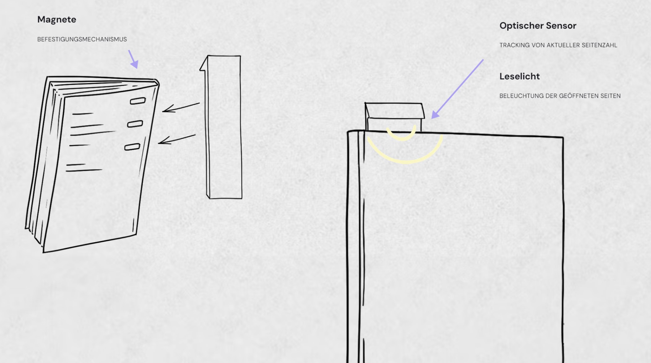 - Das Gerät soll ästhetisch und funktional sein, darf zugleich den Lesefluss durch sein Äußeres jedoch nicht stören. Zugleich soll es visuell nicht zu sehr vom Buch ablenken, an das es angebracht ist.