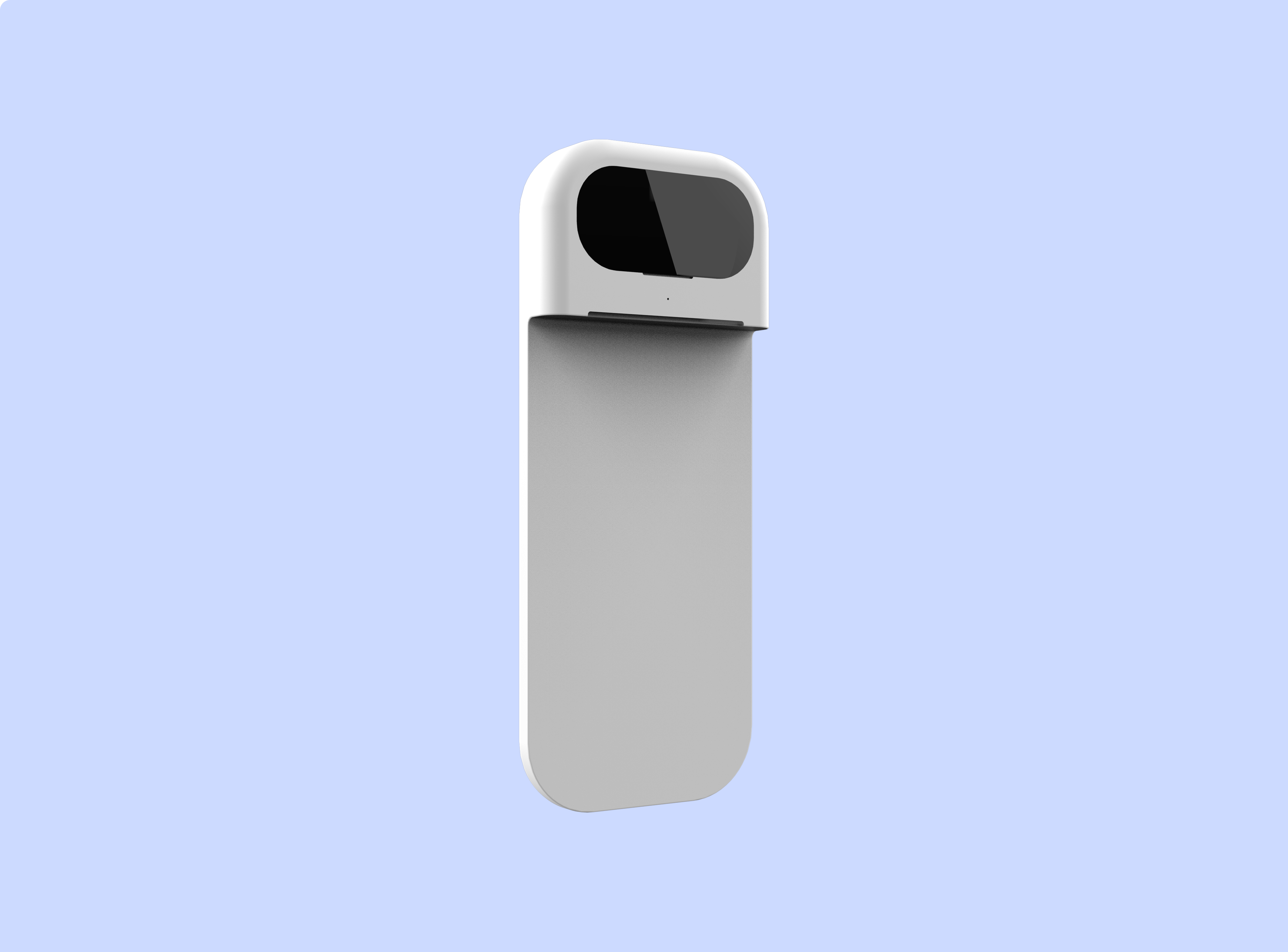 Im dritten Entwurf ist eine feste Biegung integriert. Die Sensoren am vorderen Ende dieser Biegung sind der auffälligste Teil des Geräts und erinnern entfernt an die Street View-Kameras von Google. Ähnlich wie diese Kameras ihr Umfeld optimal wahrnehmen müssen, ist auch bei unserem Device die präzise Erfassung der Umgebung von zentraler Bedeutung.