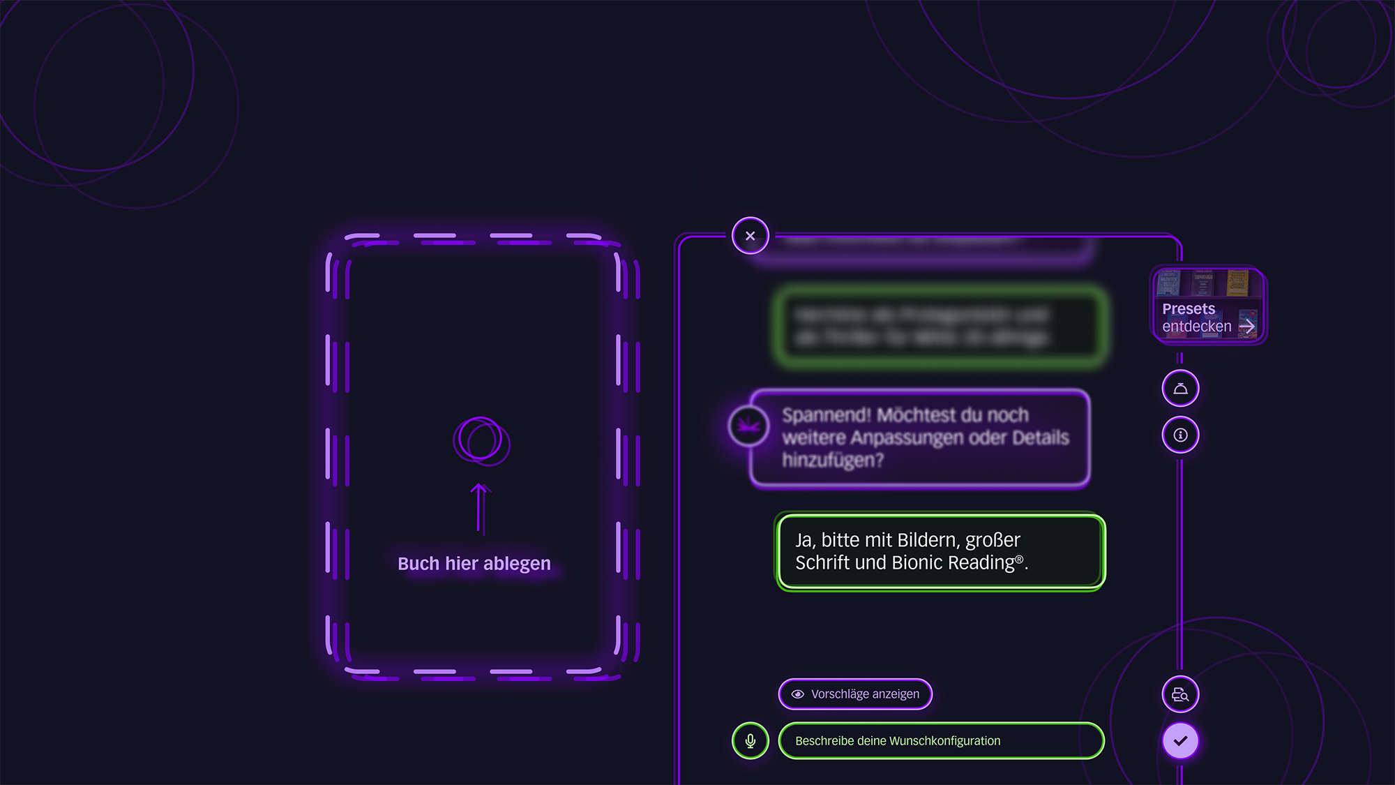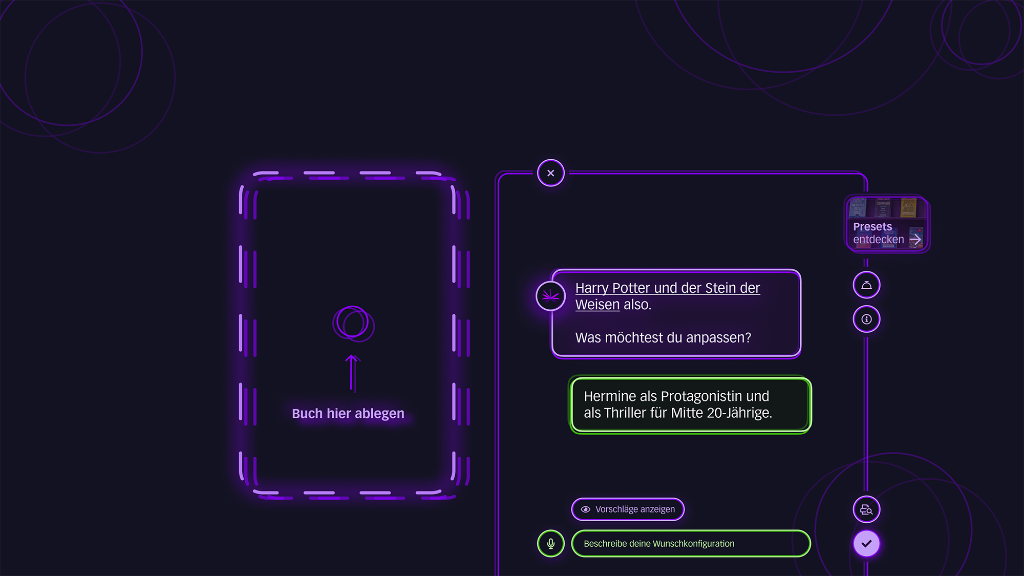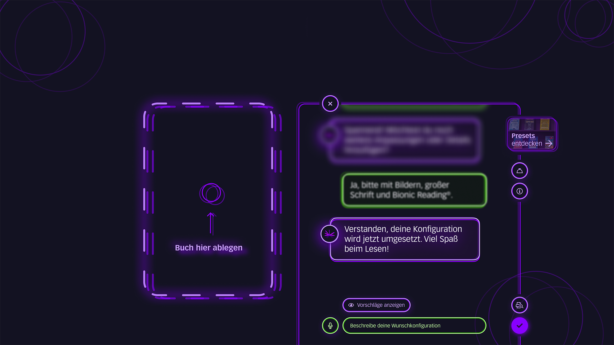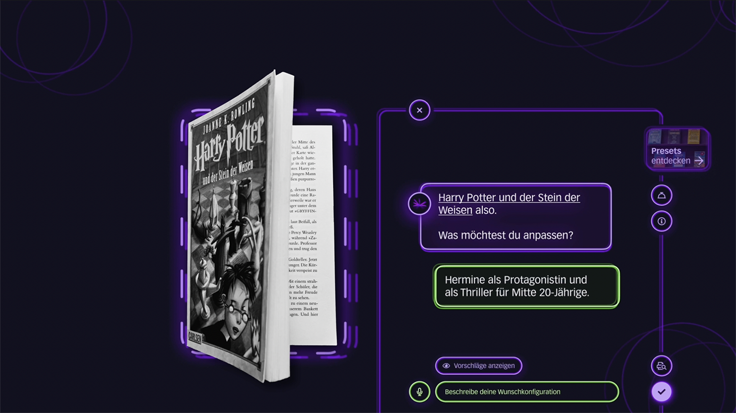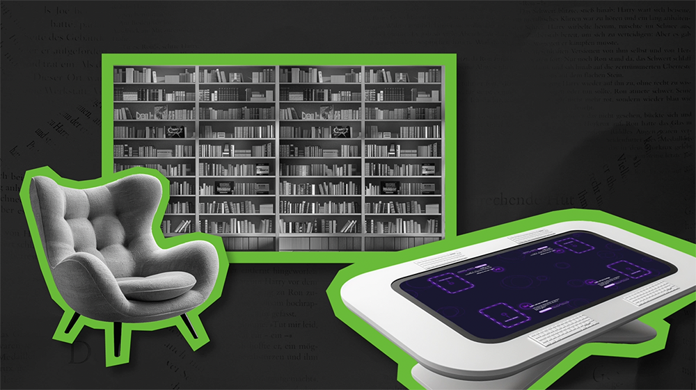 Für die Konfiguration im Buchladen wird ein Konzept für einen digitalen Tisch erstellt. Dieser hat den Vorteil, dass die Menschen ohne Hemmschwelle direkt mit ihm interagieren können. Das gewünschte Buch, welches verändert werden soll, wird darauf gelegt und auf einem Bildschirm daneben die neue Auflage gegenübergestellt. Dies soll die Menschen dazu verleiten, sich mehr in Buchläden aufzuhalten und durch diese Attraktion sowie eigene Anpassungen vermehrt zu lesen.