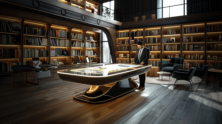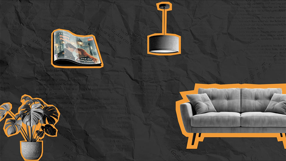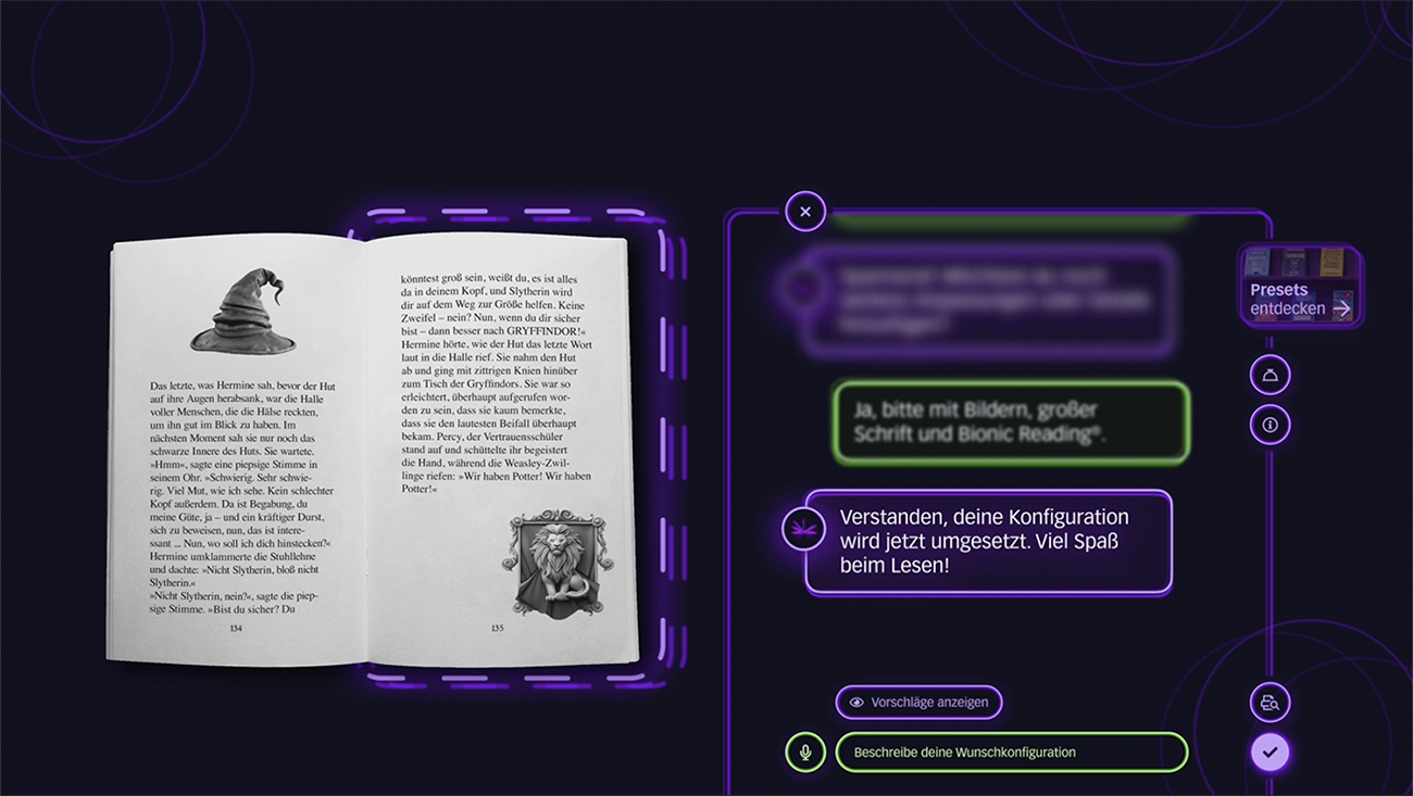 Zuhause können Bücher ebenfalls konfiguriert werden. Dies wird durch ein E-Book dargestellt. Wir haben uns bewusst an dieser Technologie orientiert und sie bis 2035 weiter gedacht, da sich die Ebooks auf dem heutigen Markt immer mehr und mehr weiterentwickeln. Da digitalisierte Anwendungen im Alltag von uns Menschen zunehmen, ist hier eine Einbindung des Individualisierungskonzepts ebenfalls denkbar. Das Ebook wird in seinem Leseverhalten eng an physiche Bücher aus Papier angepasst, um die Leseerfahrung durch psychologische Effekte eines klassischen Buches beizubehalten.