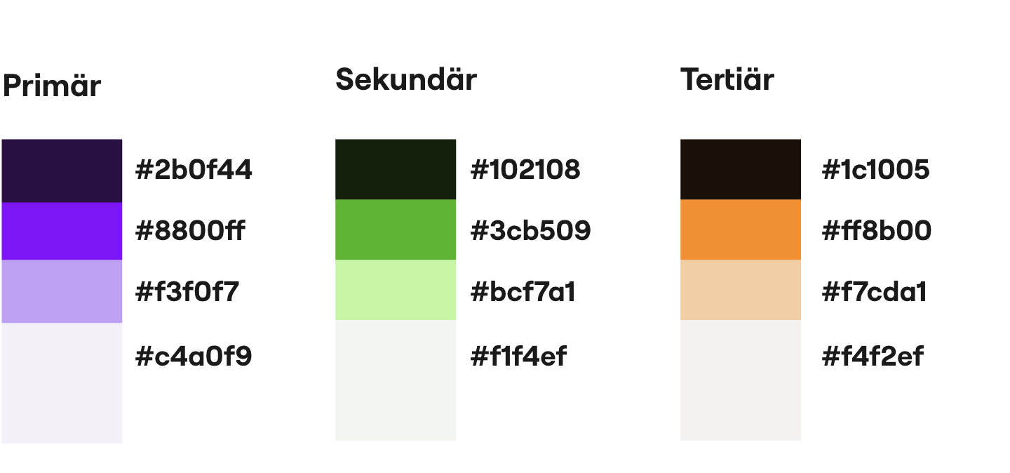Die Primärfarbe Lila wird gewählt, da diese in ihrer Aussage selbst sehr vielschichtig ist. Zudem wird sie oft im Kontext mit Diversität und Individualität verwendet und ist deshalb in ihrer Wirkung passend. Gepaart wird die Farbe mit ihren Komplementären Grün und Orange. Diese drei Farben sind am weitesten im Farbkreis voneinander entfernt, ergänzen sich dennoch untereinander und bringen Diversität im Erscheinungsbild mit sich.
