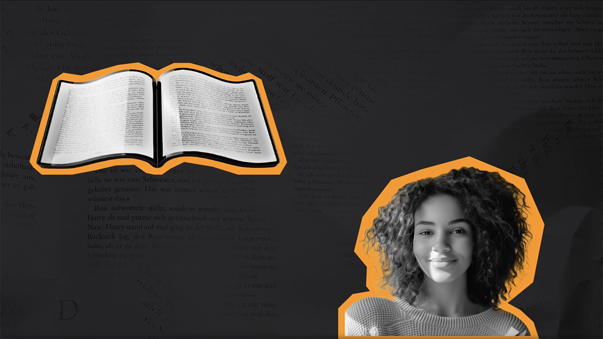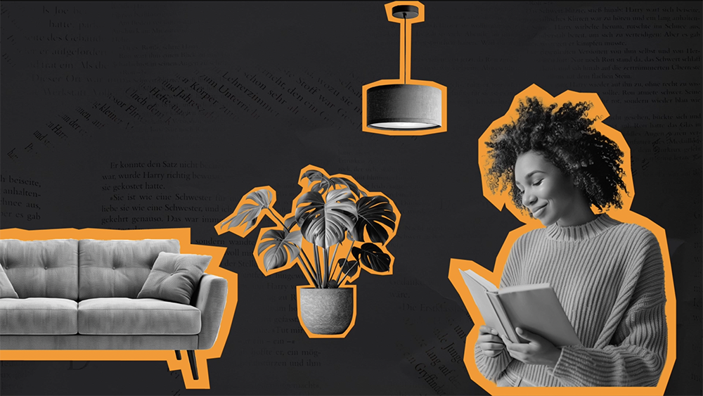 Video 3 bezieht sich mehr auf den emotionalen Aspekt beim Bücherlesen und holt den Zuschauenden auf diese Weise ab. Er wird ebenfalls durch eine Sprecherstimme bei der Nutzung des Ebooks durchgeleitet und die Inszenierungen der ersten beiden Videos ziehen sich ebenfalls durch das Konzept. Hierbei sind die Fotos in orange hinterlegt.