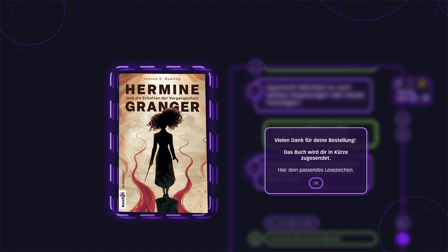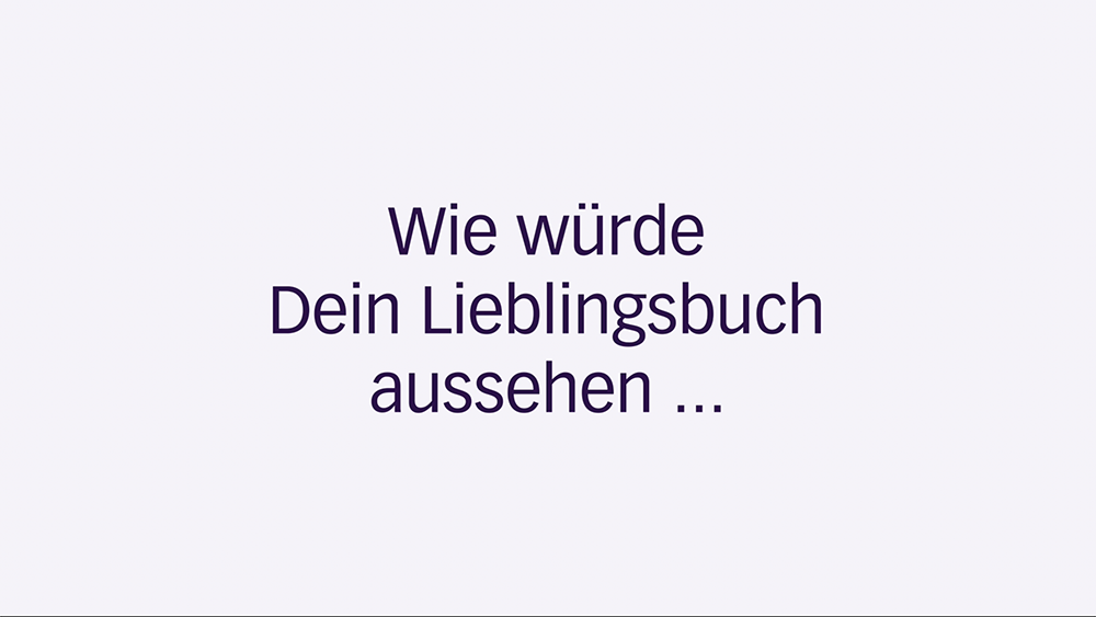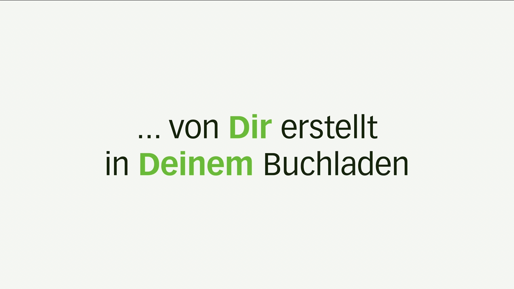 Im zweiten Video wird der Konfigurator im Buchladen erklärt. Hierbei wird eine Sprecherstimme unterlegt, um die Funktionalität und Erfahrung greifbar zu machen. Der Zuschauende wird ebenfalls direkt angesprochen, indem die Sprecherin Fragen stellt. Zur Abgrenzung von Video 1 wird hierbei auf grün bei den Umrandungen gesetzt.
