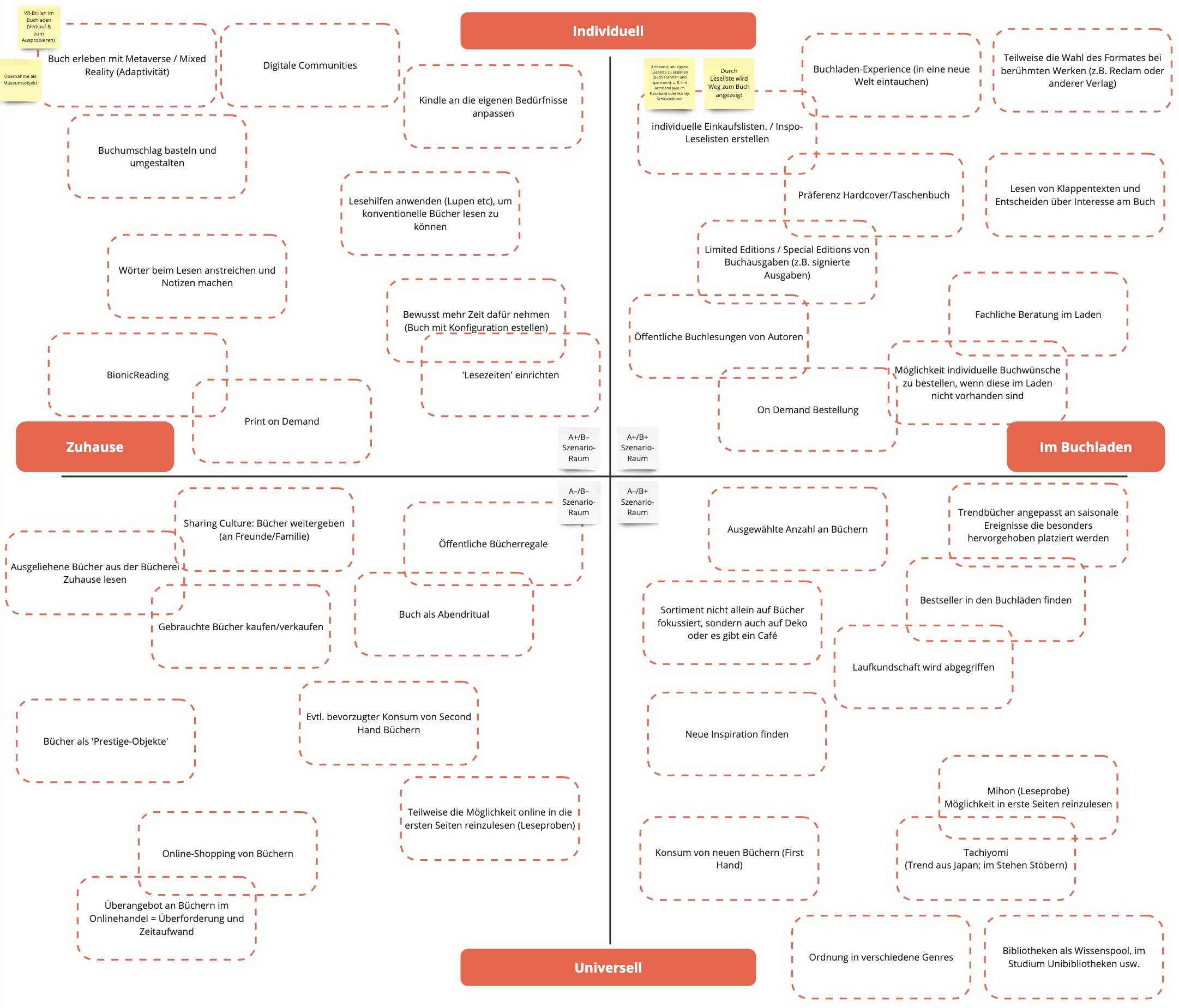 Daraufhin wird ein 2x2 Szenario erstellt. Der Kontext der Szenarien findet im Buchladen sowie Zuhause statt und der Grad der Individualisierung bzw. kaum Individualisierung wird gegenübergestellt. Das größte Potential eines individuelleren Leseerlebnisses wird somit in den beiden oberen Quadranten sichtbar. In diesem Zuge wird eine konkrete Gestaltung begonnen, um die Szenarien mit den Artefakten verständlich darstellen zu können.