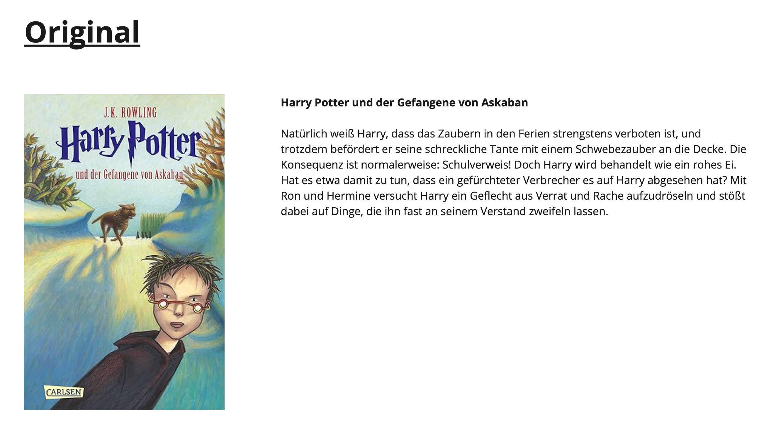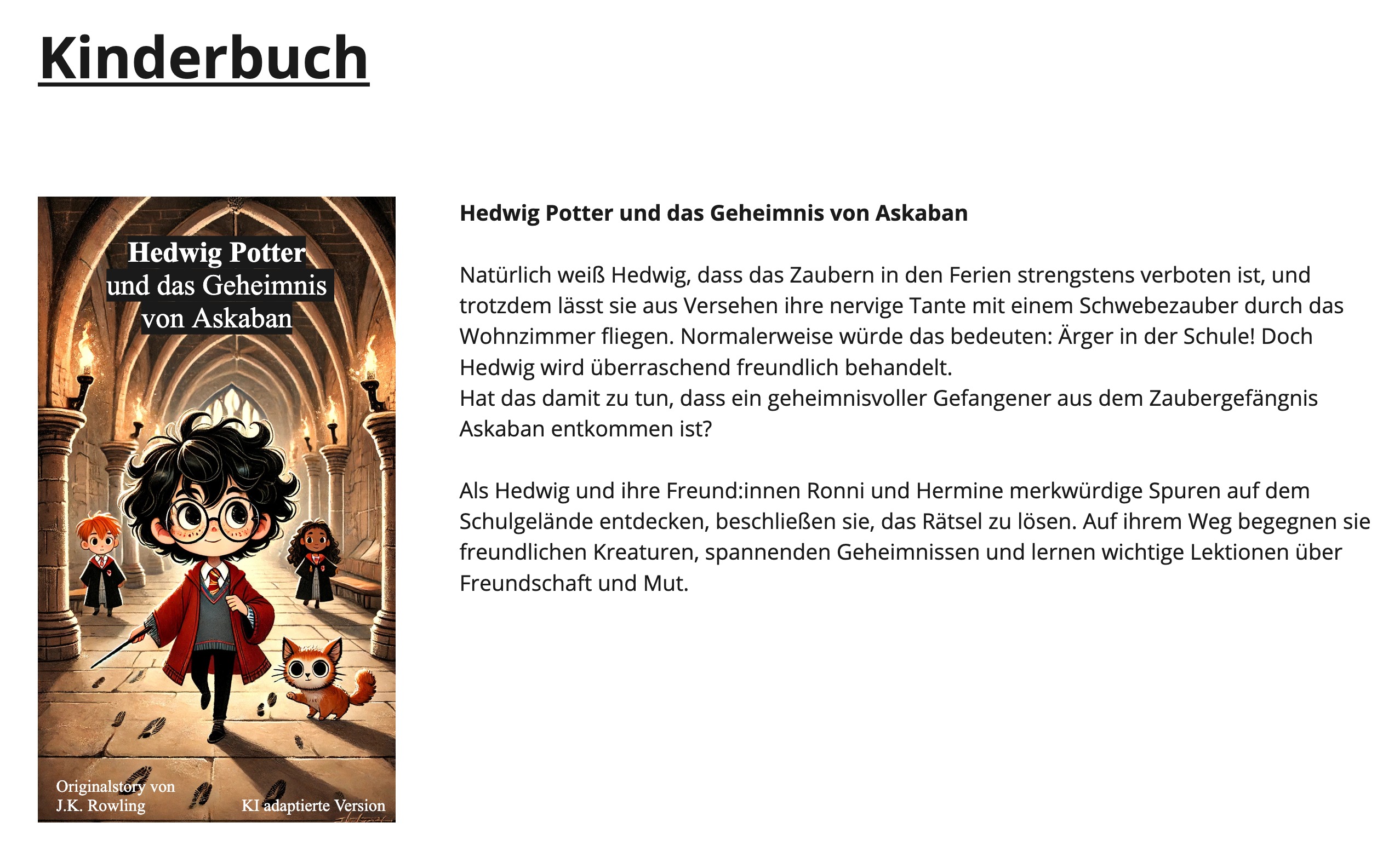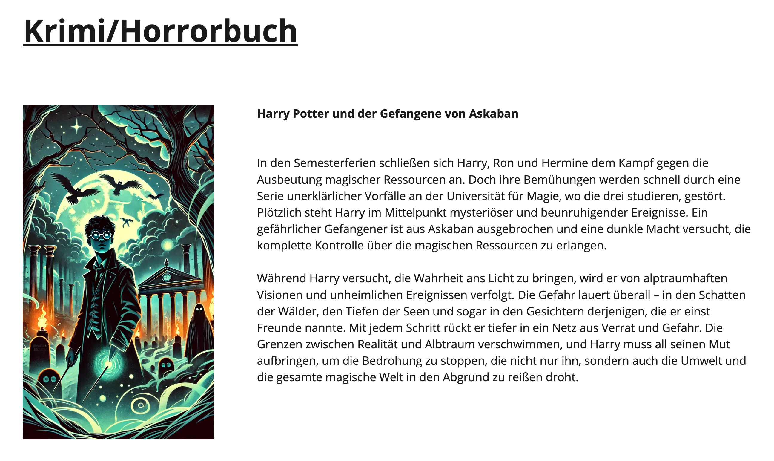 Als Artefakte spielt durch die Individualisierung von Leseerfahrungen die Gestaltung des Buchumschlags eine große Rolle. Am Beispiel von Harry Potter wird der Klappentext in unterschiedlichen Genres wiedergegeben. Die Formulierung der Klappentexte erfolgt durch ChatGPT und die Generierung der zugehörigen Buchumschläge durch Midjourney.