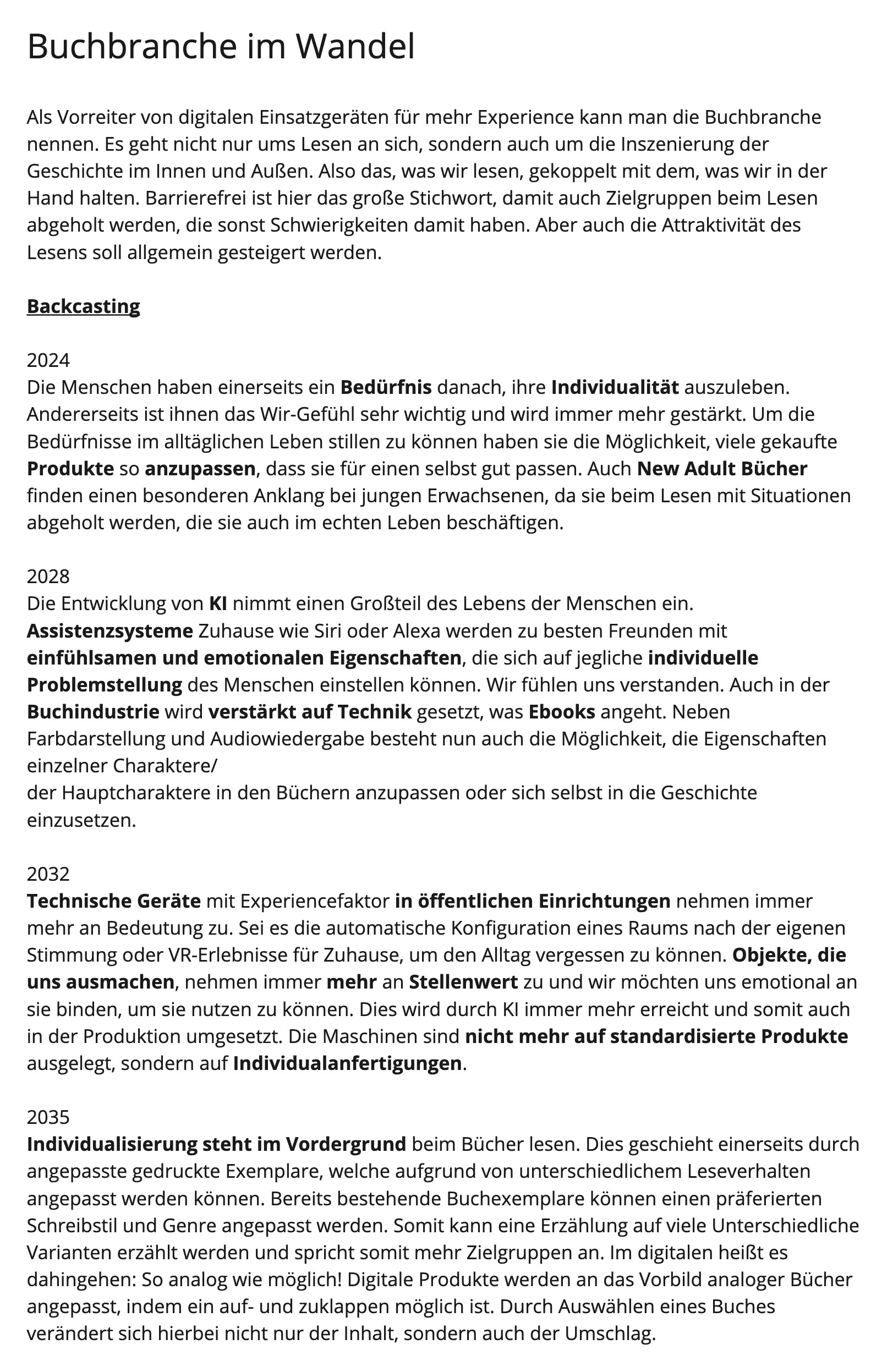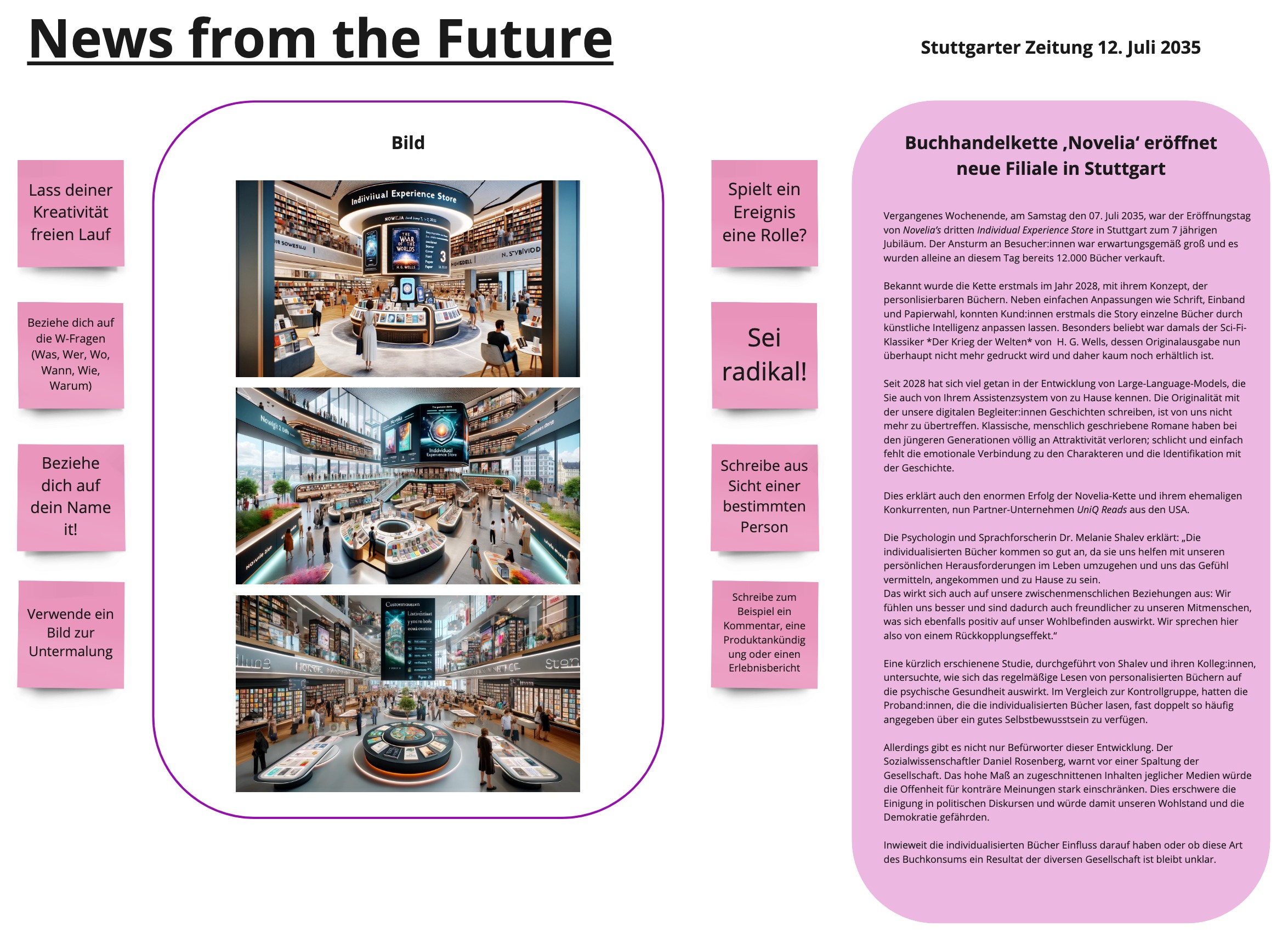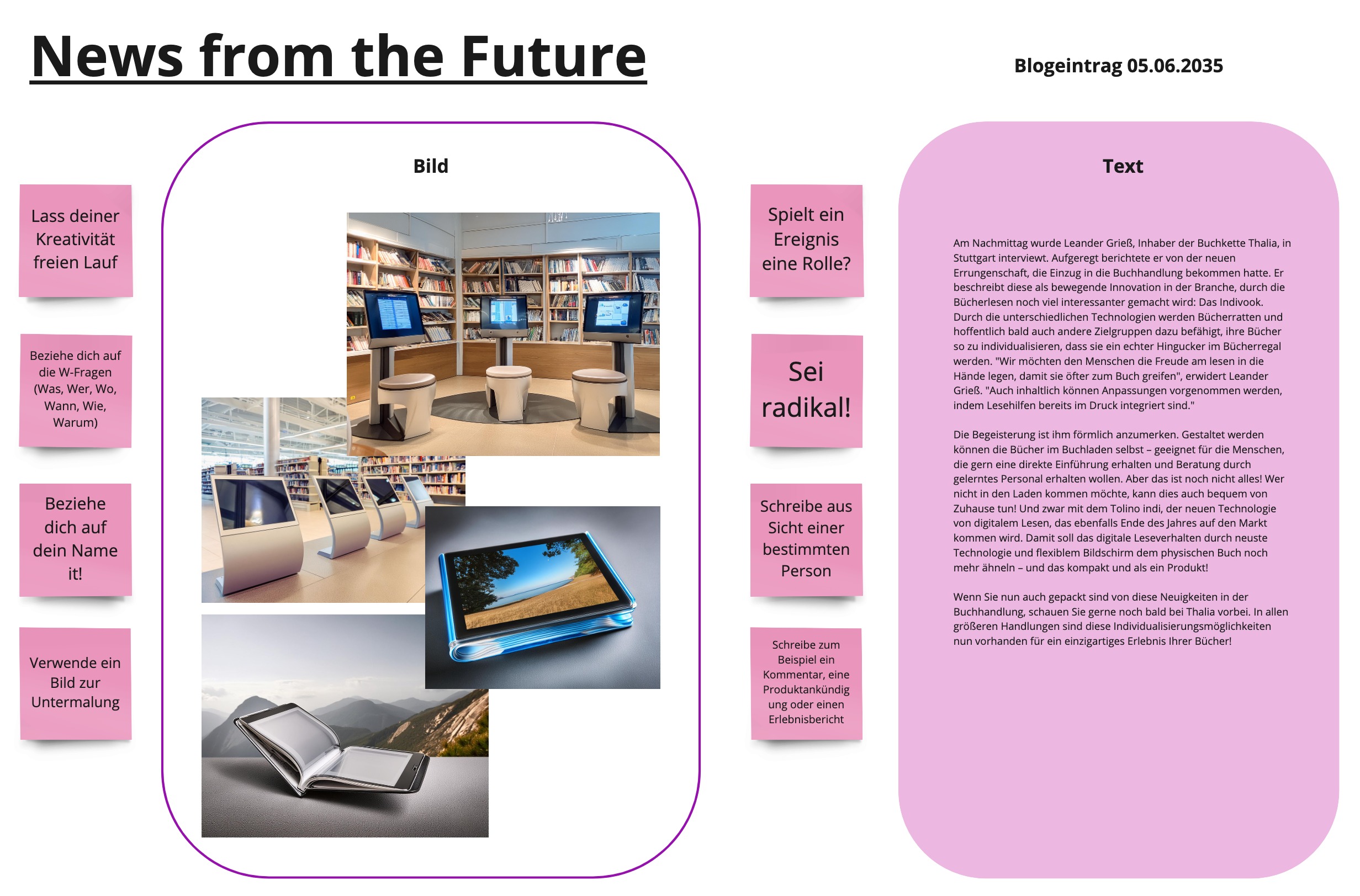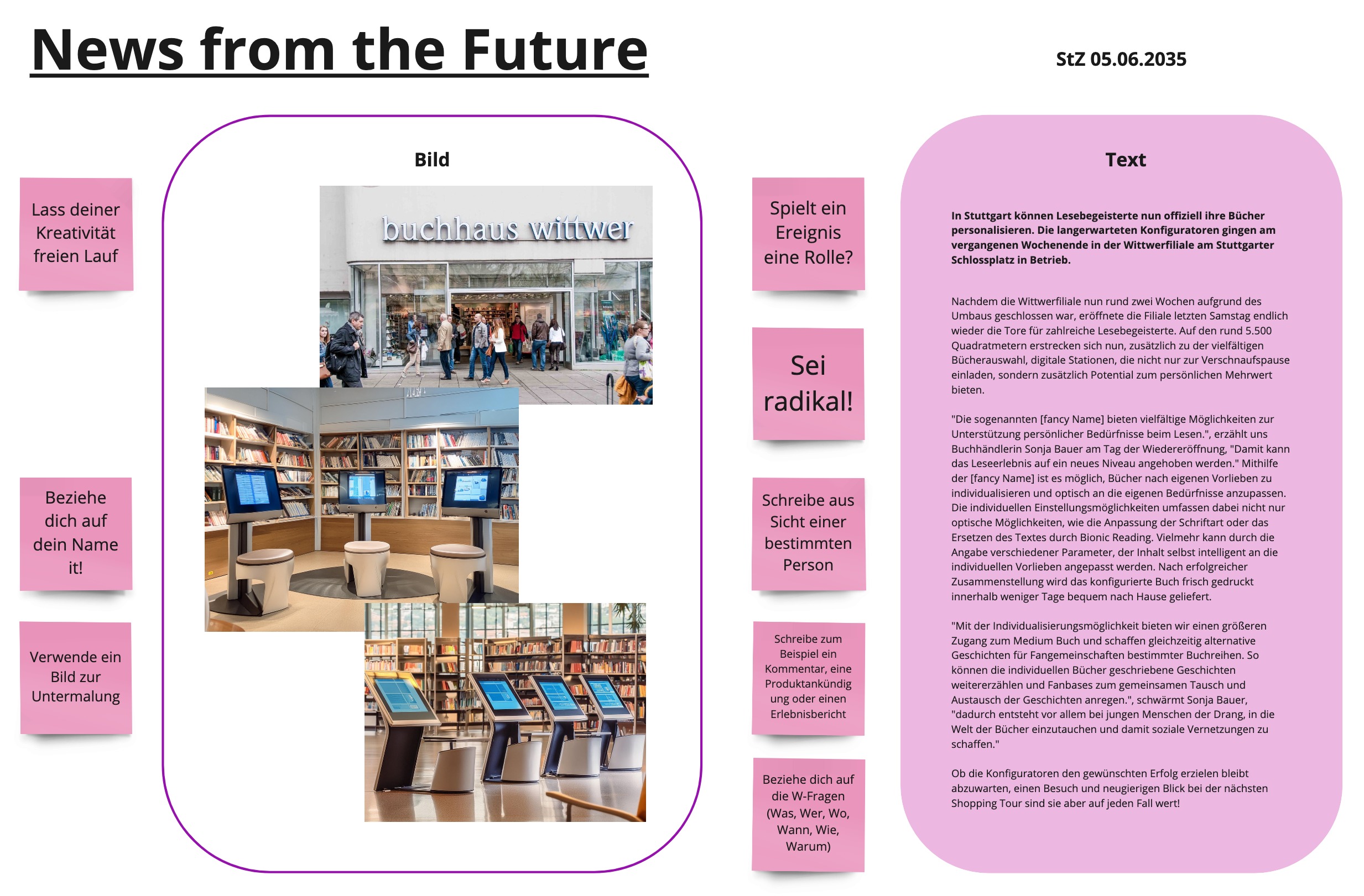 Im nächsten Schritt geht es darum, wie die Welt, in der die Szenarien konkret stattfinden, aussieht. Dies wird mit der Methode News from the Future geschafft, welche in einem Zeitungsartikel einen Tag im Leben der Menschen und der Buchbranche im Jahr 2035 beschreibt. Aufgrund dessen wird der Alltag anschaulich und verständlich dargestellt.