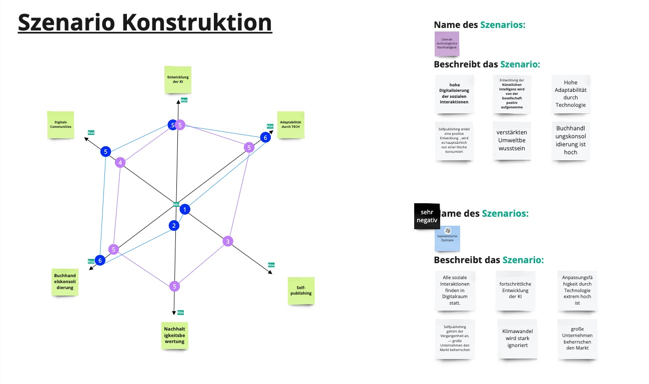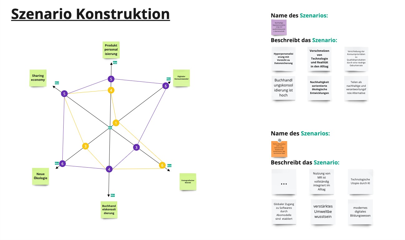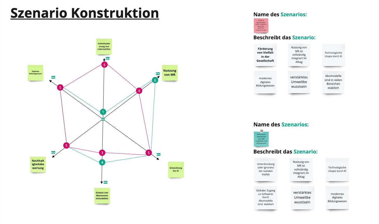 In der zweiten Woche starteten wir bereits mit ersten Szenarien, indem wir bestimmte Schlüsselfaktoren auswählten. Diese waren noch sehr allgemein und dienten als Inspiration für den weiteren Projektverlauf.
