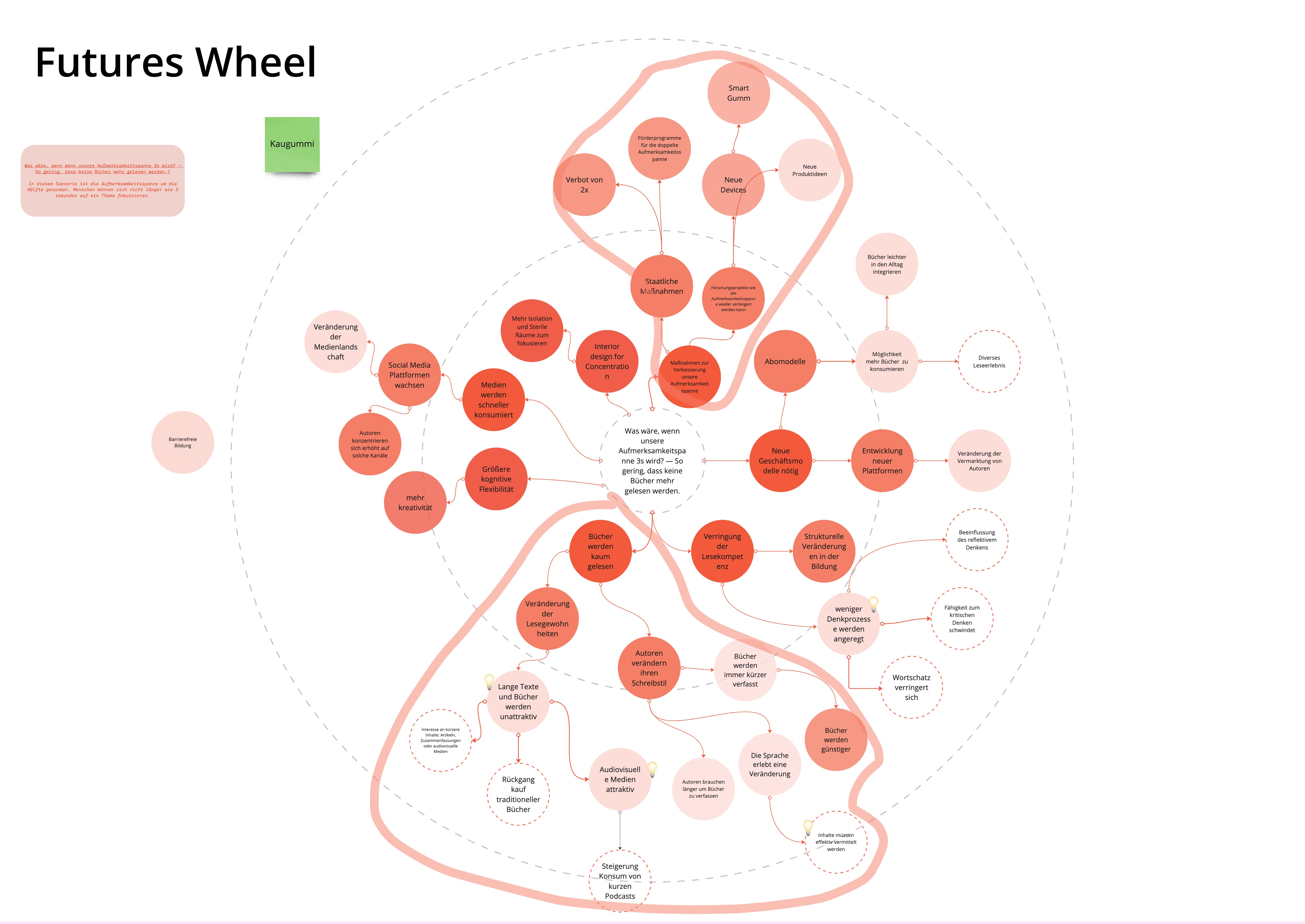 Für zwei der Themen erstellten wir dann weitere Futures Wheels, um die Auswirkungen besser Messen zu können. Das zweite Futures Wheel führte uns zu unserem Themen Closeup.