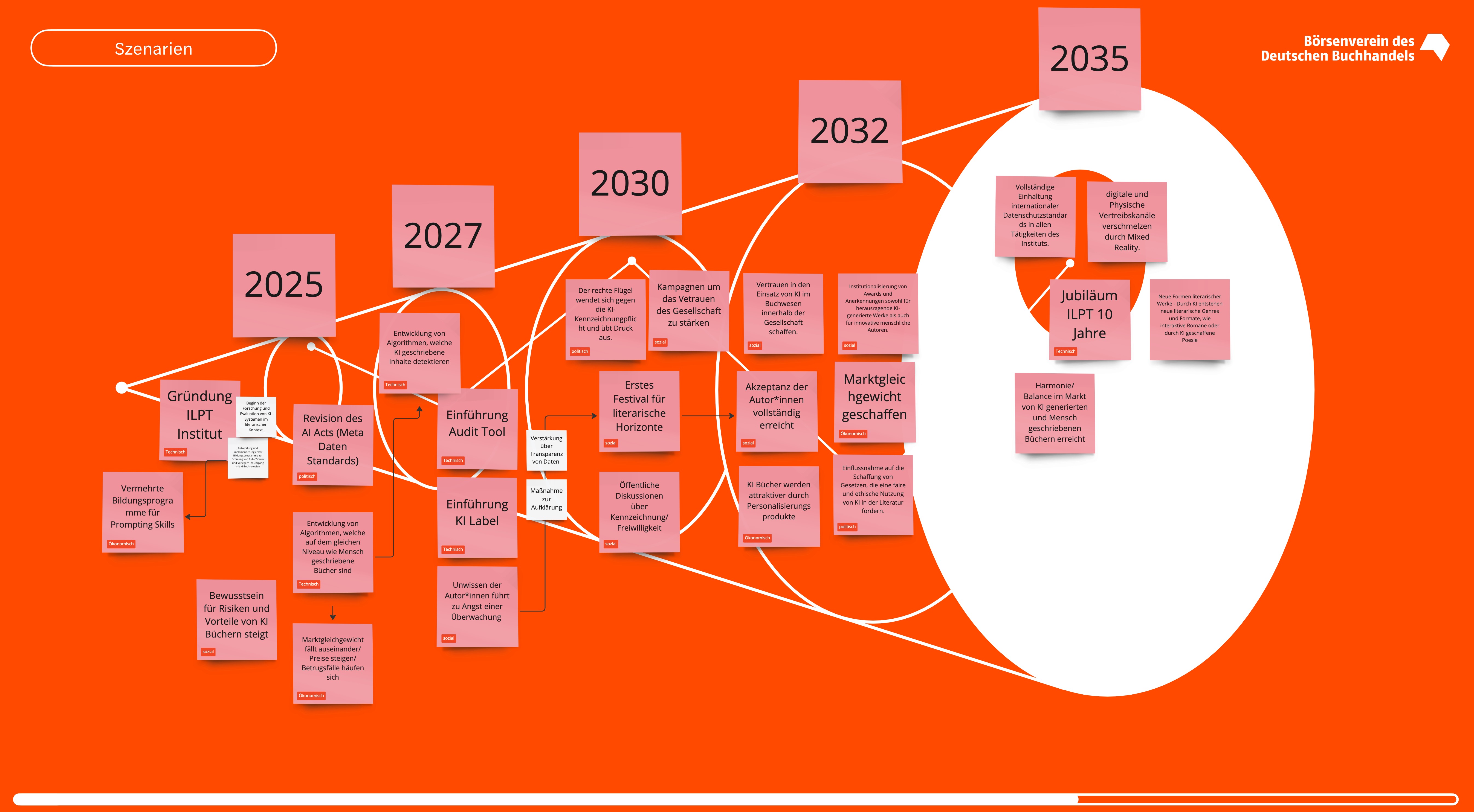 2035: Das Institut feiert sein 10-jähriges Jubiläum. Die Balance zwischen KI-generierten und menschlich geschriebenen Büchern ist erreicht und wird durch Maßnahmen gesichert. Internationale Datenschutzstandards werden eingehalten. Mixed Reality verschmilzt digitale und physische Vertriebskanäle, und neue literarische Genres und Formate wie interaktive Romane und KI-geschaffene Poesie entstehen.