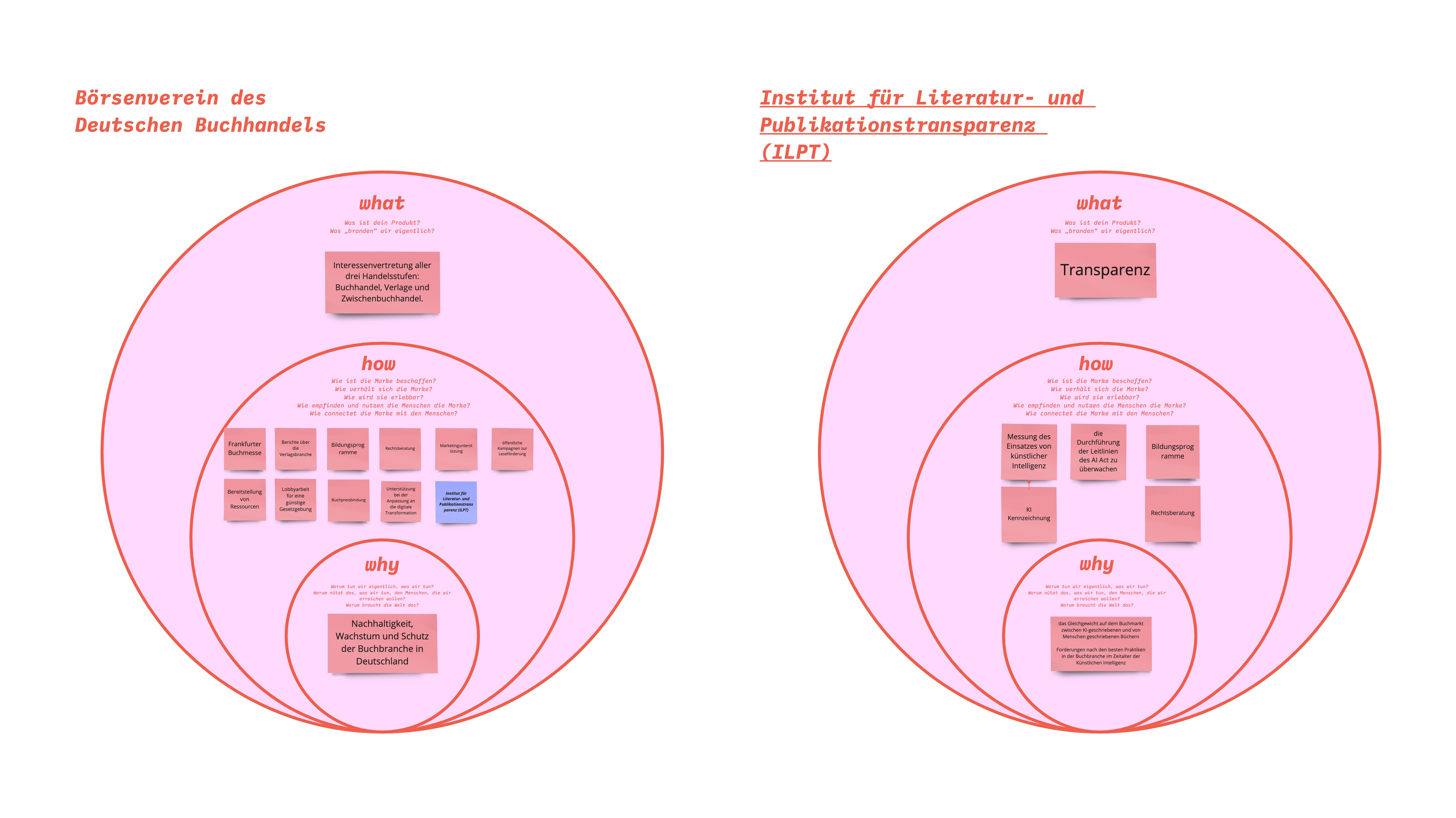 - BöV: Die Hauptleistung des BöV für seine Mitglieder besteht in der Lobbyarbeit. Diese wird durch verschiedene Kampagnen und Dienstleistungen umgesetzt, zu denen auch das ILPT gehört, das somit in die Markenarchitektur integriert werden muss. Das übergeordnete Ziel des BöV ist die Förderung und das Wachstum der Buchbranche in Deutschland.