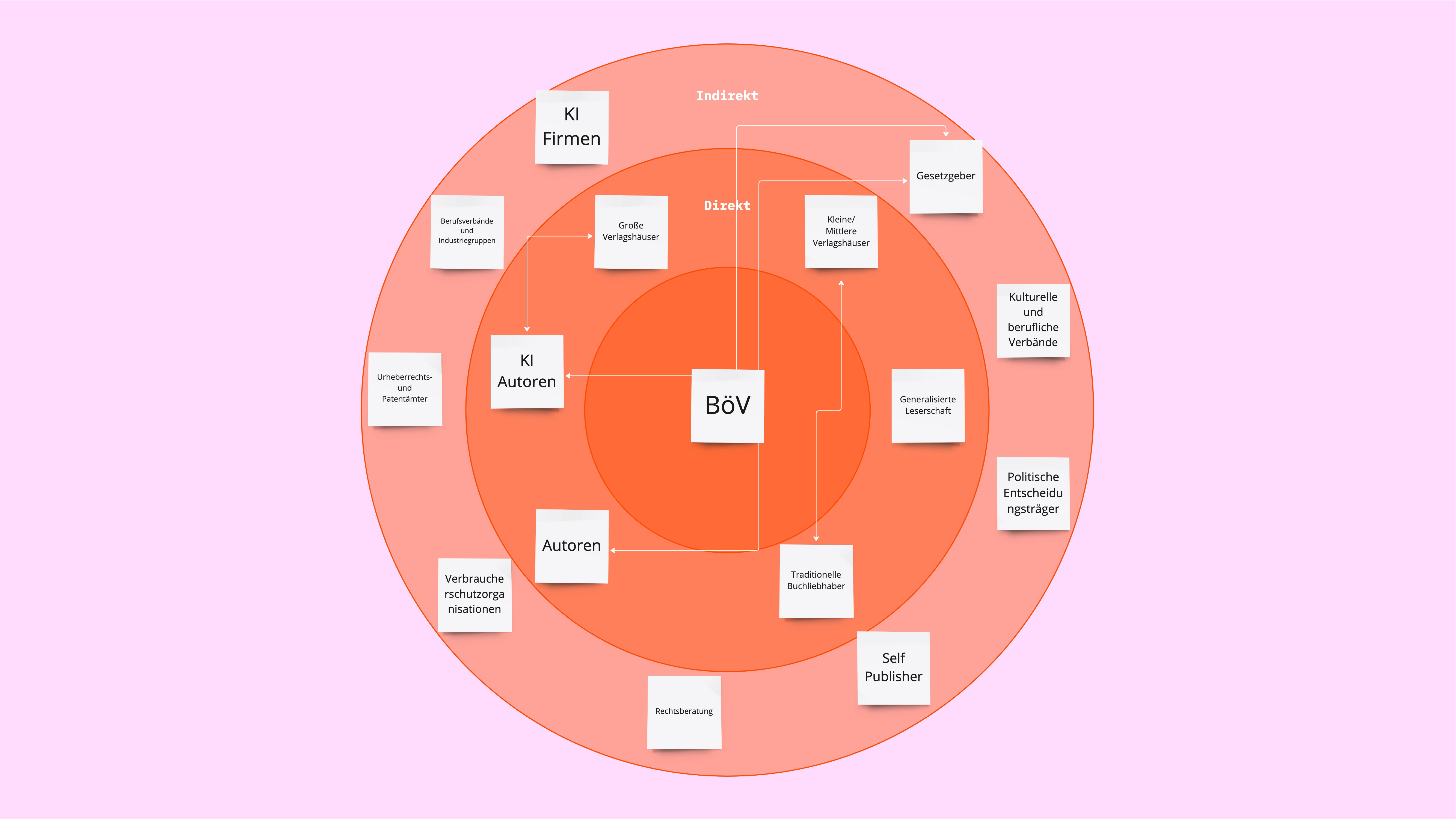 Folgende Stakeholder haben wir identifiziert: Der Key Partner des Instituts ist der Börsenverein des Deutschen Buchhandels. Direkte Stakeholder sind vor allem die Mitglieder wie kleine und große Verlagshäuser, aber auch KI-Autoren und AutorInnen. Dazu zählen auch die allgemeine Leserschaft und traditionelle Buchliebhaber zu unseren direkten Stakeholdern. Indirekte Stakeholder sind KI-Firmen, Berufsverbände, Urheberrechts- und Patentämter sowie politische Entscheidungsträger. Wichtig sind die Gesetzgeberinnen und die Rechtsberatung.