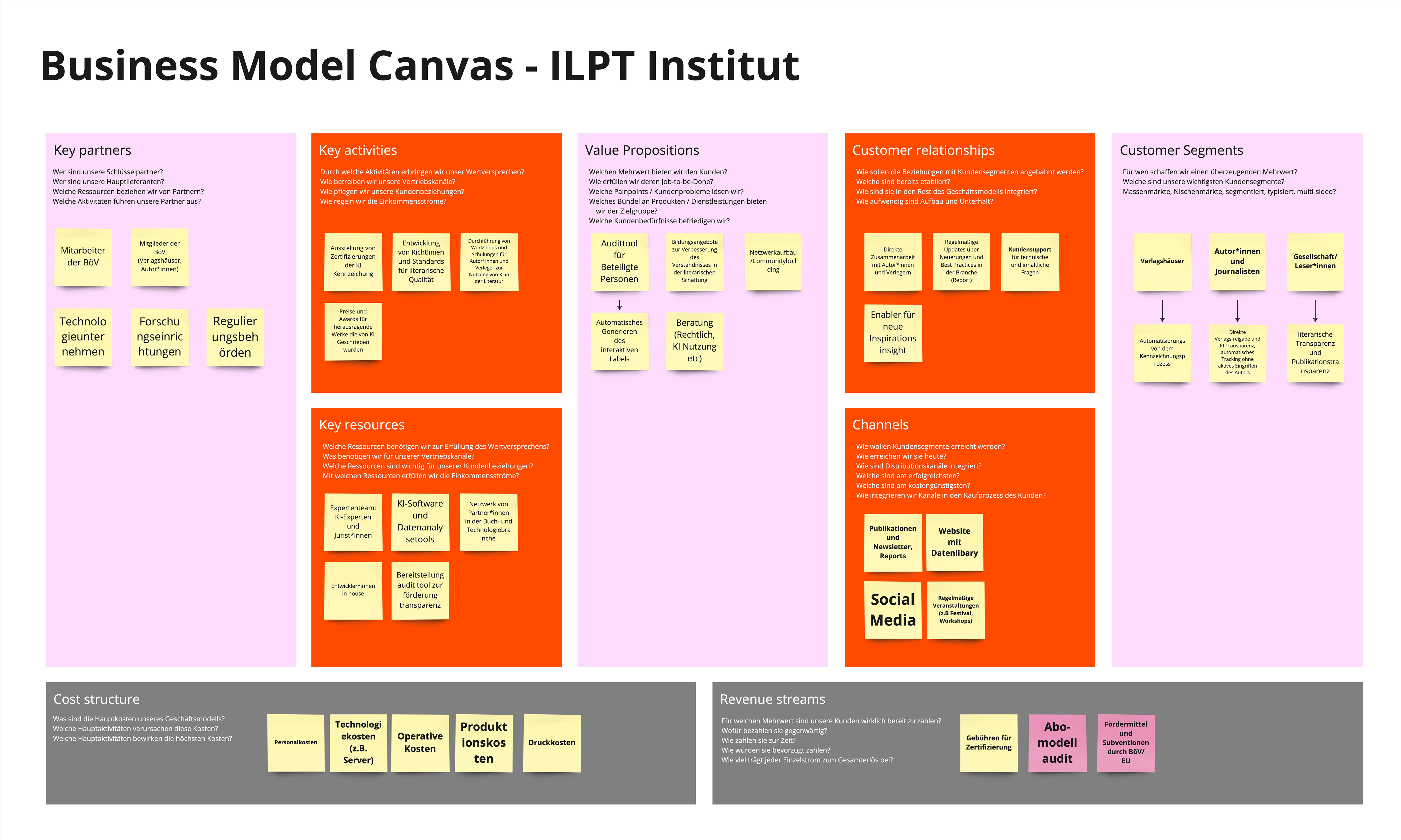 Key Partners: Die Schlüsselpartner des Instituts sind die MitarbeiterInnen und Mitglieder des Börsenvereins des Deutschen Buchhandels (BöV), Technologieunternehmen, Forschungseinrichtungen und Regulierungsbehörden.