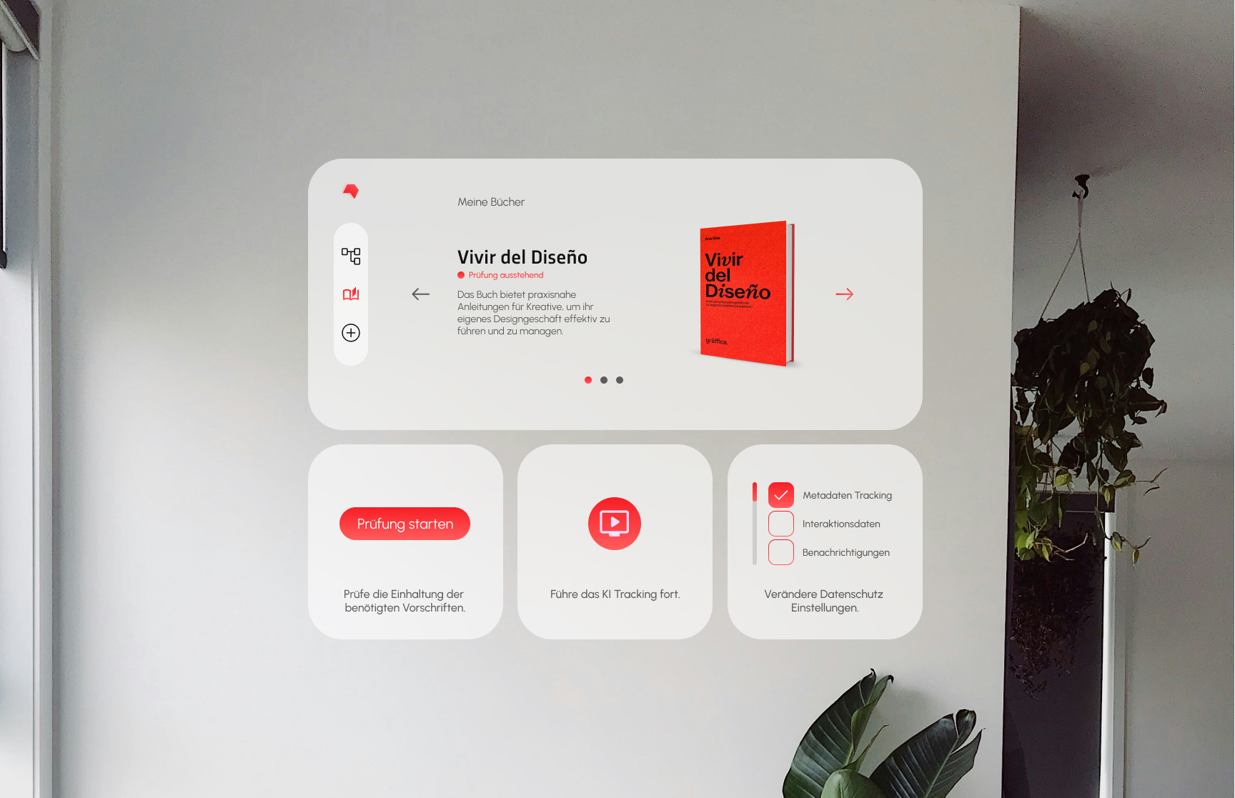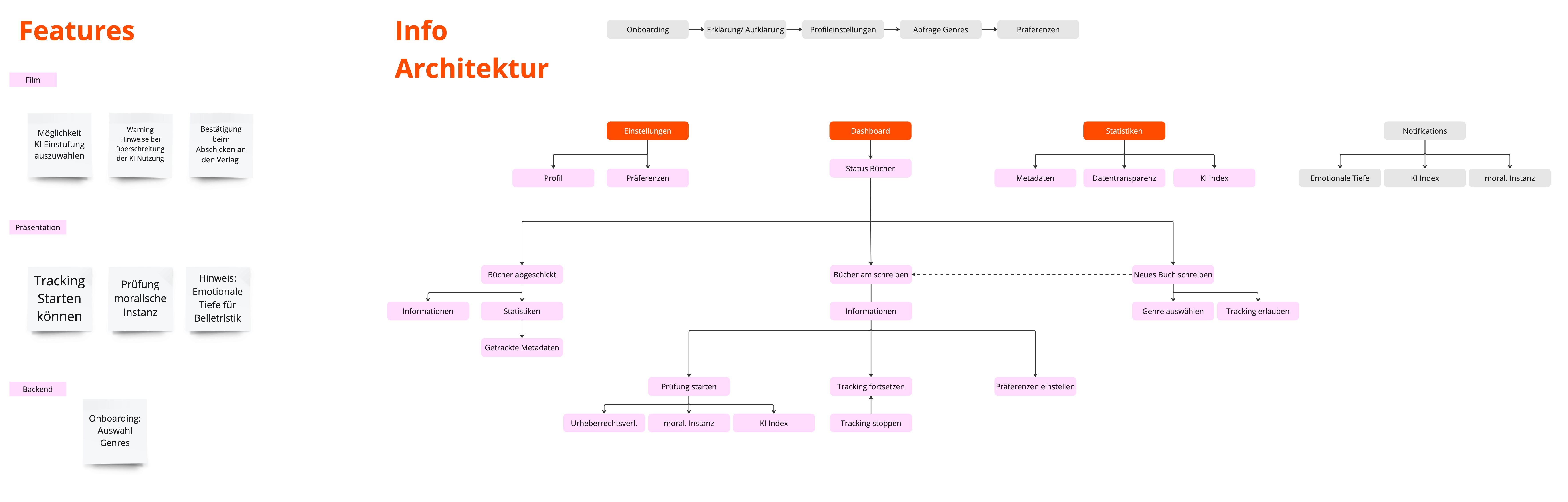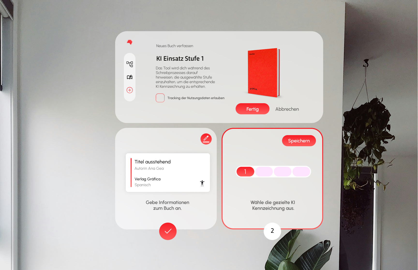Im Frontend haben NutzerInnen auf dem Dashboard des Audit-Tools die Möglichkeit, den Status verschiedener Bücher einzusehen. Hier können sie für jedes Buch Urheberrechtsverletzungen, die ethische Korrektheit und den KI-Index prüfen, das Tracking fortsetzen sowie Datenschutz- und Benachrichtigungseinstellungen anpassen. Außerdem können NutzerInnen ein neues Buch schreiben, Informationen dazu angeben und die KI-Kennzeichnung auswählen. Unter dem Reiter „Statistiken“ können sie verwendete Metadaten transparent einsehen. Während des Schreibens erhalten AutorInnen Hinweise, wenn die gezielte KI-Kennzeichnung überschritten wird. Die Hinweise variieren je nach Präferenz, und bestimmte Textstellen mit starker KI-Nutzung werden markiert. Während der Ideenfindungsphase gibt es Hinweise in Form von Benachrichtigungen.