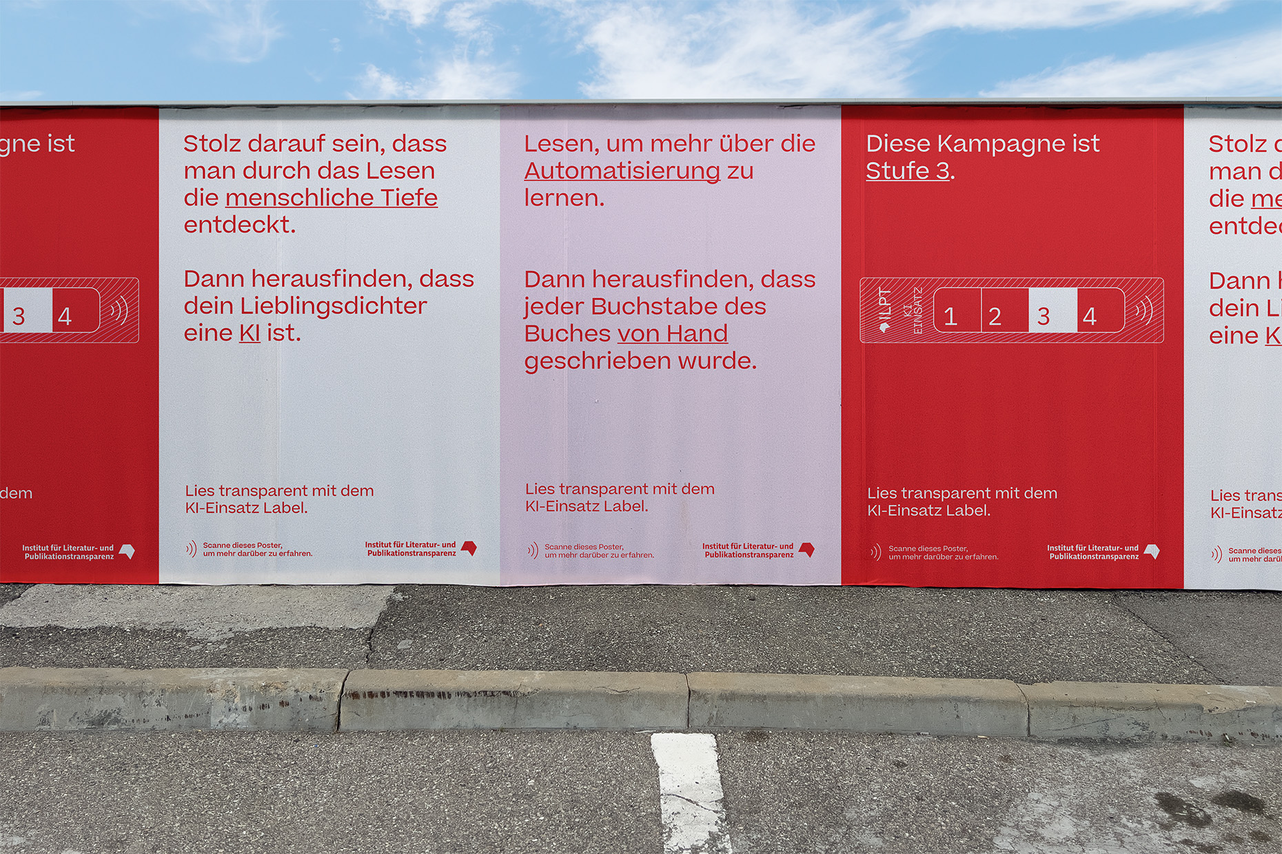 Die erste Kampagne ist kurz vor der Einführung der KI-Labels geplant. Die LeserInnen sollen durch provokante Fragen aufmerksam gemacht werden, die das Konsumieren von Inhalten mit dem Konsumieren von Lebensmitteln gleichstellen und Fragen aufwerfen. Der Slogan lautet: “Lies transparent mit dem Label”. Damit wird eine Aufforderung an die Gesellschaft ausgesprochen. Die Plakate sollen auf Billboards in Städten sowie auf Plakaten und Flyern in Buchhandlungen platziert werden.