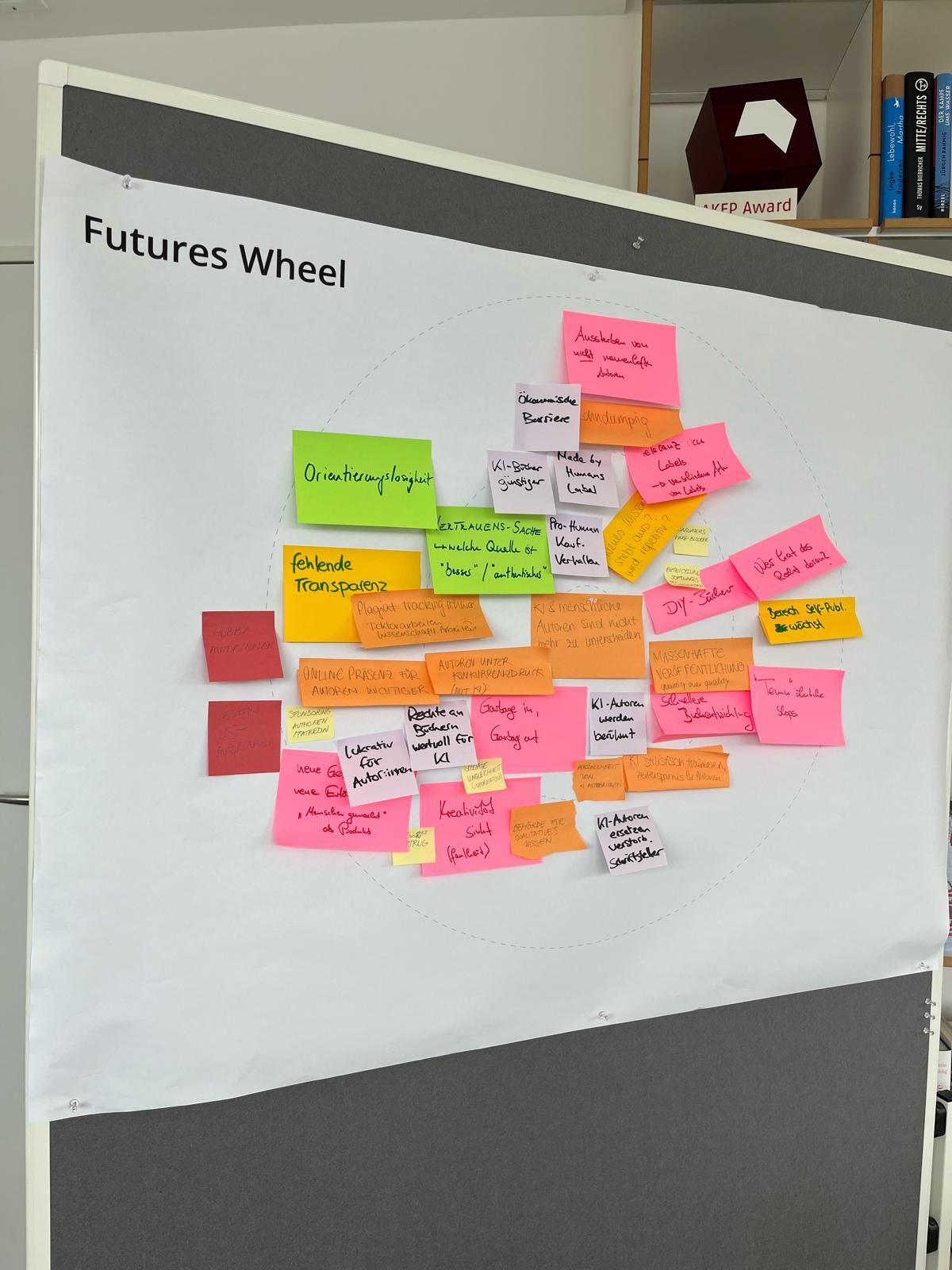 Während des Workshops entstanden durch die „Futures Wheels“, spannende „Name Its“ und erste Ideen. Zwei davon führten uns zu unserem Kernprojekt.