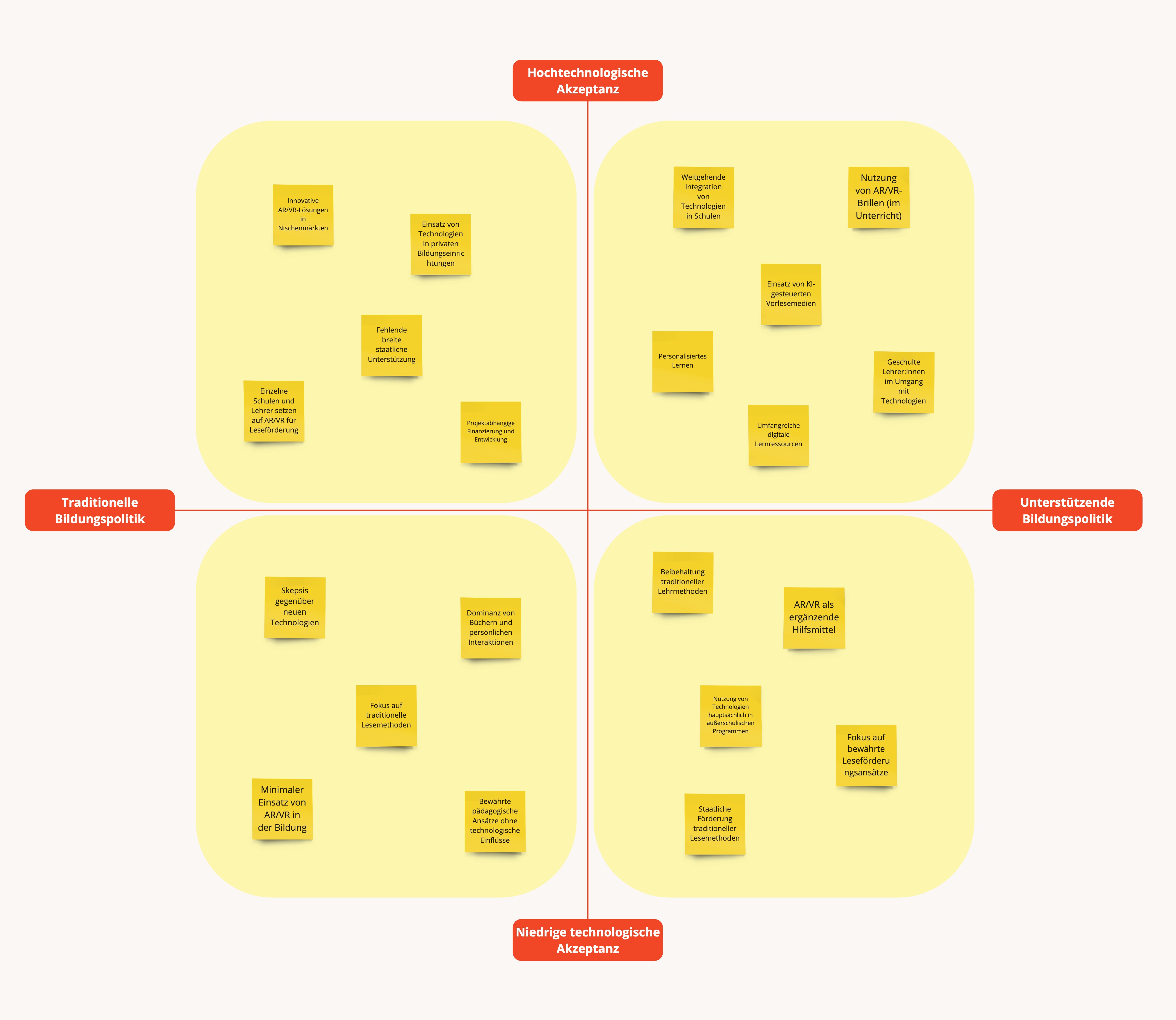 Nachdem wir durch die Zeitungsartikel eine klarere Vorstellung von der Zukunft gewonnen hatten, haben wir die ‘2x2-Szenarien’-Methode angewendet. Diese Methode ermöglicht die Kombination von jeweils zwei wichtigen Entwicklungen zur Schaffung von Szenarienräumen, die mit fundierten Erkenntnissen befüllt und näher charakterisiert werden. In diesem Zusammenhang werden Narrative entwickelt und unterschiedliche Zukünfte skizziert, welche mögliche Entwicklungen und ihre Auswirkungen aufzeigen.