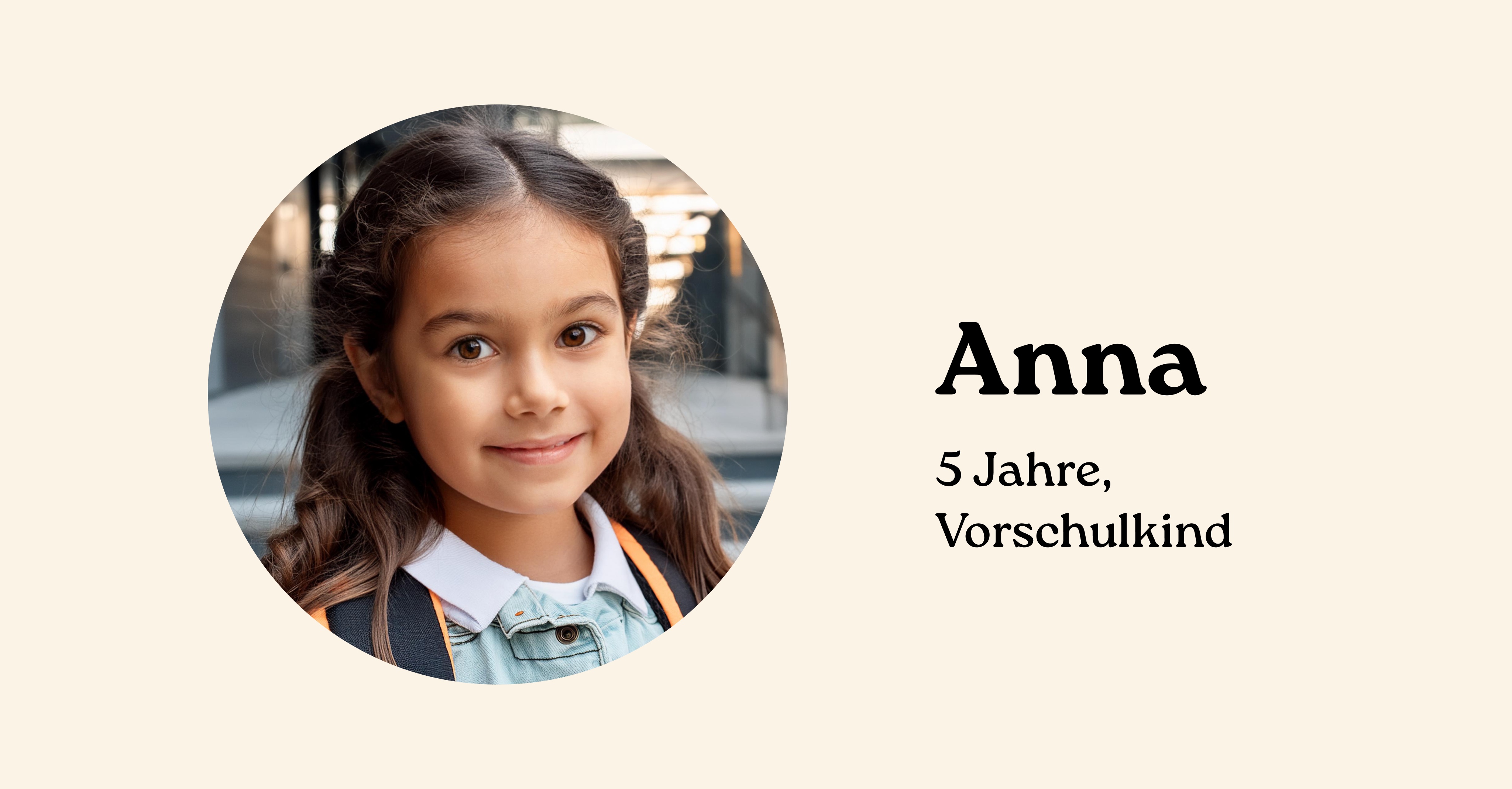 Anna ist ein fröhliches und neugieriges Vorschulkind. Sie lebt mit ihren Eltern und ihrem älteren Bruder in einer kleinen Stadt. Anna liebt es, Geschichten zu hören und mit ihren Freunden zu spielen. Besonders spannend findet sie es, wenn ihr Bruder ihr Geschichten vorliest oder wenn sie gemeinsam neue Abenteuer erfinden. Anna hat viele bunte Bilderbücher in ihrem Zimmer und verbringt viel Zeit damit, in diese Welten einzutauchen. Ihre Eltern lesen ihr allerdings sehr selten vor, deshalb hat Anna oft Schwierigkeiten alle Zusammenhänge zu verstehen, wenn sie sich die Bilderbücher alleine anschaut.