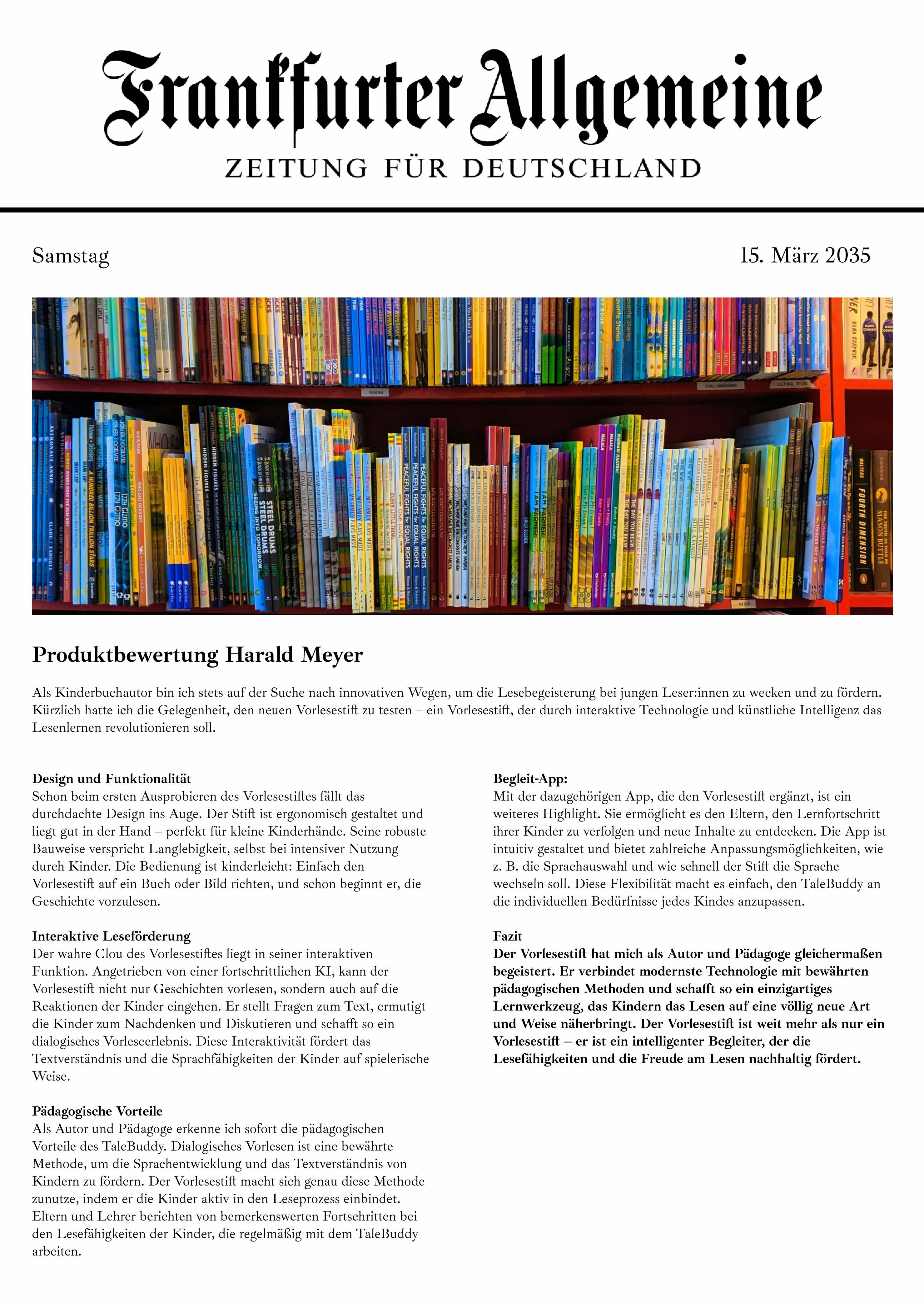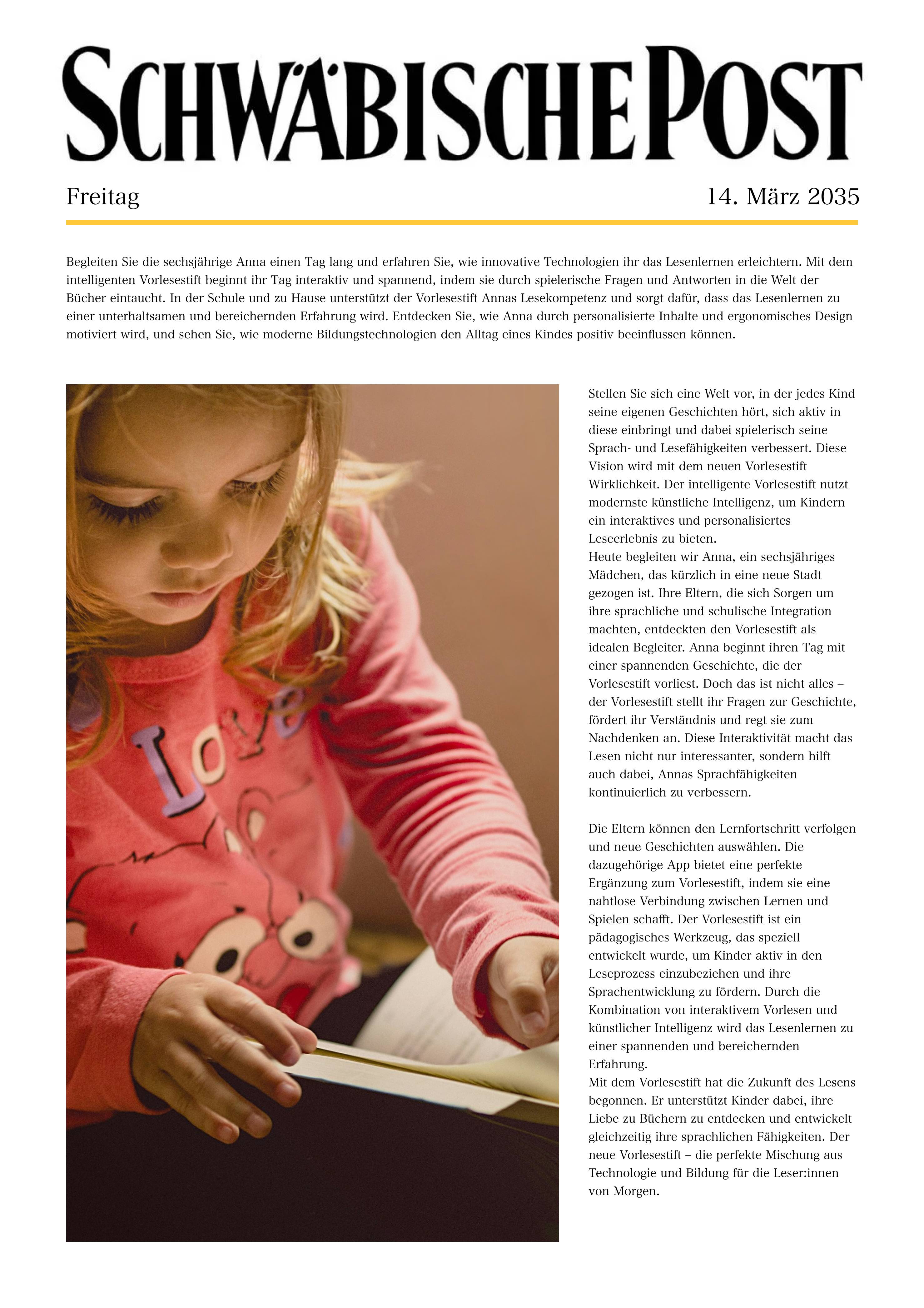 Anna ist 17 Jahre alt und steht kurz vor ihrem Schulabschluss. Sie hat sich entschieden, eine Laufbahn im Bereich der Sprachwissenschaften oder Literatur zu verfolgen. Der intelligente Vorlesestift hat ihr nicht nur beim Lernen geholfen, sondern auch ihre Leidenschaft für Sprachen und Geschichten geweckt. Anna beherrscht mittlerweile mehrere Sprachen fließend und plant, nach dem Abitur ein internationales Studium zu beginnen. Anna ist fest davon überzeugt, dass ihre Liebe zu Büchern und Sprachen ohne den Vorlesestift nicht so intensiv wäre.