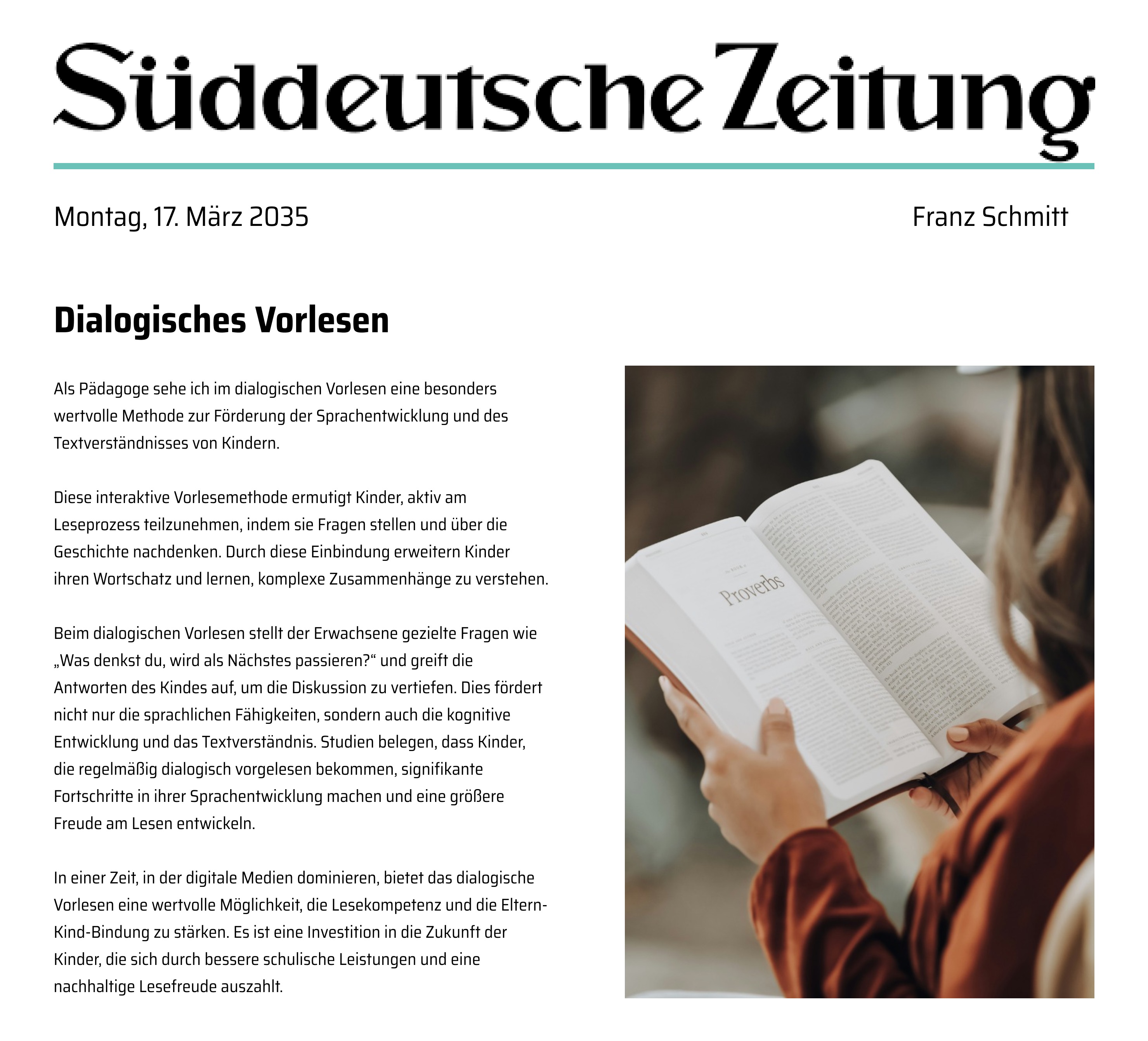 Im Jahr 2035 wird ein Tool mit integrierter Künstlicher Intelligenz das dialogische Vorlesen für Kinder als Unterstützung für die Eltern ermöglichen. Das Tool ist in der Lage, Geschichten vorzulesen, Fragen zu stellen, auf die Antworten der Kinder zu reagieren und sie in mehreren Sprachen zu fördern. Die Kinder erleben dadurch eine neue Form der Befriedigung ihrer Neugierde, des Eintauchens in kreative Geschichten sowie der Stillung ihrer Begierde nach neuem Wissen. Gleichzeitig erfolgt eine Vorbereitung der Kinder auf das Lesenlernen in der Schule sowie das Kennenlernen neuer Sprachen noch vor dem Schulbesuch.