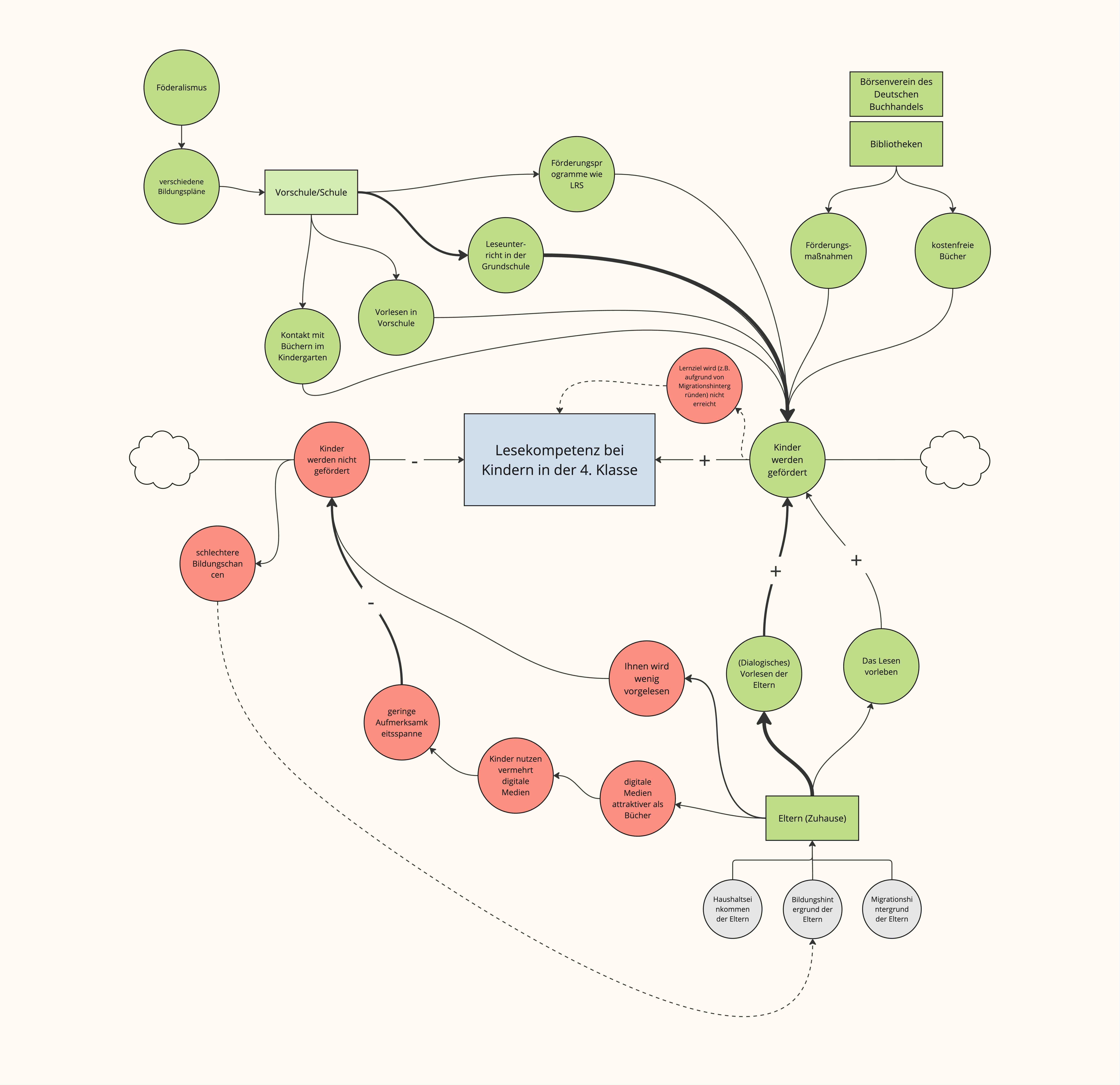 Institutionen wie BöV, Vorschule/Schule, Eltern und deren Bildungshintergrund sowie die gezielte Förderung von Kindern und Eltern standen im Mittelpunkt der Systemabbildung. Das Mapping zeigt deutliche Rückkopplungen zwischen den verschiedenen Faktoren. Beispielsweise können schlechte Bildungschancen dazu führen, dass Kinder weniger gefördert werden, was sich wiederum negativ auf ihre Lesekompetenz auswirkt. Gleichzeitig können Maßnahmen wie das Vorlesen im Kindergarten und spezielle Förderprogramme diese negativen Effekte abmildern.