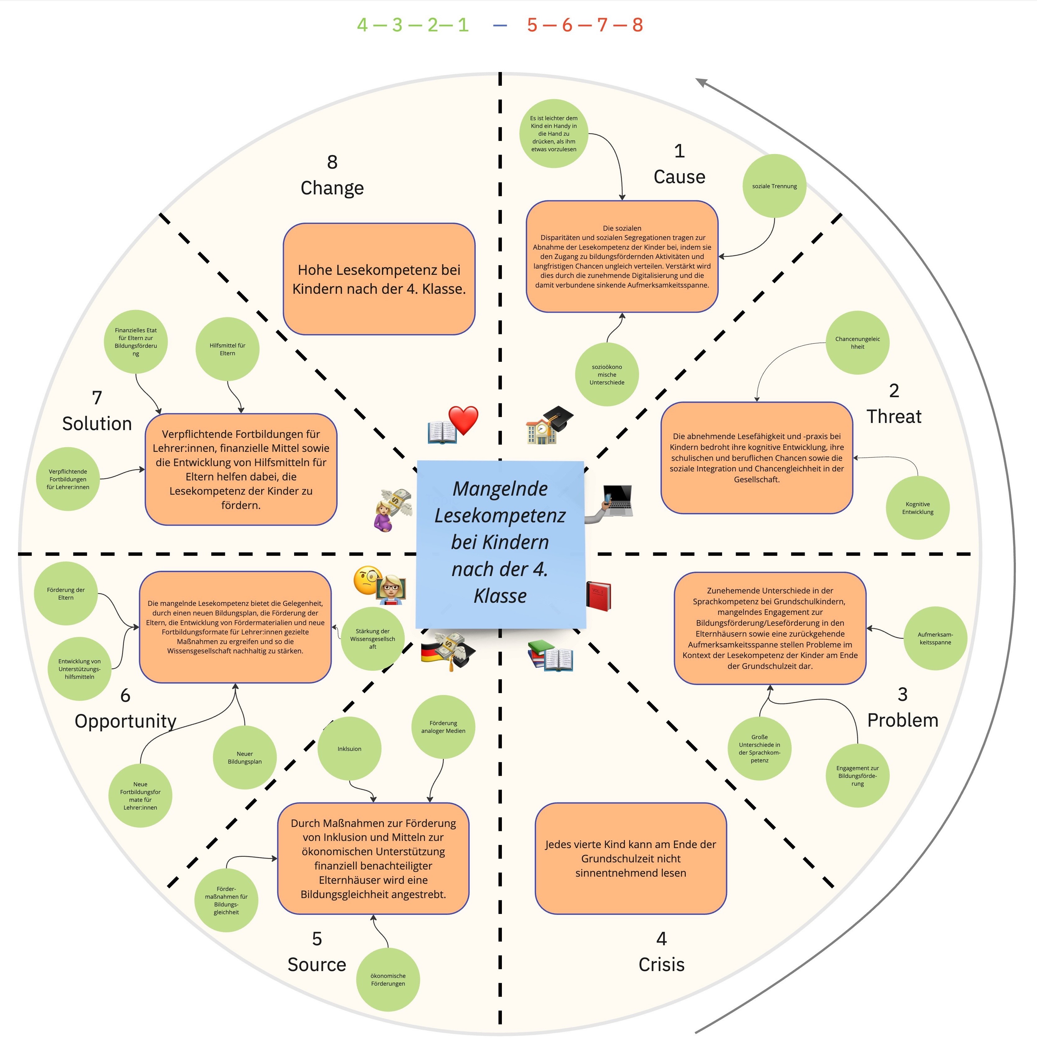 - Gelegenheit: Die mangelnde Lesekompetenz bietet die Gelegenheit, durch einen neuen Bildungsplan, die Förderung der Eltern, die Entwicklung von Fördermaterialien und neue Fortbildungsformate für Lehrer:innen gezielte Maßnahmen zu ergreifen und so die Wissensgesellschaft nachhaltig zu stärken.