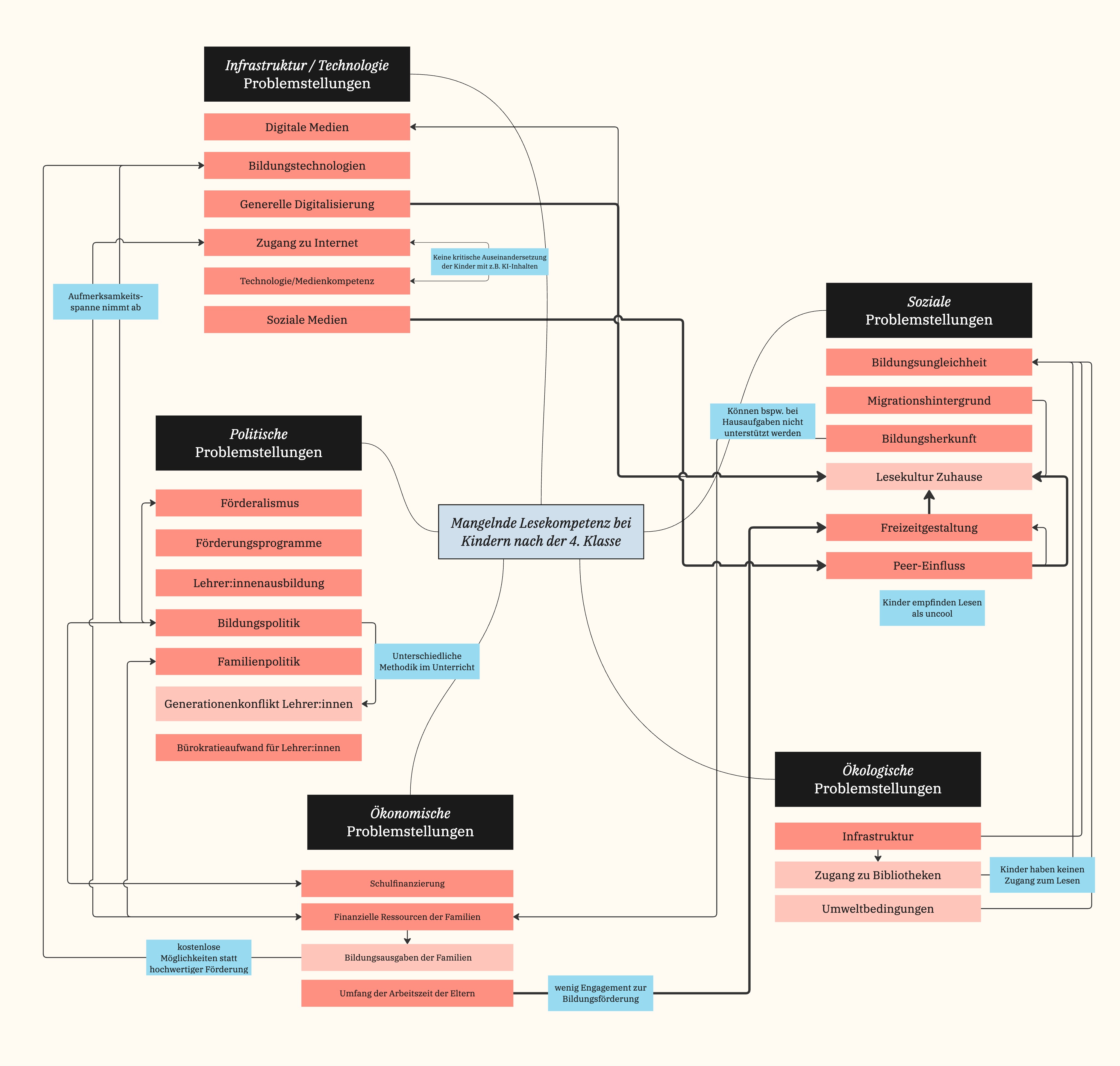 Im Rahmen eines Transformation Design Workshops im Wahlpflichtmodul an der HfG wurden die Auswirkungen und Dynamiken mangelnder Lesekompetenz untersucht. In diesem Workshop am Beispiel von Kindern nach der 4. Klasse. Dies war hilfreich um die Auswirkungen einer mangelnden Förderung von Vorschulkindern vor der Einschulung zu explorieren.