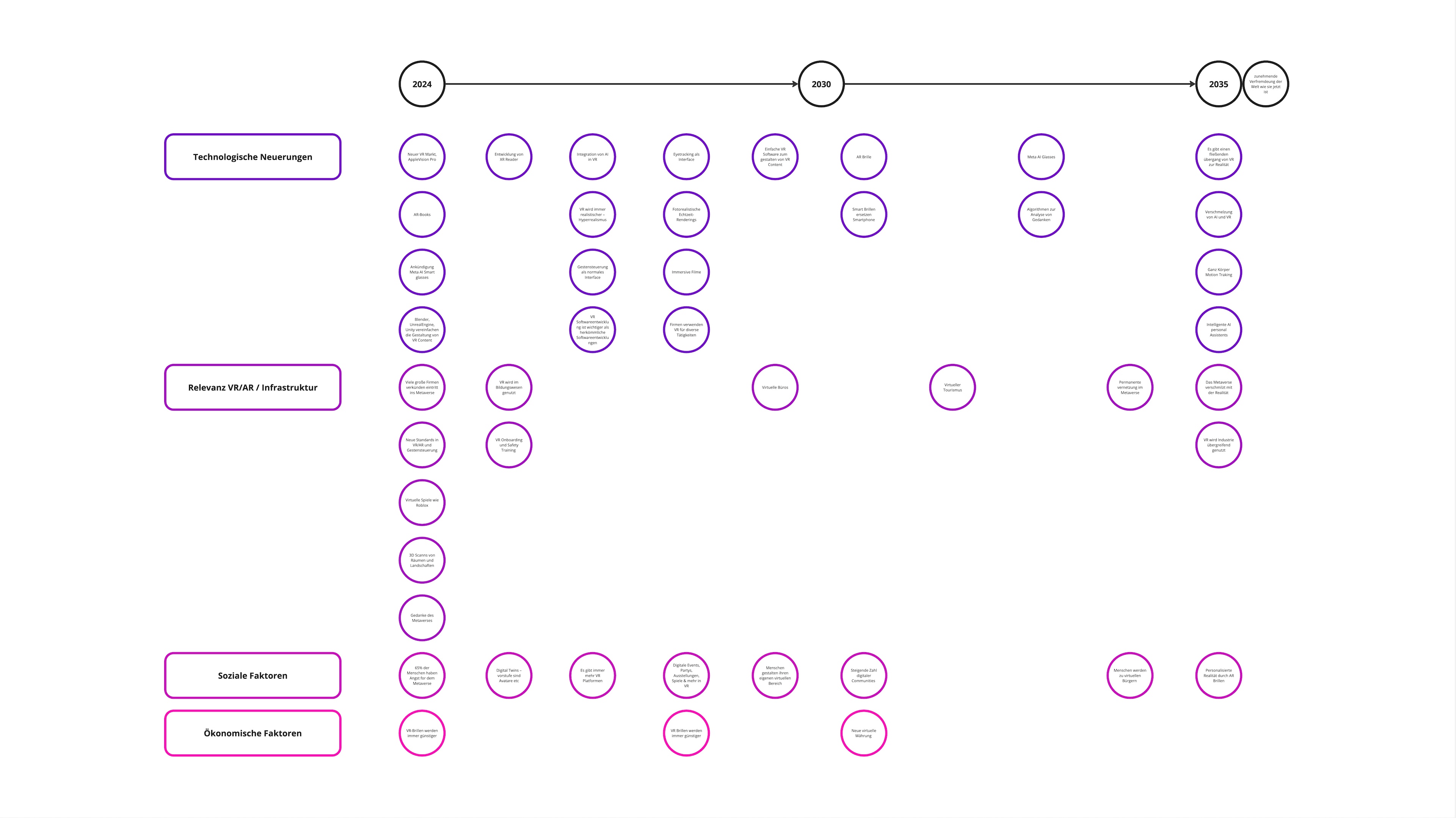 Im Jahr 2024 beginnen die Entwicklungen mit der Einführung von AR-Books und der Anbindung von Smart Glasses. Bis 2030 wird erwartet, dass immersive Filme und virtuelle Büros weit verbreitet sind. Im Jahr 2035 wird eine umfassende Infrastruktur für VR/AR geschaffen, die es ermöglicht, VR in verschiedene Lebensbereiche zu integrieren, einschließlich virtueller Tourismus und permanenter Überwachung durch Wearables.