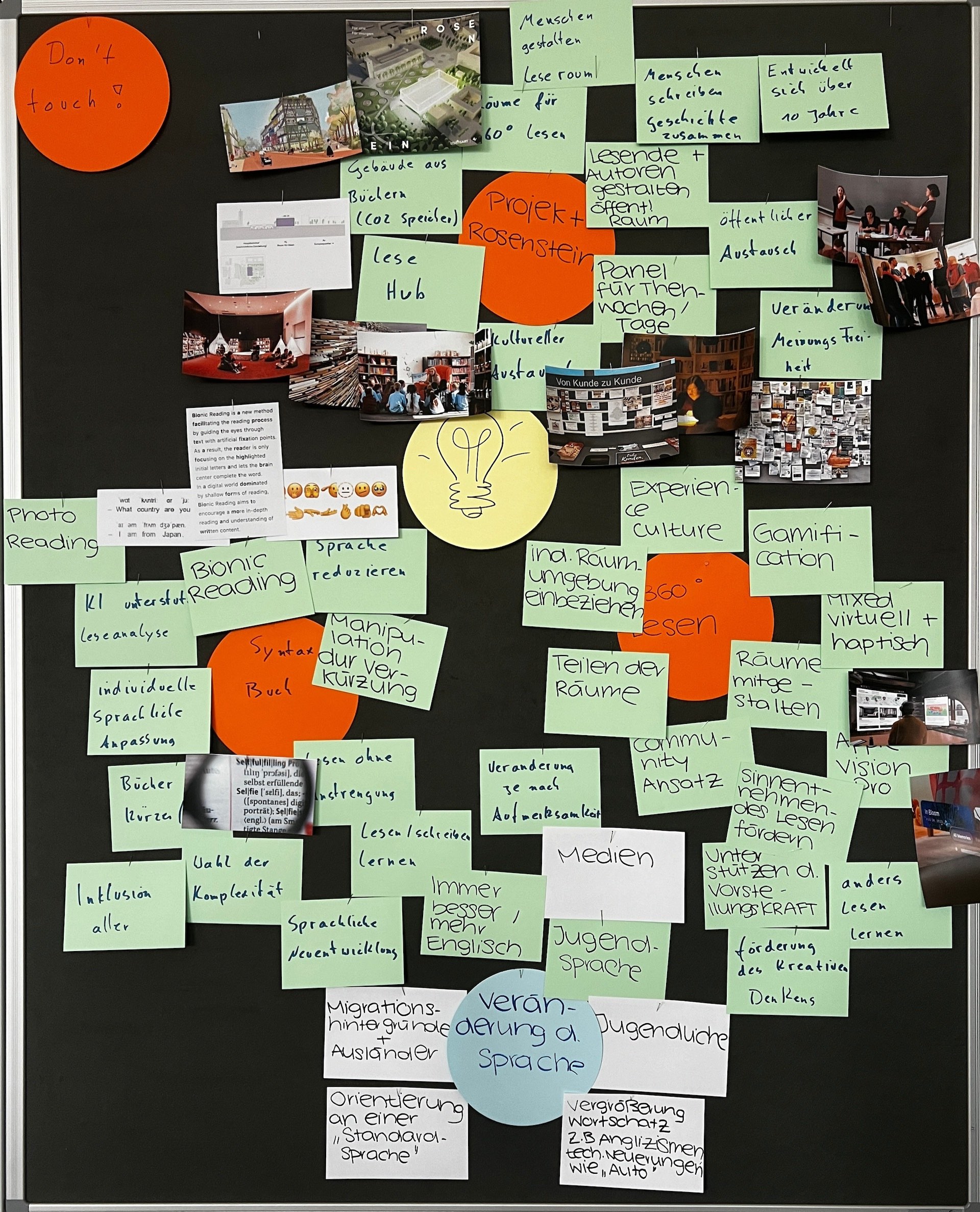 Ein weiterer wichtiger Bereich auf dem Ideenboard ist das Konzept des „360 Grad Lesens“. Diese Idee zielt darauf ab, das Leseerlebnis durch immersive Technologien zu erweitern. Mit „Mixed virtuell & haptisch“ wird die Kombination von physischen und virtuellen Leseerfahrungen vorgeschlagen, die es den Lesenden ermöglicht, in die Geschichten einzutauchen und sie aus verschiedenen Perspektiven zu erleben. Dieser Ansatz könnte durch die Schaffung von „Raum für 360° Lesen“ unterstützt werden, wo speziell gestaltete Räume das immersive Leseerlebnis weiter verstärken. Diese Räume könnten beispielsweise mit interaktiven Elementen ausgestattet sein, die das Verständnis und die Interaktion mit dem Text fördern.
