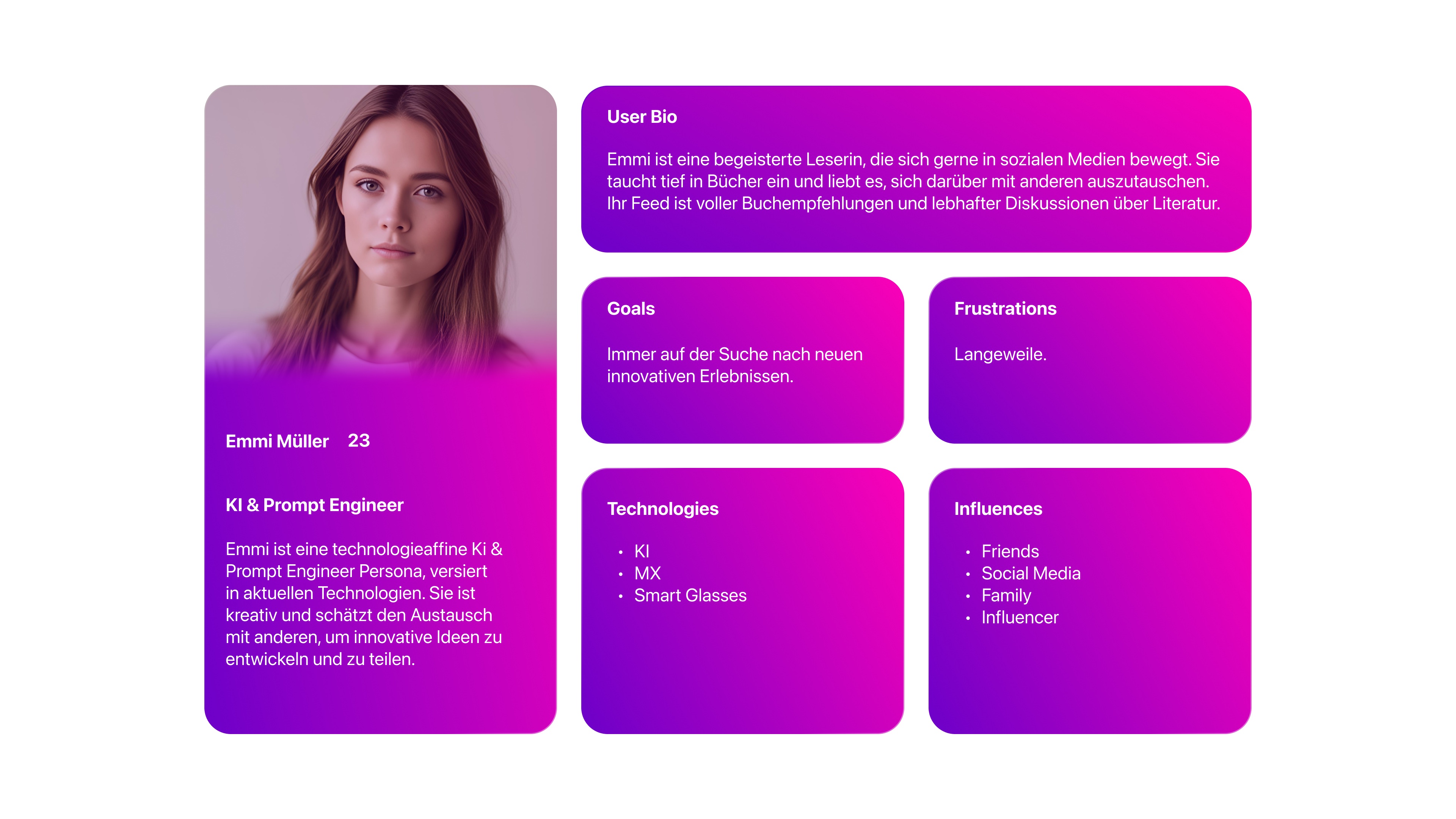 Emmi Müller ist eine 23-jährige KI & Prompt Engineer, die eine starke Affinität zu Technologie und sozialen Medien zeigt. Sie ist eine begeisterte Leserin, die es liebt, tief in Bücher einzutauchen und ihre Gedanken und Empfehlungen mit anderen auszutauschen. Ihr Social-Media-Feed ist voller Buchempfehlungen und lebhafter Diskussionen über Literatur.