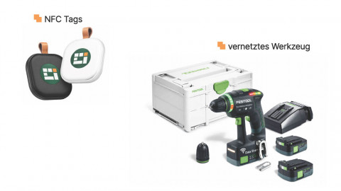 Beim Einschalten erkennt das vernetzte Werkzeug zuerst den Benutzer: Über NFC -Tags, die klein und unauffällig am Gürtel oder in der Hosentasche getragen werden. Es koppelt automatisch mit dem nächsten Tag und übernimmt die ID.