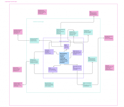 Durch diese Methode konnten wir erste Konsequenzen sichtbar machen, die sich von unmittelbaren Effekten wie neuen Infrastrukturansprüchen bis hin zu weiterreichenden Entwicklungen wie veränderten Arbeitsprozessen, wirtschaftlichen Modellen und gesellschaftlichen Rahmenbedingungen erstrecken. Die Ergebnisse dieser Analyse dienten uns als Orientierungspunkt, um das Themenfeld einzuordnen und darauf aufbauend weitere konzeptionelle Schritte im Projekt zu entwickeln.