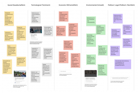 In einer frühen Projektphase haben wir eine STEEP-Analyse durchgeführt, um das Themenfeld rund um die Elektrifizierung von Baustellen systematisch zu erfassen. Dabei ging es weniger um konkrete Lösungen, sondern darum, die wichtigsten gesellschaftlichen, technologischen, wirtschaftlichen, ökologischen und politischen Einflussfaktoren sichtbar zu machen.
